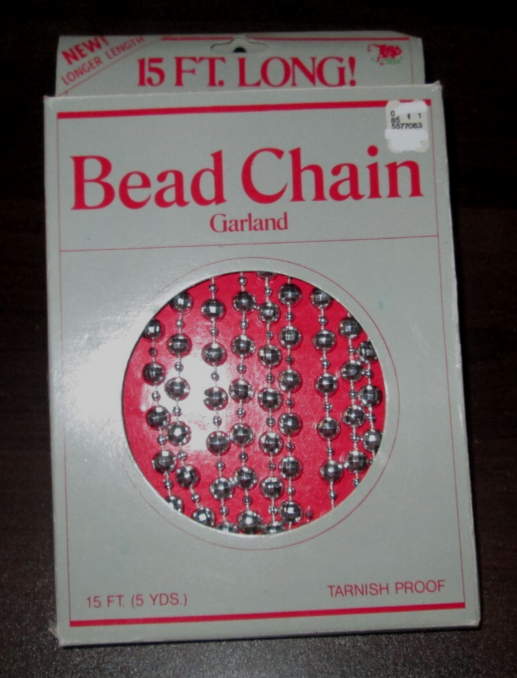 These two vintage Christmas garland from Kmart features a 15-foot long chain of silver decorative beads, perfect for adding a touch of festive elegance to your holiday decor. Made of plastic, this garland is suitable for use on a Christmas tree or as a stylish trim for a festive wreath or plant display. The silver color adds a classic touch to your seasonal decorations, making it a timeless addition to your home during the holiday season.