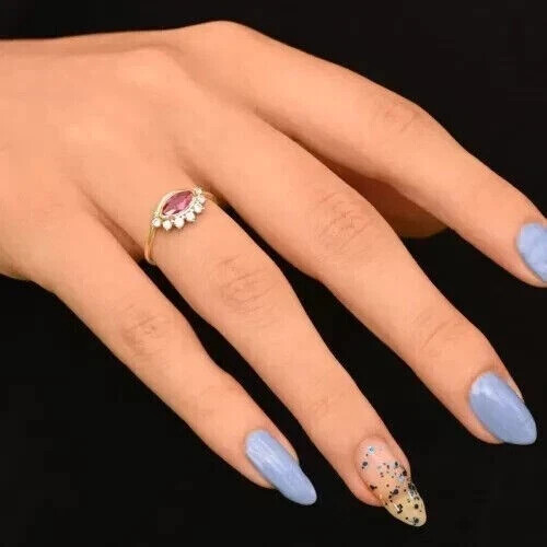 This product is a 2CT Marquise Lab Created Red Ruby Women Wedding Band Ring in 14K Yellow Gold Plated. It is a beautifully crafted ring with a floral pattern and engraved details, perfect for special occasions like anniversaries or birthdays. The ring features a marquise-shaped ruby as the main stone, complemented by sparkling diamonds on the sides. The yellow gold plating and sterling silver base add a touch of elegance to the design. This ring is a unique and stunning piece that can be personalized to suit your preferences. Made in the United States, it is a high-quality and eye-catching accessory for any woman's jewelry collection.