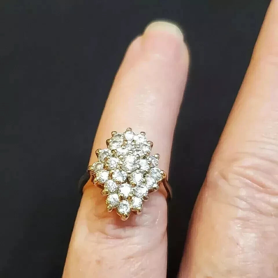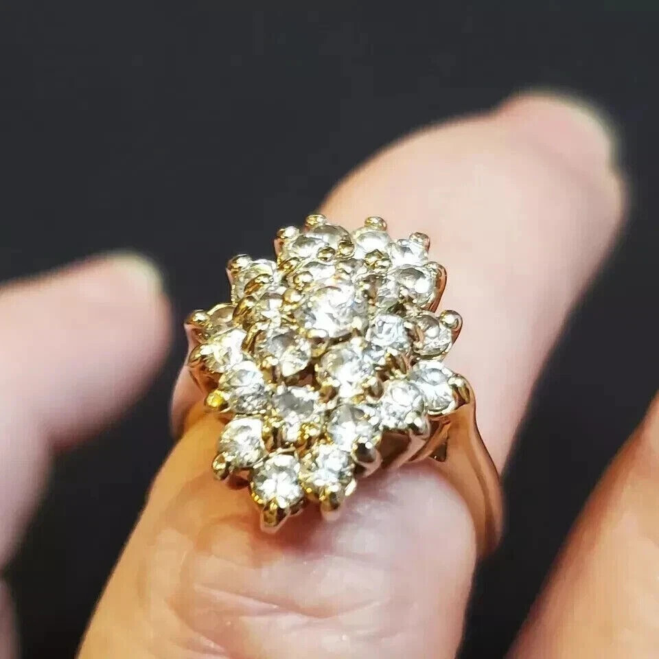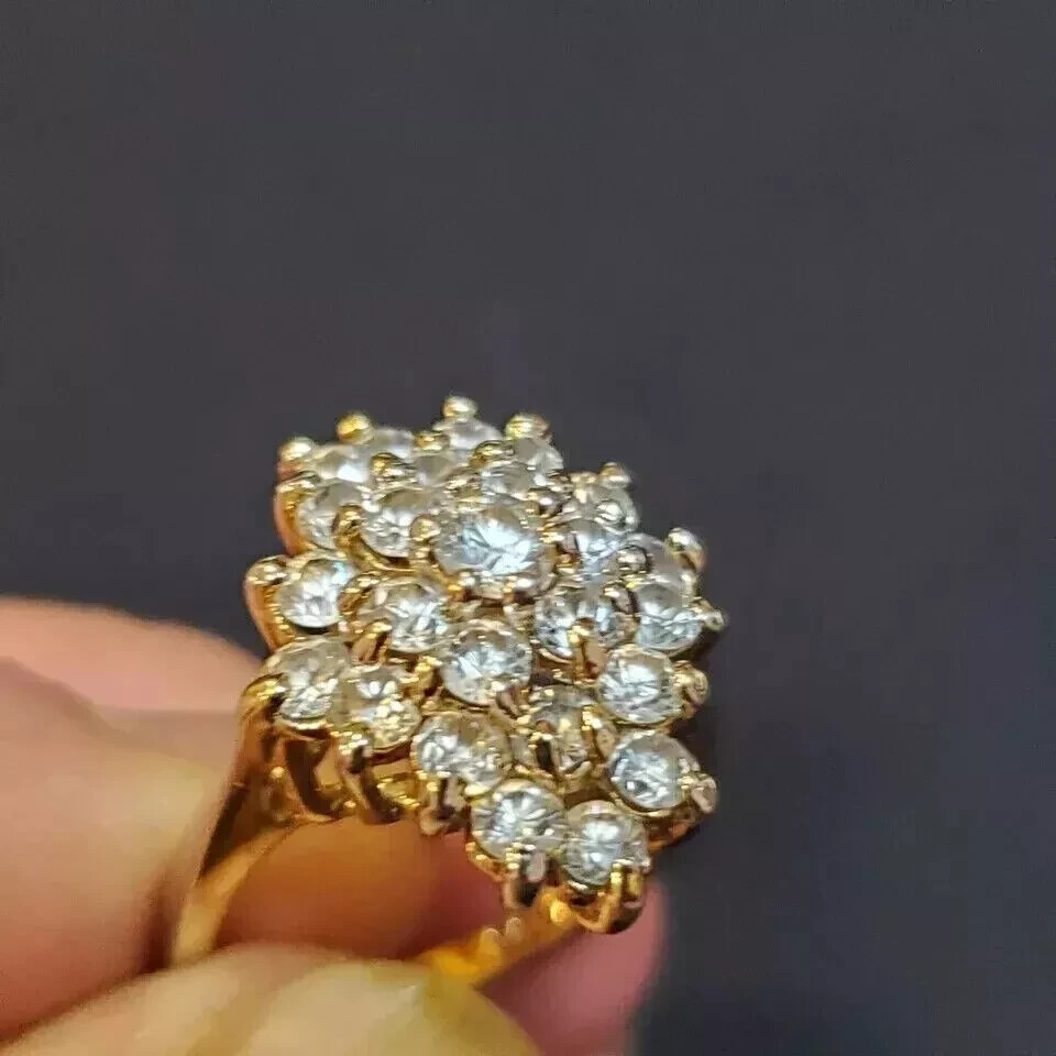 This 2CT Round Cut Lab Created Diamond Cluster Women's Ring is a stunning piece of jewelry perfect for various occasions like anniversaries, birthdays, and more. The ring features a round white lab-created diamond as the main stone with a cluster of secondary diamonds, set in 14K yellow gold plated sterling silver. The design includes floral patterns, engraved details, and a personalized touch, making it a unique and elegant choice for those looking for a special piece to add to their collection. Made in the United States, this ring exudes love and is sure to make a statement.