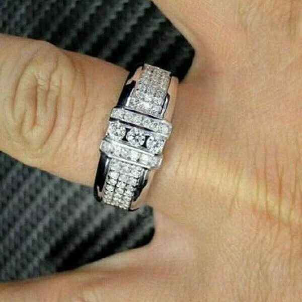 This product is a 2CT round lab-created diamond men's engagement band ring in 14K white gold plated. It is a unique and stylish ring perfect for various occasions such as anniversaries, birthdays, and special holidays. The ring features a floral pattern and engraved details, making it a personalized and meaningful piece of jewelry. Made with sterling silver, this ring showcases a flawless lab-created diamond with a fancy light intensity, symbolizing love and commitment. It is a handcrafted piece from the United States, offering a high-quality and elegant option for those looking for a special ring for their loved one.