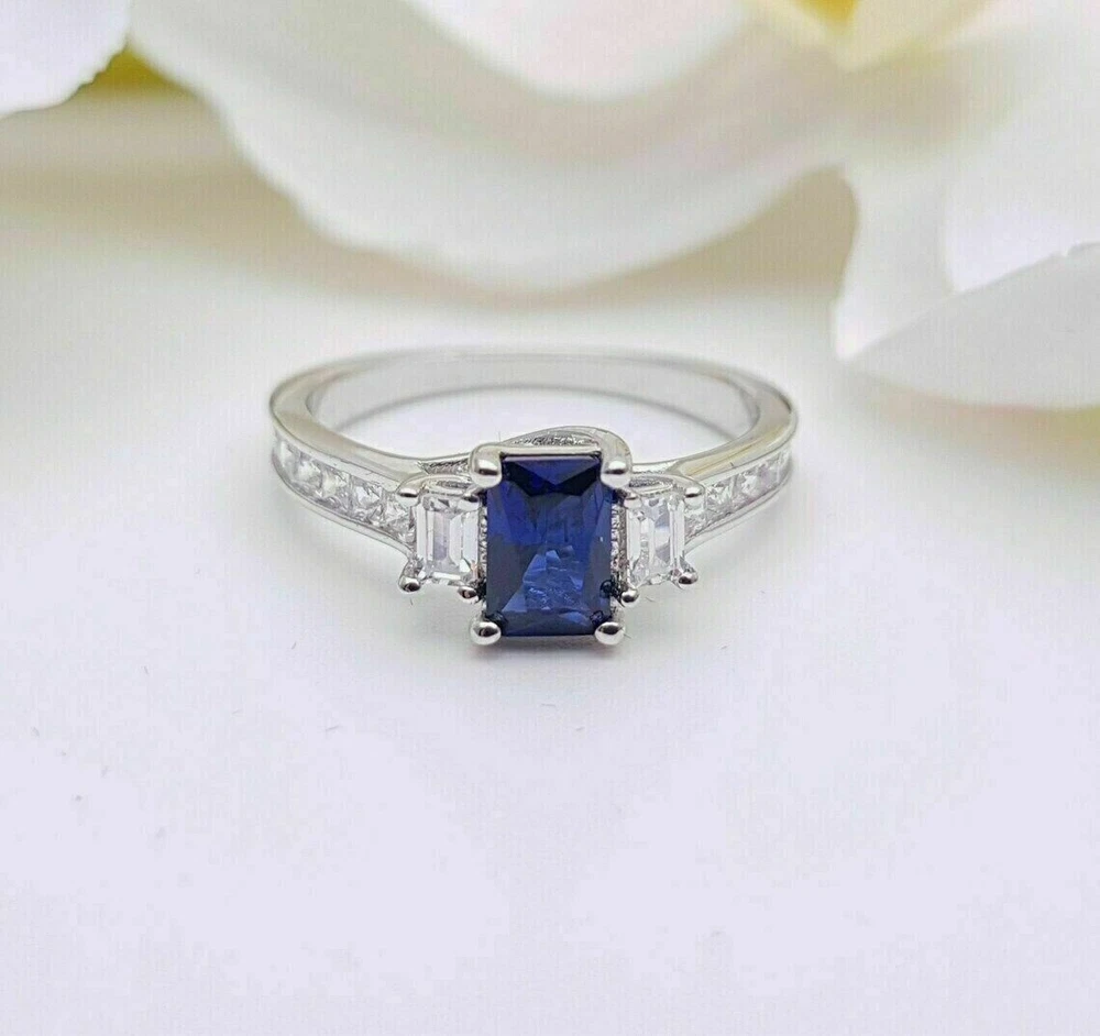 Number of Gemstones: 01 Customized: Yes Wholesale: Yes Occasion: Anniversary, Birthday, Christmas, Engagement, Father's Day, Graduation, Mother's Day, Valentine's Day, Wedding Sizable: Yes Setting Style: Prong Cut Grade: Excellent Secondary Stone: Simulated Diamond Metal Purity: 925 Color: White Antique: No Ring Size: All Size Available Theme: Beauty Main Stone: Simulated Sapphire Main Stone Shape: Emerald Type: Ring Main Stone Creation: Simulated Style: Band, Eternity Gemstone Clarity Grade: Slightly Included Material: Gemstone, Stone, metal Base Metal: White Gold Plated Country of Origin: India Personalization Instructions: As per your requirement we can change the over layer color Vintage: No Era: Undated MPN: NA UPC: Does Not Apply Handmade: Yes gtin13: Does Not Apply Features: Engraved Signed: No Shape: Round Seller Warranty: Yes Brand: sp_jewels Materials sourced from: Unknown Personalize: Yes Metal: Sterling Silver Main Stone Color: Blue