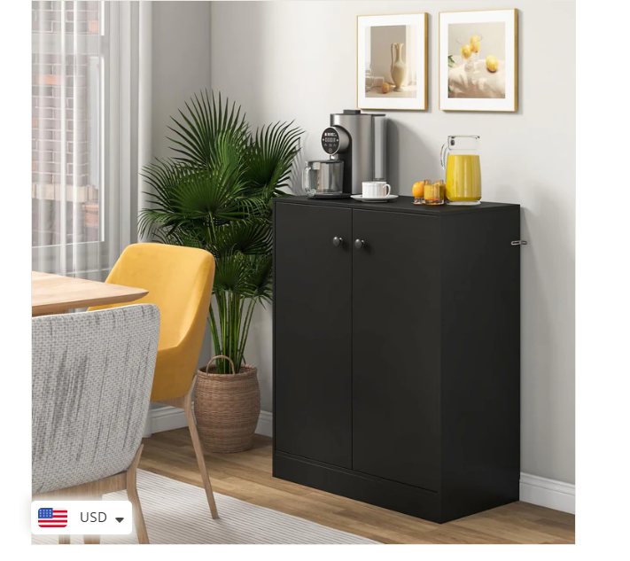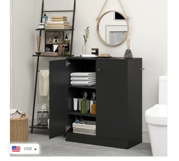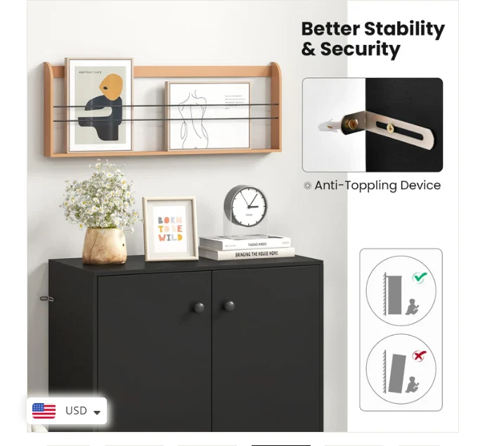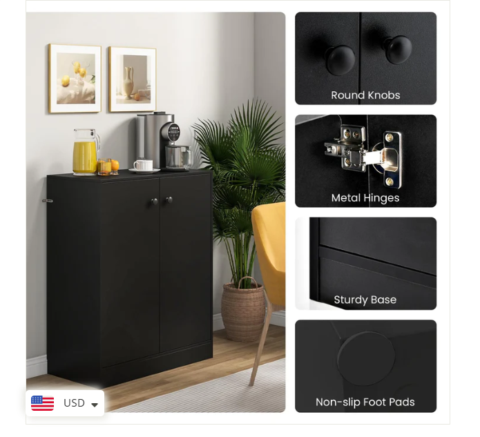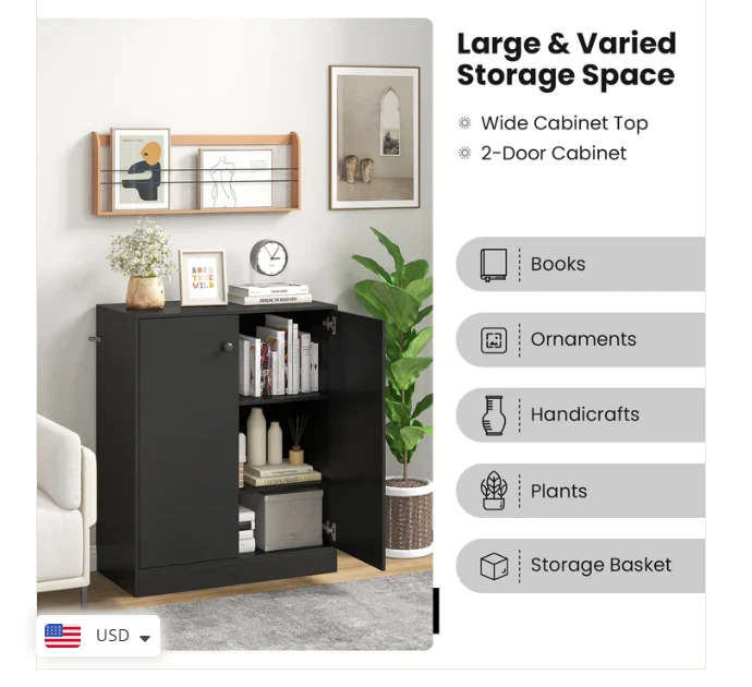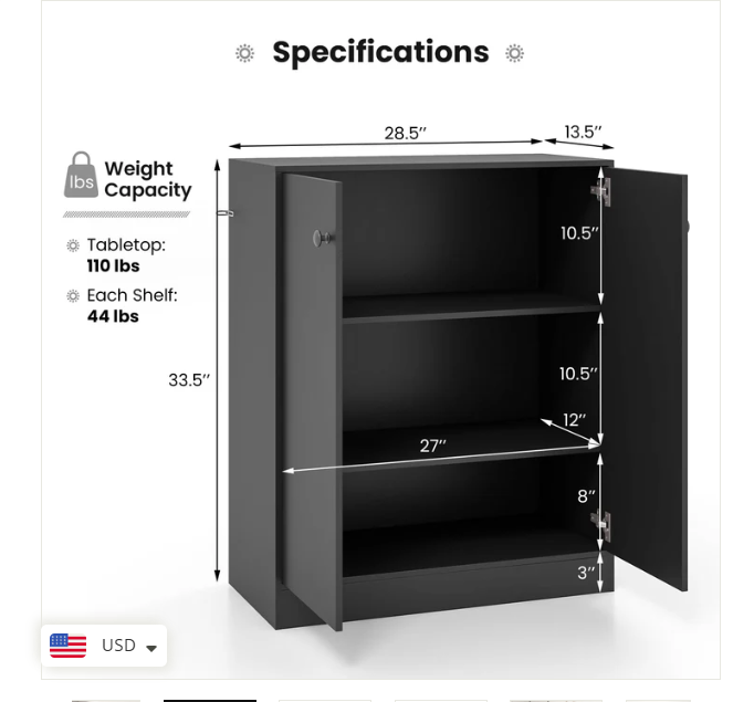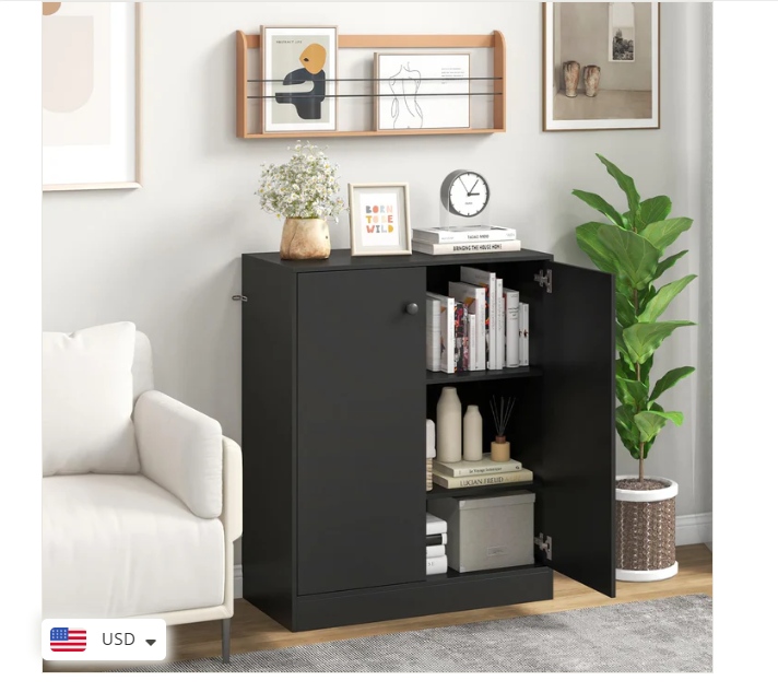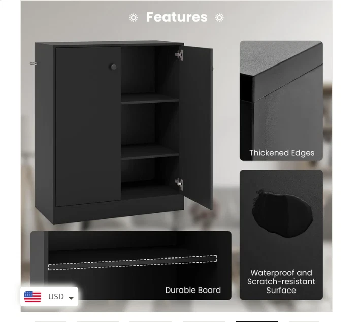 2 Door Storage Base Cabinet - Freestanding Floor Cabinet with 3-Tier Shelf - Black Large Storage Space: This storage cabinet with two doors can keep your items clean and dry. The 3-tier inner shelf provides ample storage space and allows you to classify different items. Plus, the spacious top is a good place to showcase artwork, potted plants, photos and more. Anti-toppling Device & Non-slip Foot Pads: To further improve safety and stability, our floor cabinet is equipped with anti-toppling fittings to fix it to the wall. Non-slip foot pads effectively prevent the floor from being scratched. This freestanding cabinet can hold a total of 242 lbs without wobbling. High-quality Materials: Made of high-grade MDF and engineered wood, this storage cabinet has excellent hardness and sturdiness that will serve for many years to come. In addition, the base cabinet has flexible hinges and smooth round knobs. Modern & Simple Design: This simple yet stylish storage organizer will be a modern focal point in your home, which fits perfectly with the rest of your furniture and decor. Whether in the living room, entryway, kitchen, office, it is sure to be a practical and eye-catching addition. Easy to Assemble & Maintain: Thanks to the detailed instructions and all the accessories in the package, you are able to easily put this 2-door storage cabinet together. Better yet, the surface is smooth and flat, which requires very little cleaning and maintenance in daily life. Overall Dimension: 28.5" x 13.5" x 33.5". Description: If you are looking for a versatile storage cabinet, this 2-door floor cabinet would be worth considering. More than a storage cabinet, you can use it as a display cabinet to put storage basket, handicrafts or as a cupboard to store kitchen supplies. Besides, high quality board makes this cabinet sturdy and durable for long-term use. 2 Anti-toppling kits can be seen at the side of the cabinet, which effectively get rid of falling, wobbling and tilting. This multifunctional storage cabinet is perfect for different decor styles or purposes. Features: Wide top & 2-door cabinet meet different storage needs The enclosed cabinet is designed to prevent dust Crafted of thickened and durable board for long-lasting use Non-slip foot pads protect the floor from damaged Equipped with anti-toppling device for added stability Modern design exudes a high-end and elegant feel Equipped with knobs and metal hinges for convenient use Suitable for living room, kitchen, dining room, bathroom or entryway Water and scratch-resistant surface for easy clean-up Easy to install according to the detailed instruction Specifications: Material: Engineered Wood, MDF Overall Dimensions: 28.5” x 13.5” x 33.5”(L x W x H) Shelf Dimensions: 27” x 12”(L x W) Height Between Each Shelf: 10.5”, 10.5”, 8” Baseboard Height: 3” Weight Capacity of Tabletop: 110 lbs Weight Capacity of Each Shelf: 44 lbs Net Weight: 56.5 lbs Package Includes: 1 x 2-Door Cabinet 1 x Instruction Why You Choose Our 2-Door Storage Cabinet? √Wide top and 2-door cabinet keep daily items organized. √2 Anti-toppling kits account for reliable structure.