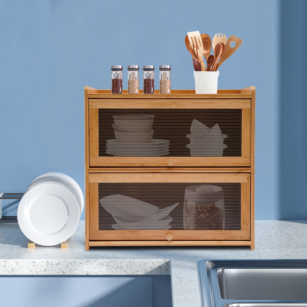 This storage cabinet is a game-changer for small spaces! The sturdy bamboo construction and strong acrylic doors hold up to 99 lbs, perfect for organizing kitchen essentials, bathroom supplies, or office clutter. Love the smooth-opening doors with built-in stoppers—no more slamming. Compact yet spacious, it looks sleek on any countertop while keeping everything neatly tucked away. Highly recommend for an instant organization upgrade!