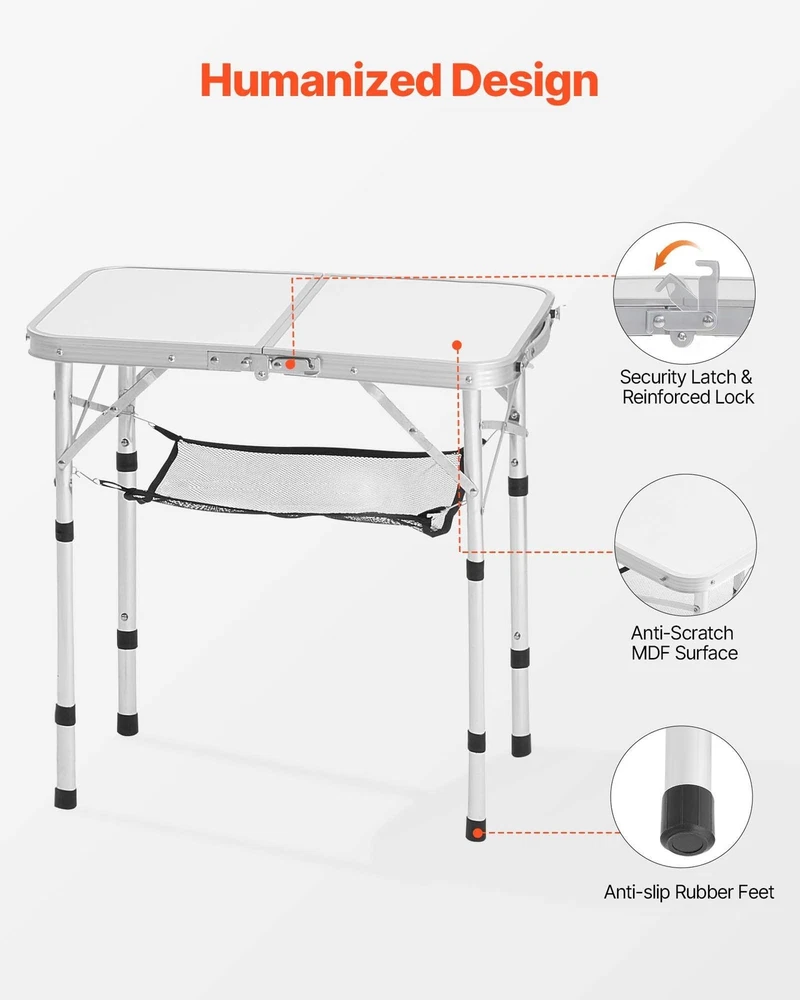 Featu res : Three-Stage Height: The camping table adapts to various occasions with three-stage height adjustment: 10.2/18.9/23.6 inch via adjustable legs. 23.6x15.7 in tabletop seats 2-4 adults, ideal for intimate dinners, gatherings, or light work MDF Surface: The scratch-resistant MDF tabletop offers a smooth, elegant finish ideal for casual indoor gatherings or outdoor. The folding camping table supports up to 66 lbs while resisting minor impacts and daily wear Secure Locking & Portable: Dual latches and reinforced leg locks help keep the small outdoor table stable, reducing the risk of accidental collapse. Foldable design with built-in handle allows easy transport-fits car trunks or closets Foldable Design: Foldable with a built-in handle for easy transport and storage. Sets up/folds down in seconds-no complex assembly. Compact size makes it ideal for on-the-go use Wide Application: Ideal for outdoor and indoor use. It's suitable as a patio table, laptop table, dining table, picnic table, beach table, or BBQ table. You can take the side table to travel wherever you want.