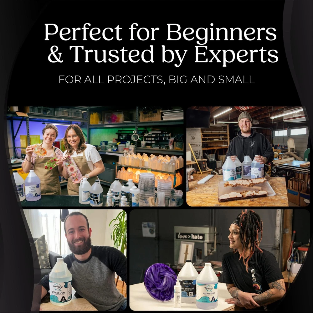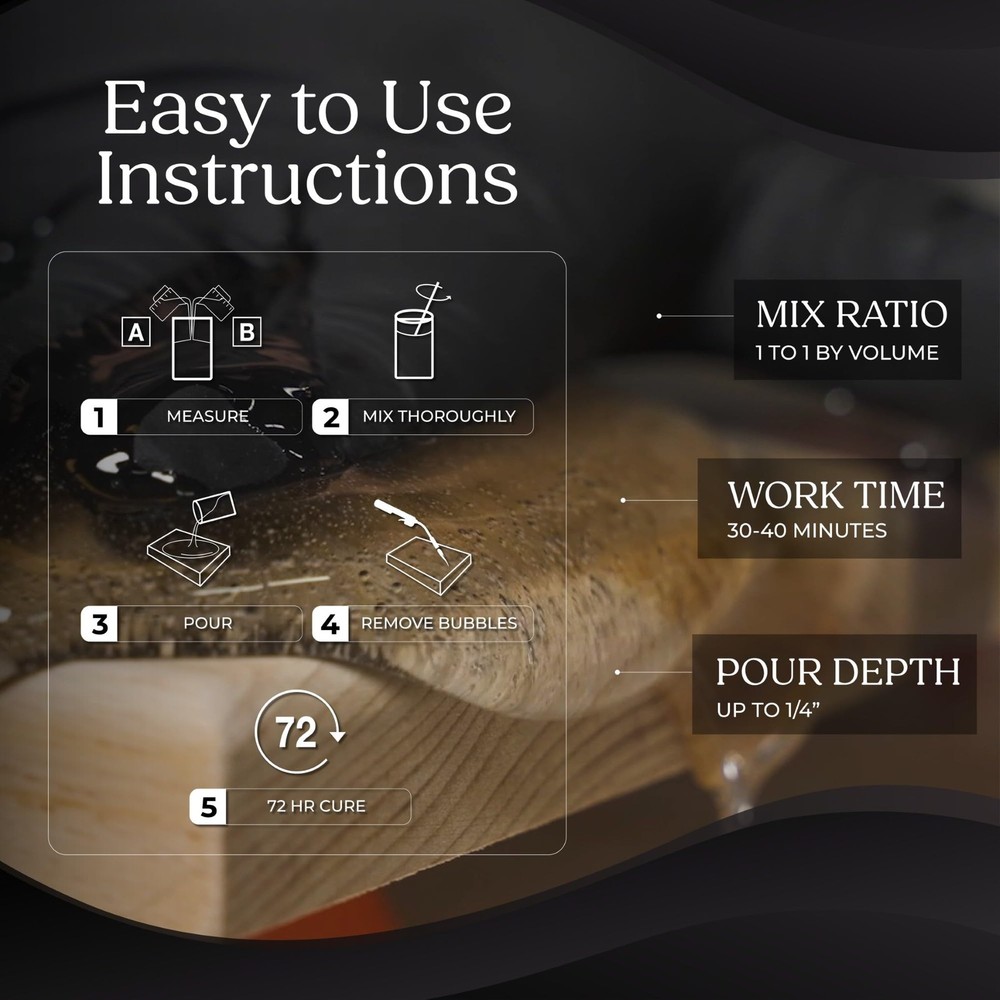 Unleash your creativity with our High-Gloss Crystal Clear Epoxy Resin! Craft stunning Table Tops, Bartop, craft table, Wood finishes, See-Through Encapsulations, and Artwork that's only limited by your imagination. Our unique Epoxy formula guarantees bubble free epoxy resin, easy application, and a clear finish. We're dedicated to quality because we use the best ourselves! Once cured, our epoxy is Safe and Low Odor, thanks to our USA manufacturing. Say goodbye to wasted time and money on uneven or discolored epoxy. We've done the hard work for you! With High Gloss and UV resistant epoxy, this is a self leveling epoxy resin, making your creative projects shine. Rest easy knowing our epoxy forms a Tough, Water-Resistant Coating that we specialize in. Expert customer support is here to guide you, from bartops to tabletops, jewelry, river table, resin coasters, and more. Embrace your creativity with epoxy resin, elevate your craft with our epoxy resin kit, and bring your artistic visions to life. Invest in the best and see your projects come alive with our High-Gloss Crystal Clear Epoxy Resin. Easy Application Process - Enjoy the simplicity of a 1:1 mixing ratio with our epoxy resin kit, perfect for both beginners and experienced DIY enthusiasts. This user-friendly kit is a must-have addition to your resin art and craft projects. Food-Safe Epoxy Resin - Our epoxy resin is food-safe when fully cured, making it an excellent choice for kitchen table tops, bar tops, and other food surfaces. Compatible with wood and metal, it ensures flawless clarity in your artistic ventures. Self-Leveling Epoxy - Say goodbye to uneven pours with our self-leveling epoxy resin. Ideal for bartops, craft tables, countertop epoxy, and more, our resin guarantees a sleek, high-gloss finish. Crystal-Clear Finish - Unleash your creativity with our epoxy resin's crystal-clear, high-gloss finish. Add a touch of sophistication to your tabletops, resin crafts, and more. Water-Resistant and Durable - Protect your resin art and home décor from moisture damage with our water-resistant epoxy resin. Designed for daily use, it offers long-lasting protection and maintains the pristine condition of your projects. American Made Quality - brings over 40 years of experience in epoxy resin craftsmanship, proudly based in the USA. Our focus on quality and formula perfection sets our products apart.