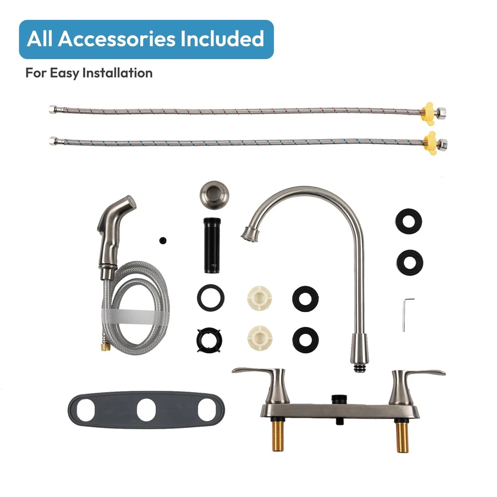 Brushed Nickel Kitchen Faucet – a perfect blend of style, functionality, and durability to elevate your kitchen experience. Crafted from premium 304 food-grade stainless steel, this faucet guarantees not only a sleek and modern appearance but also enduring performance. Enjoy the convenience of the 360-degree swivel spout, providing extensive coverage for food preparation and cleanup. The user-friendly 2-handle design ensures precise control over hot and cold water, making daily tasks a breeze. Enhance your kitchen's versatility with the matching side sprayer, offering flexibility for efficient cleaning and food preparation. The thoughtful design, coupled with easy installation for 3-hole, 8-inch configurations, makes this faucet a seamless addition to any kitchen. Invest in quality and style with our Brushed Nickel Kitchen Faucet – a perfect fusion of aesthetic appeal and functional excellence. Upgrade your kitchen with this durable and sophisticated fixture that effortlessly combines form and function. Premium Material: Food-grade 304 stainless steel, rust and corrosion-resistant. Brushed nickel finish, anti-fingerprint. Lead-free brass cartridge, leak-proof. 360° Swivel Spout: Wide sink coverage, smooth rotation for easy food prep and cleanup. 2 Handle Control & Soft Flow: Separate hot and cold handles, precise water flow. ABS aerator for gentle, splash-free stream. Pull-Out Side Sprayer: Extends up to 32 inches, flexible cleaning, powerful rinsing. Easy Installation: Fits 3 or 4-hole, 8-inch sinks. Includes quick installation tool for hassle-free setup.