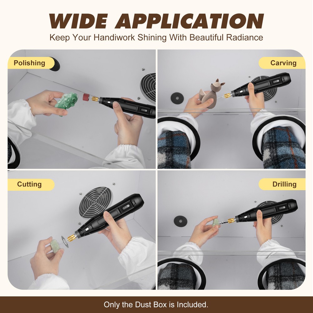 This dust box is a game-changer for polishing and carving! The fully enclosed design keeps dust out of my face, protecting my health while working. I love the clear acrylic cover—it lets me see my progress without exposing me to harmful particles. The dual-hole setup is super convenient for multitasking, and the dust absorption works like a charm. My workspace stays cleaner, and my projects turn out even better. A must-have for anyone serious about polishing!