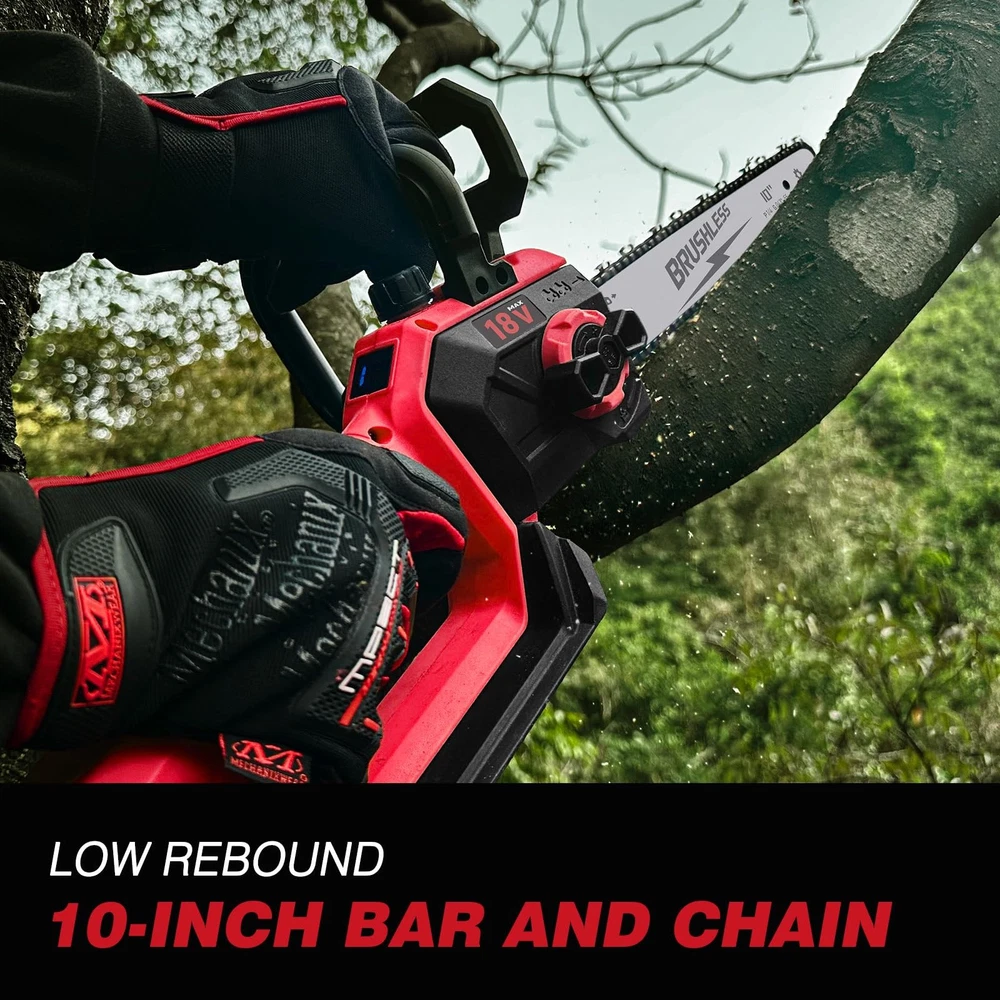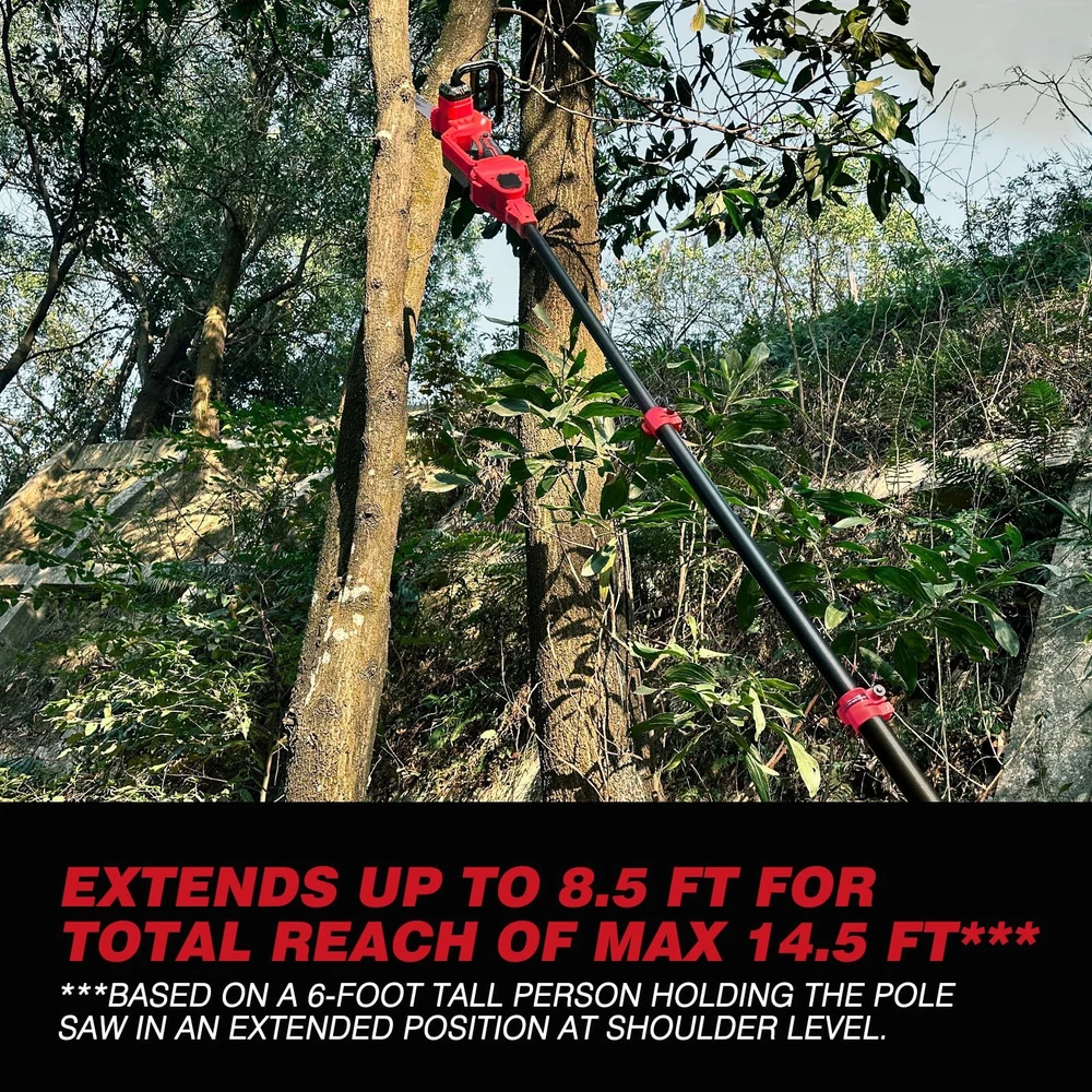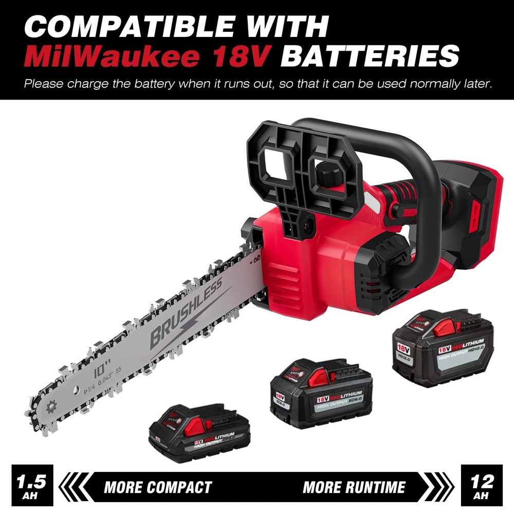 2-IN-1 Cordless 10-Inch Pole Saw And Chainsaw Compatible with Milwaukee M18 18V Battery, Total Reach of Max 15ft, Auto Oiling, Electric Pole Saw for Tree Trimming Pruning (No Battery) Compatible with MilWaukee Batteries: Pay Attention! Tool only,Battery not included!Compatible with MilWaukee m18 series lithium-ion batteries,for 48-11-1820 48-11-1822 48-11-1828 48-11-1840 48-11-1841 48-11-1850 48-11-1852 48-11-1860 48-11-1862 48-11-1880,etc.Giving professionals who already own a MilWaukee m18 battery and battery charger the flexibility to use their preferred battery and battery charger,avoid unnecessary expenses! Versatile 2-in-1 Design: The removable chainsaw head can be used on its own as a 10 inch chainsaw or mounted on a telescoping pole to be used as a pole saw without any tools. With a telescopic pole saw for pruning high branches and a handheld chainsaw for ground work, it will fulfill all your cutting needs. Adjustable 180° Telescopic Pole: The 180° rotatable head provides excellent cutting flexibility, and the extension pole can be extended from 5.7 to 8.5 feet and up to 14.5 feet (based on a 6-foot tall person extending the pole saw to shoulder level). Trimming branches in different locations is easy and effortless without having to rely on unstable ladders. Automatic ROiling And Power Display: Enjoy smoother cuts and longer chain life with our chainsaw’s instant auto-lubrication. The transparent oil tank makes maintenance effortless, while the intelligent power display eliminates battery worries, keeping you in control for smarter, stress-free operation! True Brushless Motor: Our 10-inch cordless 2 IN 1 pole saw is powered by a high-efficiency second-generation brushless motor for powerful performance and reliable operation. Higher efficiency, lower energy consumption, stable and non-decaying power, and longer service life! After-sales service: All of our power tools have passed strict factory quality inspection, safe and reliable, meanwhile you will enjoy 12 months after-sales service, if you have any questions or suggestions, please leave us a message. We are at your service within 24 hours to help you with any questions you may have.