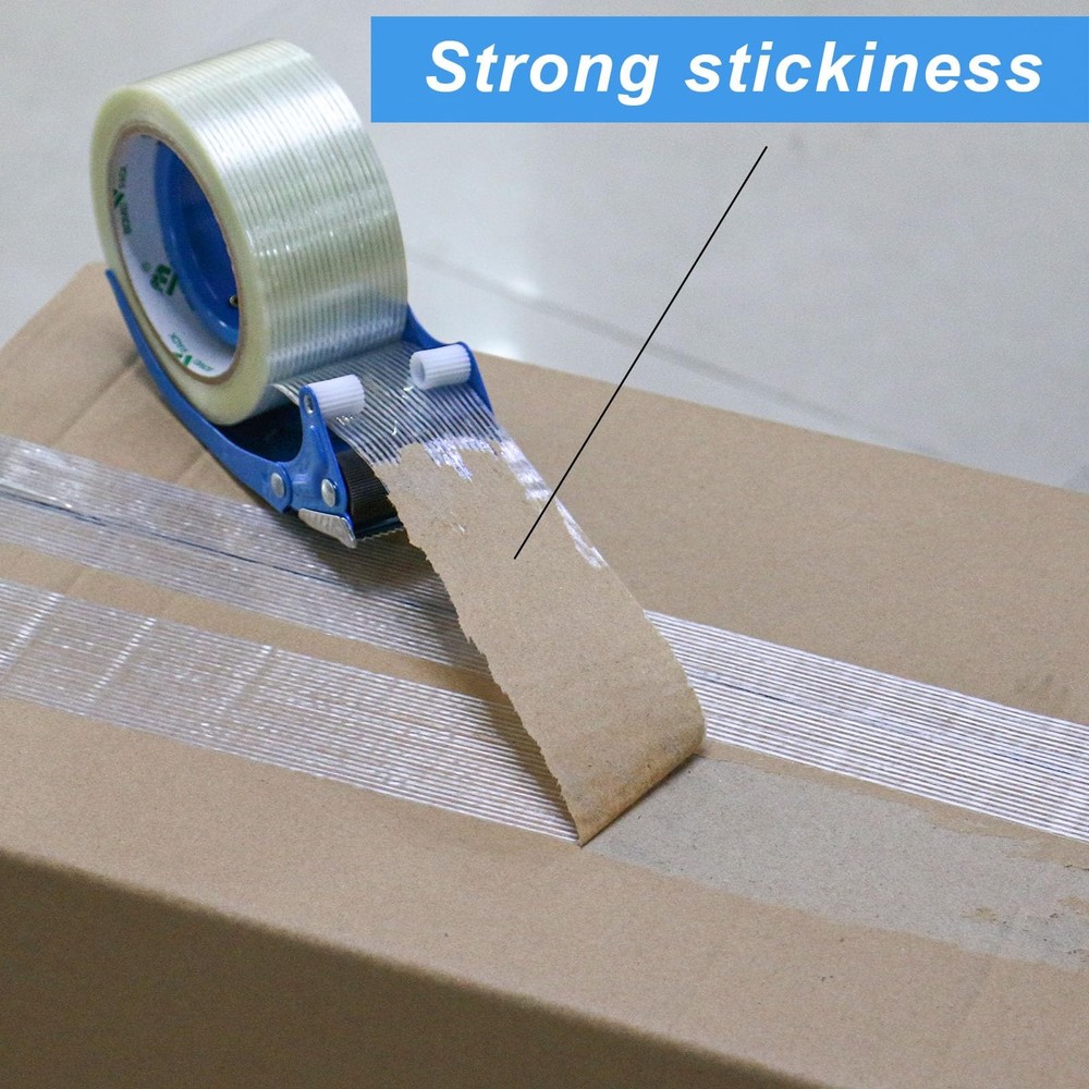 Reinforced Packing Tape with String Description of Reinforced Strapping Tape with Dispenser Filament packing tape is combined with PET film and glass yarn material coated pressure-sensitive synthetic rubber adhesive. It's widely used for metal/wood materials furnishings packing, heavy duty packaging and electric equipment (like washing machine, refrigerator etc) packaging Total 3rolls with a metal packing tape dispenser Features of Strapping Tape 2 inch with Dispenser Nylon strapping tape is a 5.5mil fiberglass reinforced tape; clear liner with white synthetic rubber adhesive. The extraordinary adhesion and tear resistance can tolerate moisture, abrasions, scuffing, nicks, and center seam splitting. This strong tape adhere to a wide variety of surfaces: wood, plastic, metal, fiberboard, etc. The Application for Mono Line Transparent Filament Strapping Tape Mainly include : strapping, fixing, reinforcing, repairing and palleizing... For example: carton sealing, heavy goods packing &strapping, fixing cable, holding carpet, Suitable for most repairs: window, vehicle, furniture, tube children’s toys, pet’s accessories, and for outdoor, office, green house... The Factory BOMEI is a factory, focusing on adhesive tape since 1994. Strict control of raw materials, inspect and supervise the whole process of production. Controlling Quality from Source, in this way you are getting a good quality tape that is worth its price. We hope you like it. . Reinforced packing tape thickness is 5.5 mil, more thicker, more stronger adhesive, total 4rolls 140yds plus a metal dispenser, use easily with the metal packing tape dispenser . Strapping tape 2 inch with high tensile strength is perfect for packing, strapping, bundling, reinforcing, and palletizing . Fiberglass tape is weatherproof, moist resistant, UV and temperature resistant, suitable for most repairs . Special formulated to adhere to variety of surfaces: wood, plastic, metal, fiberboard, etc. . Reinforced tape is ideal for maintenance, wrapping, sealing, fixing, patching and protecting