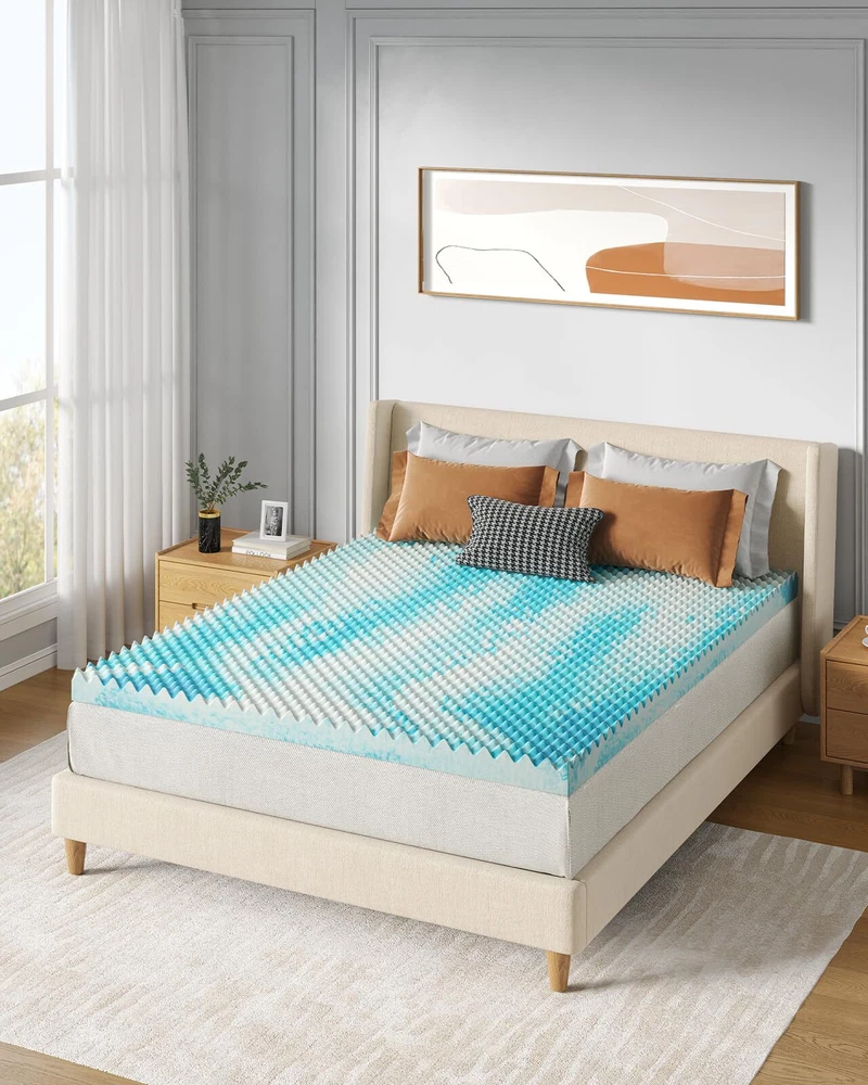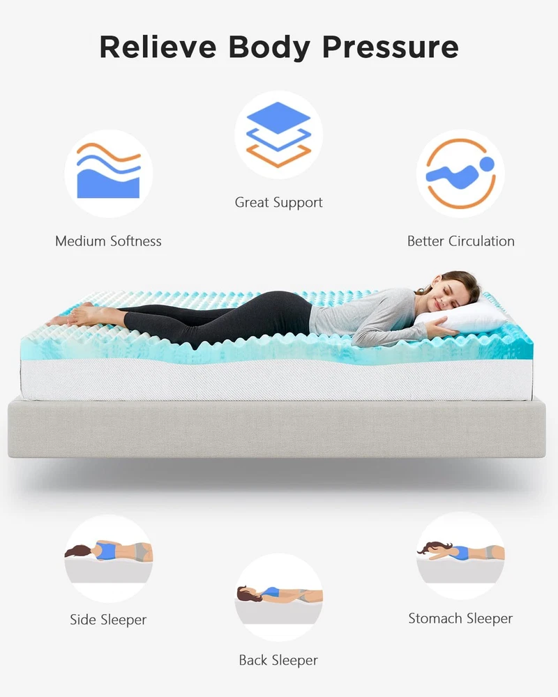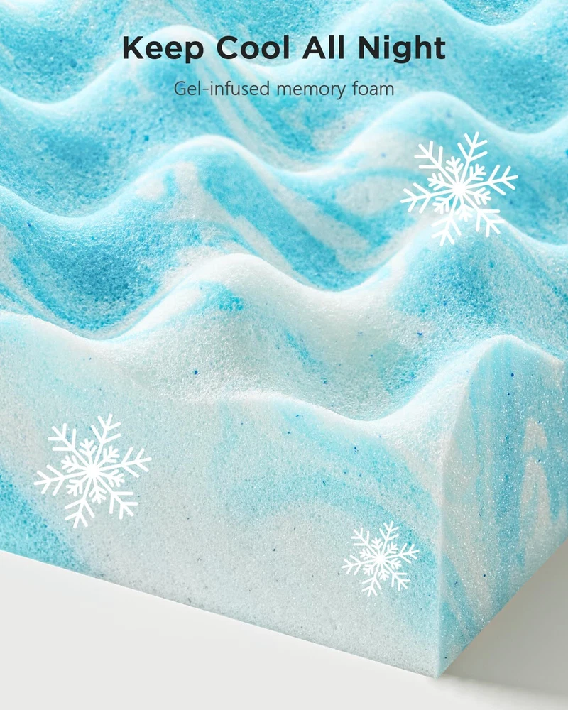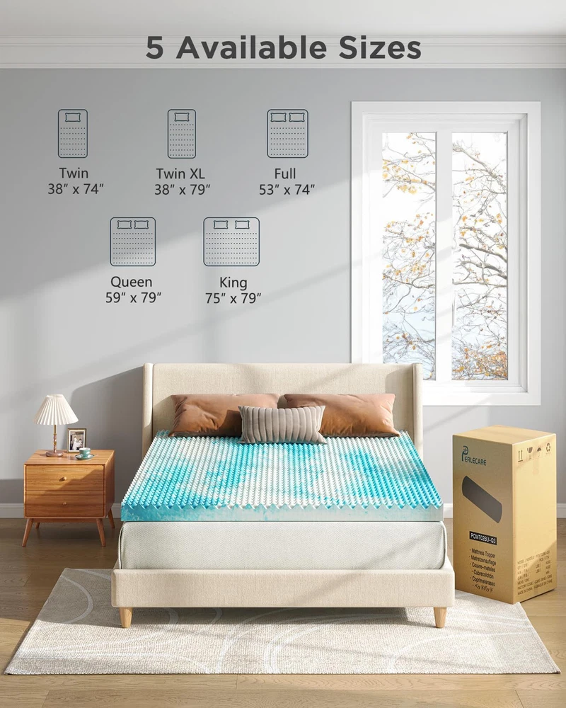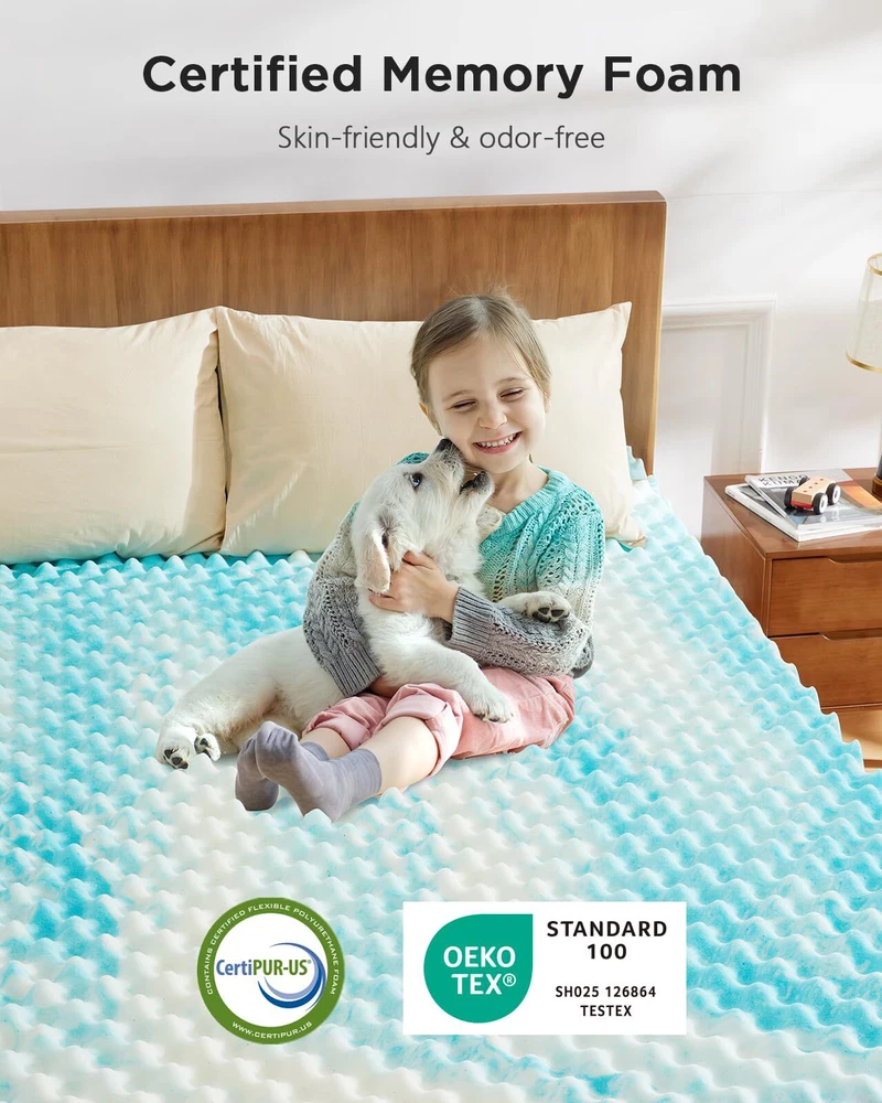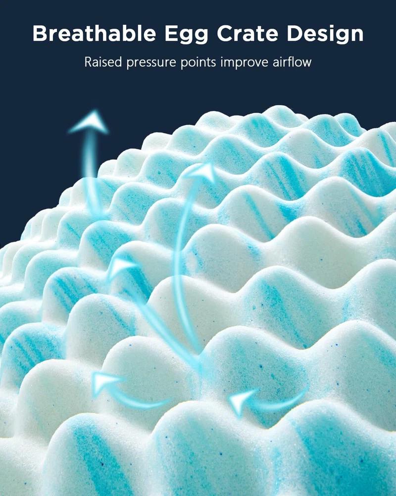 Body Pressure Relief: This twin xl mattress topper is crafted from 100% premium memory foam to offer a medium-soft feel and unparalleled support. The unique egg crate design provides soothing, massage-like support for better circulation and to relieve pressure points, perfect for side, back, or stomach sleepers. Stay Cool All Night: The twin xl egg crate memory foam mattress topper optimizes airflow to keep your bed feeling fresh. With infused cooling gel, you can stay comfortable throughout the night without sweating for undisturbed sleep. Enjoy the perfect balance of support and temperature regulation so you wake up energized and ready for the day. Certified Quality: Our twin xl size cooling mattress topper meets the highest standards of quality with CertiPUR-US, OEKO-TEX, and amfori BSCI certifications. Purchase with confidence knowing that the materials are skin-friendly and odor-free for a better night’s sleep. Multiple Size & Thickness Options: Available in 5 bed sizes and 2 thickness options, our foam mattress topper can be purchased to fit your bedroom, camper, sofa, or RV. Whether you need to extend the life of an old mattress or add softness to a firm one, you can enhance sleep comfort in any space. Easy to Unroll & Store: Our 2-inch memory foam mattress topper is easy to unpack and store. Simply open the packaging, unroll in a well-ventilated area, then allow 48 hours for full expansion. Please reach out to our U.S.-based product support team if you have any questions about product selection.