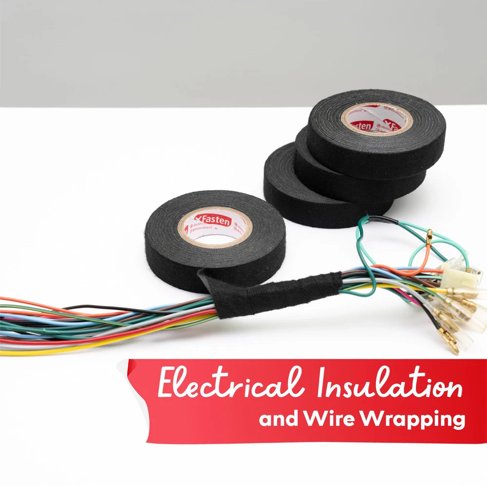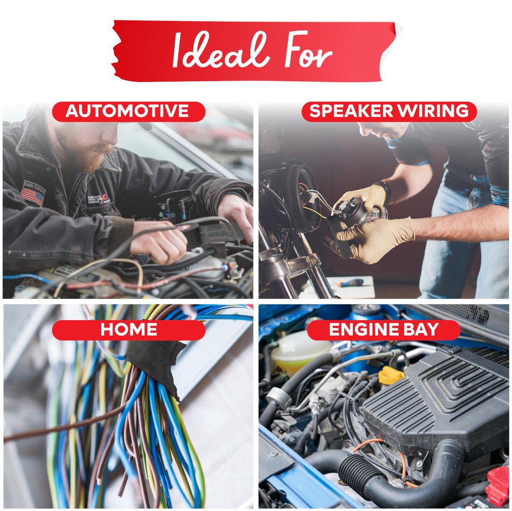 High Temp Durable Performance: Withstands temperatures from -40℉ to 257℉, making this wire harness tape ideal as an automotive tape for engine compartments. This cloth tape resists abrasion and corrosion. Noise Dampening Wire Loom Tape: Reduces coil whining and vibrations for quieter cabins, dashboards, and machinery. This cloth electrical tape provides heavy-duty bundling and insulation. Residue-Free: Our heat shrink tape features a strong adhesive that bonds securely without leaving a sticky residue. Rated to last up to 6 years, this wiring harness tape ensures reliable, mess-free performance. Flexible and Easy to Use Automotive Tape: This high temp tape tears cleanly by hand for quick application, ideal for DIYers and professionals. This fabric electrical tape is perfect for bundling and insulating household wires. Weatherproof and Flame Retardant: Our wire tape resists UV, moisture, and extreme temperatures for year-round protection in high-heat areas like engine compartments.