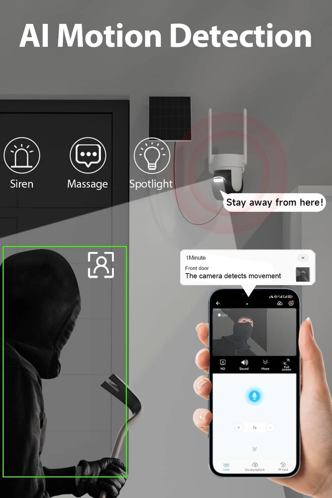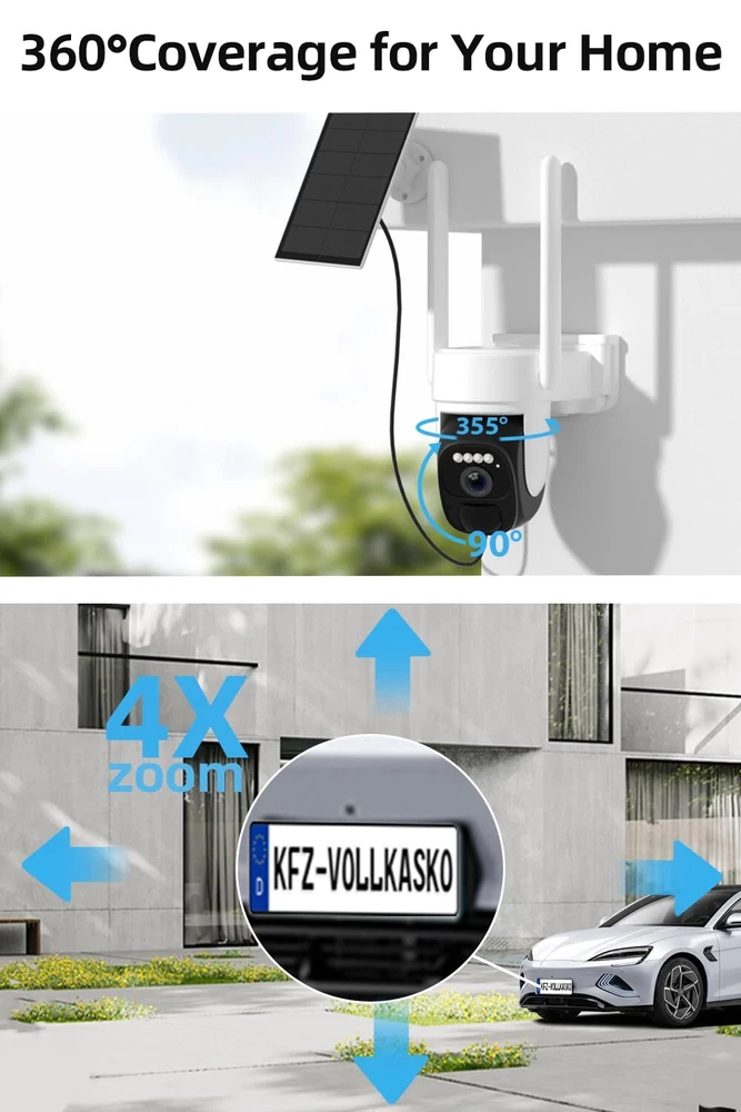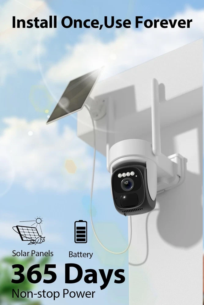 【Low Power Consumption & Advanced Solar Technology】 Powered by solar panel with ETEF film surface covering, the solar powered security camera boasts a 11000mAh rechargeable battery for uninterrupted 365-day power supply. The waterproof design of wireless surveillance camera ensures year-round protection. Experience stable and powerful signal transmission with the high-gain 5DBi dual antenna (2.4GHz Wifi only) 【2K Resolution & Full Color Night Vision】Our outdoor security camera wireless features 2K resolution with dual-view capabilities, giving you both a full view and close-up details on one screen—perfect for home and business security. The wide-angle and telephoto lenses capture vivid, detailed images. Even at night, the enhanced full-color night vision keeps everything bright and clear. With IR control, turning on infrared automatically adjusts night vision; turn it off to keep security camera in daytime mode for 24/7 vibrant monitoring 【360° Pan and Tilt Control with 4X Hybrid Zoom】 Take control with 's PTZ solar camera outdoor wireless, supporting 355° horizontal and 90° vertical rotation. The outdoor cameras for home security can easily cover more areas through the "O-KAM" App and benefit from a 4X Hybrid Zoom for clearer and more detailed views, surpassing digital zoom capabilities 【Intelligent Human Detection & Enhanced Communication】 Experience smart human detection with built-in PIR sensors. Upon detecting motion, the solar security camera wireless outdoor pushes instant alerts to your phone. The two-way audio feature of security cameras wireless allows for direct communication with anyone within range, enhancing security and convenience 【Effortless Sharing & Smart Storage Options】 The outside cameras for home security supports multiple users for simultaneous monitoring through the app. Share the security camera outdoor with family and friends effortlessly. Benefit from versatile storage options, including cloud storage and up to 256GB micro SD card storage (No Subscription Fee). Rest easy with lifelong technical support and a two-year warranty for exceptional after-sales services