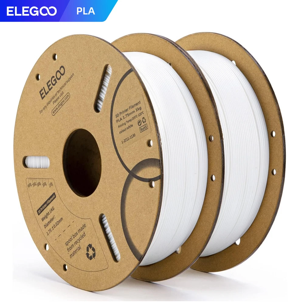 ELEGOO PLA Filament 1.75mm 3D Printer Filament Dimensional Accuracy +/- 0.02mm, Compatible with Most FDM Printer 【High-Quality PLA Filaments】 Made of high-quality PLA, a commonly used thermoplastic material features lower melting temperature and ease of use, low warp and shrinkage, odorless during printing, and provides a glossy surface finish. 【Clog-Free & Bubble-Free】 Designed and manufactured with clog-free, superb layer bonding and great fluidity for smooth and stable extrusion. Complete dried for 24 hours before packaging and vacuum sealed with desiccants in the bag to protect the filament from moisture, no clogging and bubbling problems. 【Dimensional Accuracy & Consistency】 Strict tolerances guarantee these PLA filaments of 1.75 mm diameter much smoother and more stable printing with the dimensional accuracy of +/- 0.02 mm; 1 kg spool (2.2lbs). 【Less-tangle and Easy to Use】 Full mechanical winding and strict manual examination to ensure that the line is neatly arranged and less tangled, and to avoid possible snap and line breaking. A larger spool inner diameter design for easy feeding. 【Wide Compatibility】 Universal compatibility with most of the common 1.75mm FDM 3D printers on the market due to the high-quality standards in terms of manufacturing accuracy and a small dimensional tolerance of +/- 0.02mm. Technical Specifications Density: 1.20g/Cm³ Melt Index: 14(190°C/2.16kg)G/10min Tensile Strength(X-Y): ≥ 50mpa Elongation At Break(X-Y): 11.2% Bending Strength: 91mpa Bending Modulus: 1913mpa Charpy Impact Strength: 5.4kj/M² Thermal Deformation Temp: 53°C(0.45mpa) Fan: 100% Line Length: (1.75mm) 330-335m Rockwell Hardness: 88 Print Layer Thickness: 0.2mm Recommended Extrusion/Nozzle Temp: 190~220°C(Recommended 205°C) Recommended Heated Bed Temp: 50-65°C Printing Speed: 30-70mm/S Recommendation Platform: PEI/Glass/Fiberglass Board+Pvp Glue Stick Or Textured Paper