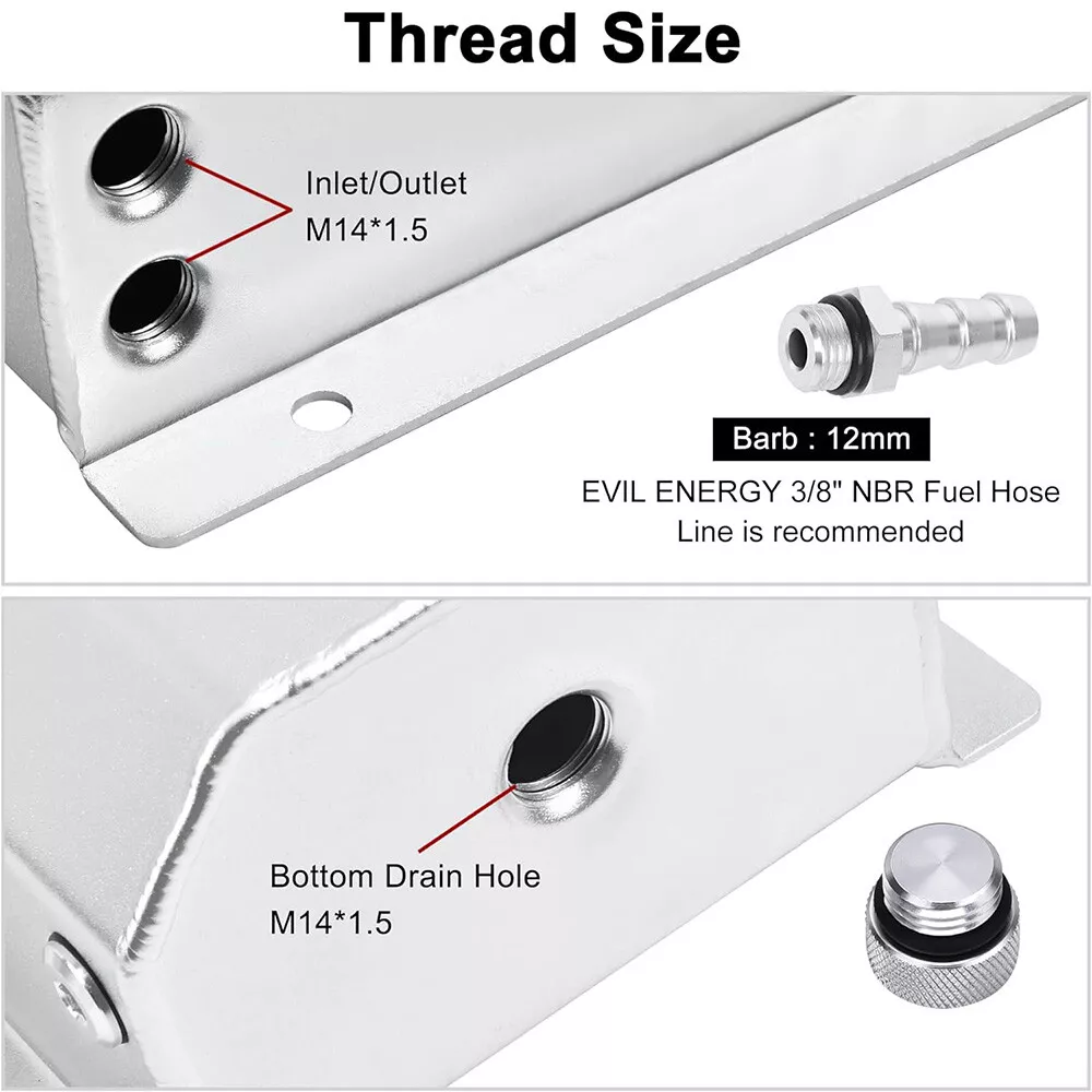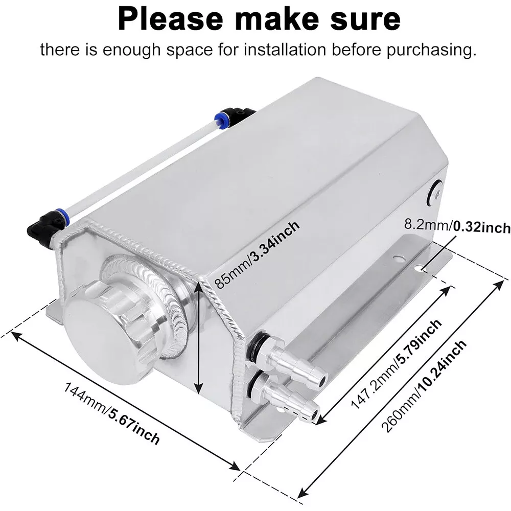 Feature: Capacity:2L Barb inlet and outlet ports:2*12 mm Thread size:M14*1.5 Size:144mm/5.67inchx85mm/3.34inchx260mm/10.24inch Package: Coolant Overflow Tank * 1 Hollow Nut & Pneumatic Connector *2 Hose Connector *2 Aluminium Cap *1 2L Coolant Radiator Overflow Tank +Baffled Oil Catch Can with Breather Filter Product Description MULTIPLE USES Used as oil catch can Prevent carbon and sludge build-up in the intake system and the engine, keep engine clean and prolongs its life. Used as coolant overflow tank Coolant overflow tank is basically a remote reservoir for the radiator. Switchable inlet/outlet and level indicator can be placed either on the right or left hand side of the can. Universal coolant reservoir overflow tank, suitable for most vehicles. The water tank is compatible with Mitsubishi, compatible with Nissan, compatible with Mazda, compatible with Jeep, compatible with Dodge, compatible with Ford, compatible with Acura, compatible with Infiniti, compatible with Lexus, compatible with Sion, compatible with GM and other vehicles. PRODUCT DETAILS Fully Tig Welded Keep a good sealing environment and better prevent coolant leakage. Aluminum alloy body High temperature and corrosion resistance, longer service life, better than plastic materials. Hose Fitting with O-ring Three raised edges can effectively prevent the hose from slipping off. Liquid level indicator with O-ring Fluid levels can be easily checked without opening the bottle cap. Washable cap with O-ring The cap is knurled for easy opening and closing. Bottom drain valve with 0-ring Magnetic drain plug at the bottom of the car expansion tank for easy draining and cleaning. PRODUCT PARAMETERS Payment Delivery details Terms of sales About us Contact us Payment 1.We only accept PayPal. PayPal is the only online payment method we accept. Please make sure you have a valid/confirmed PayPal account prior bidding. 2.All Paypal Payments must be Confirmed. Payment must be made within 48hrs of the auction end time. Non-Paying bidders will be reported. 3.When you get your package,maybe you will pay some charges, it's taxes for local customs,not pay to us, and the fees are depends on the customs, all buyer are same. Delivery details 1.Items will be shipped within 2 business days after payment is received. 2.We ship to your eBay address. Please make sure your eBay address is correct. Buyer takes responsibility if eBay address is wrong. 3.Import duties, taxes and charges are not included in the item price or shipping charges. Please check with your country customs office for these additional charges. 4.We shipping using UPS or USPS from our nearest warehouse to you. Tracking numbers will be emailed upon shipment. Terms of sales 1.Please feel free to email us if you have any question. 2.We appreciate you contact us via eBay message when you are not satisfied rather than open case or leave negative feedback directly. We'll try our best to solve the issue. 3.Refund will be issued once we receive your returned items. Buyer is responsible for all return shipping charges. 4.Please contact us for return process before you return the item. 5.All items for exchange or refund must be returned in "as new" condition. About us We are the responsible seller ,always provide high-quality products and best service .If you have any questions, please contact us, and will try our best to help you. Please contact us by eBay Message, and we will reply you within 24 hours. Thank you very much! Contact us We are the professional auto parts manufacturer , and provide line lock, AN hose end fittings , fuel line , fuel filter , fuel regulator , exhaust cutout , exhaust tips , exhaust muffler and so on .The quality of the product to be secured. If you have any questions or any needs , please contact us , and will try our best to help you.
