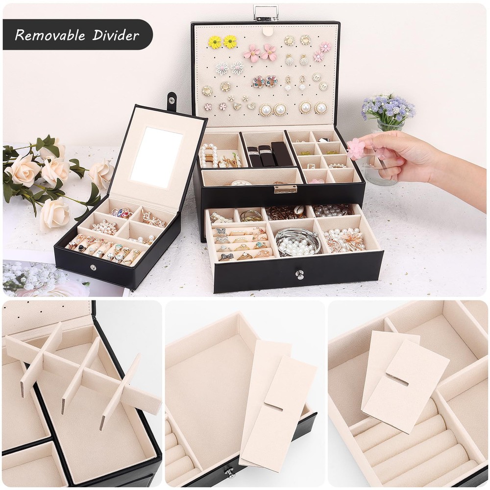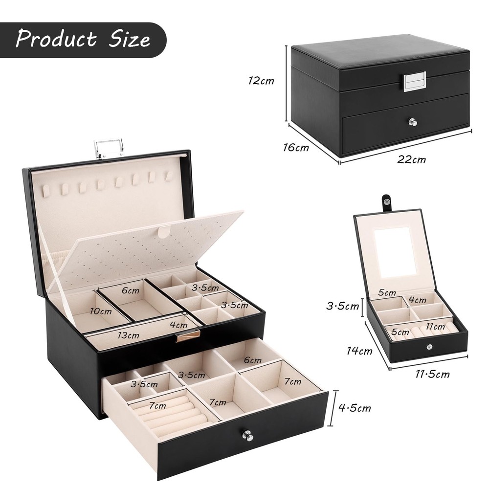 【Jewelry Storage Box Organizer】-- 2 layers leather jewelry organizer include 8 necklace hooks, velvet pocket, 74 earring holes, separate compartments, ring slot, portable small jewelry box. 【Separate Travel Jewelry Case】--There is a travel jewelry organizer in the bottom drawer, being made up of a mirror, ring slot and separate compartments. The space can also be turned into a separate compartment (with removable dividers) after you take out the travel jewelry box. 【Large Jewelry Case】--The size of the necklace organizer box is 22*16*11.5cm, and the size of the individual small jewelry box is 13.5*11.5*3.5cm. The jewelry storage case is easy to organize all types of jewelry, including earrings, bracelets, rings, necklaces, watches, etc.. 【Good Handcraft & High Quality】--Jewelry storage box is made of PU leather material, waterproof and dust-proof. Soft velvet lining protect your jewelry from scratches and damage. A durable and good-looking metal clasp (no lock) prevents your jewelry from falling out. 【Fancy Gift Idea】--The big jewelry box is an excellent storage box for necklaces, earrings, bracelets, rings, etc. It is an idea gift for mother, wife, daughter or friends on Valentines Day, Mothers day, birthday and anniversary day. Of course, it is also a good choice to use it as a gift to reward yourself - you deserve it!
