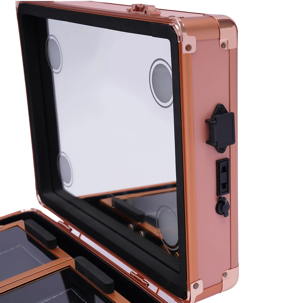2-Layer Portable Makeup Bag Train Cosmetic Storage Case w/ 2 Lock & LED Mirror Specification Main Material: ABS Color: Rose Gold Plug Type: US Light Source: LED Light Color: Cold White, Warm White and Natural Light Voltage: 110-240v, 50-60Hz Power Cord Length: 1.8m/5.91ft Package Size: 40*21*35cm/15.75*8.27*13.78in Top Cover Mirror Size: 37*28*6.5cm/14.6*11*2.6in Bottom Tray Size: 37*28*9.5cm/14.6*11*3.7in Overall Case Size: 37*28*16cm/14.6*11*6.3in Center Tray Size: 15*22*4cm/5.9*8.7*1.6in Gross Weight: 4kg/8.82lbs Net Weight: 3kg/6.61lbs Package Included 1*Makeup Train Case 1* Power Cord Key Features Large Capacity Zoned Storage : It has two layers . The upper layer consists of 2 separate trays of 5.9*8.7*1.6inch for your usual lipsticks, brushes, blushes, etc. The lower layer is a 14.6*11*3.7in a one-piece tray that provides more space for your nail polish, essential oils, foundation, etc, so you can say goodbye to a cluttered desktop. Elegant Look : It is made in black style with all the components matching that color and keeping in line with the specially made handles for an impressive look. Makeup Assistant: It comes with 4 LED lights designed in the corners of the lid and a top mirror. The LED lights can adjust the light color between cold white, warm white and natural light, and the brightness of the makeup lights can be adjusted by touching the screen, allowing you to apply makeup anytime and anywhere. Security Protection : It comes with 2 locks to protect privacy and security during travel. Therefore, it is also suitable for holding watches, bracelets and some other valuables. Considerate Design:This make-up case comes with a 12V rechargeable jack, an external power supply jack, and a power jack. And the power cord can be used for an external curling iron, mobile phone, and hairdryer power when it is powered up to meet your needs while working. High Quality : It is made of high-quality ABS material, which is sturdy and durable, and the metal reinforced corners have good wear resistance . It can be used for many years. Easy to Clean : ABS stain-proof plastic is easy to clean. If the tray gets dirty with cosmetics, just wipe it with a damp cloth and it will be as good as new. Humanized Design : In addition to the makeup fire compartment itself which is closed, the two separate trays on the upper level also have their separate lids, which can effectively prevent dust and stains on your cosmetics. Ideal Gift : This elegant makeup train case is what every girl needs, so it is a great gift for girls. Portable : It is designed as a mini suitcase with dimensions of 5.9*8.7*1.6in and weighs only 6.61lbs. The curved grip makes it easy to hold and carry on your journey. Details Enhanced Corners : Durable aluminum material for long-term use can hold all your daily cosmetics and tools and keep their shape. Glass Lids : The two separate trays on the upper level feature clear glass lids, making it easy for you to be able to find your cosmetics at a glance. 5.91ft Power Cord : It comes with a 5.91ft power cord, allowing you to have plenty of length at your disposal. Therefore, it is more convenient for you to use it. Application This product is suitable for storing cosmetics and skin care products, as well as jewelry, such as necklaces and earrings. Besides, it also can be used in dark places for makeup. Notes Please allow the slight color difference caused by the shooting light and 1-3cm error due to manual measurement, and make sure you do not mind before you order. Payment Delivery details Terms of sales About us Contact us Payment We accept ebay payment 。 Fees such as import duties, taxes are not included in the item price or shipping costs. These charges are the buyer's responsibility. Delivery details Shipping: 2-9 working days to: USA Terms of sales We maintain high standards of excellence and strive for hundred percent customer satisfaction. Feedback is very important to us. We hope that you contact us immediately before you give neutral or negative feedback, so that we can address your concerns. It is impossible to address issues if we do not know about them! About us Your satis faction is our ultimate goal. We work hard to earn your trust and future business. Our certified technicians have tested each item before shipping. The unit comes with 1 year limited warranty on all manufacturing defects. a) If you receive a defective item, you may return it or ask for a discount. Please contact us within 14 days after you receive the package. b) What you returned must be intact and in its original packaging as re? u. Customer is responsible for shipping costs of the returned item. c) We will cover the cost of shipping back t with the shipping rate indicated in the registration page. We will send you a new unit or refund the full payment you paid. Thank you. Contact us Business Hour Business Hour: Monday To Friday: 8:30 AM to 5:00 PM (Beijing China time) Due to time zones, our reply to your questions may not be immediately. But within above working time, we will reply your email within 24 hours. If it's non-workdays, please kindly be patient and wait till Monday. Please contact us with ebay message. Please feel free to contact us if you have any questions. Monday To Friday: 8:30 AM to 5:00 PM (Beijing China time) Due to time zones, our reply to your questions may not be immediately. But within above working time, we will reply your email within 24 hours. If it's non-workdays, please kindly be patient and wait till Monday. Please contact us with ebay message. Please feel free to contact us if you have any questions.