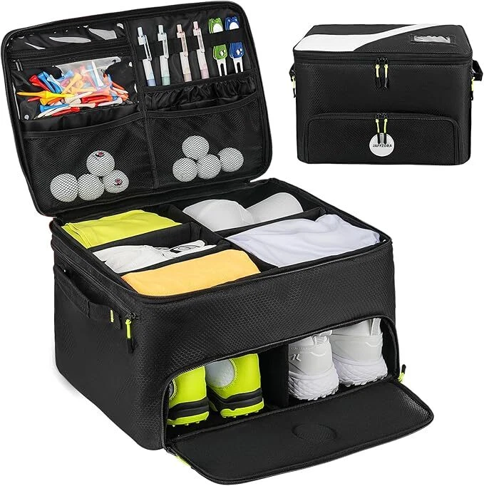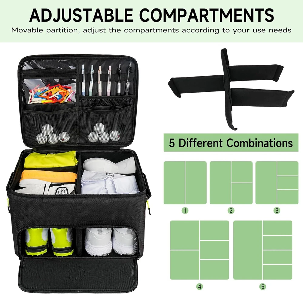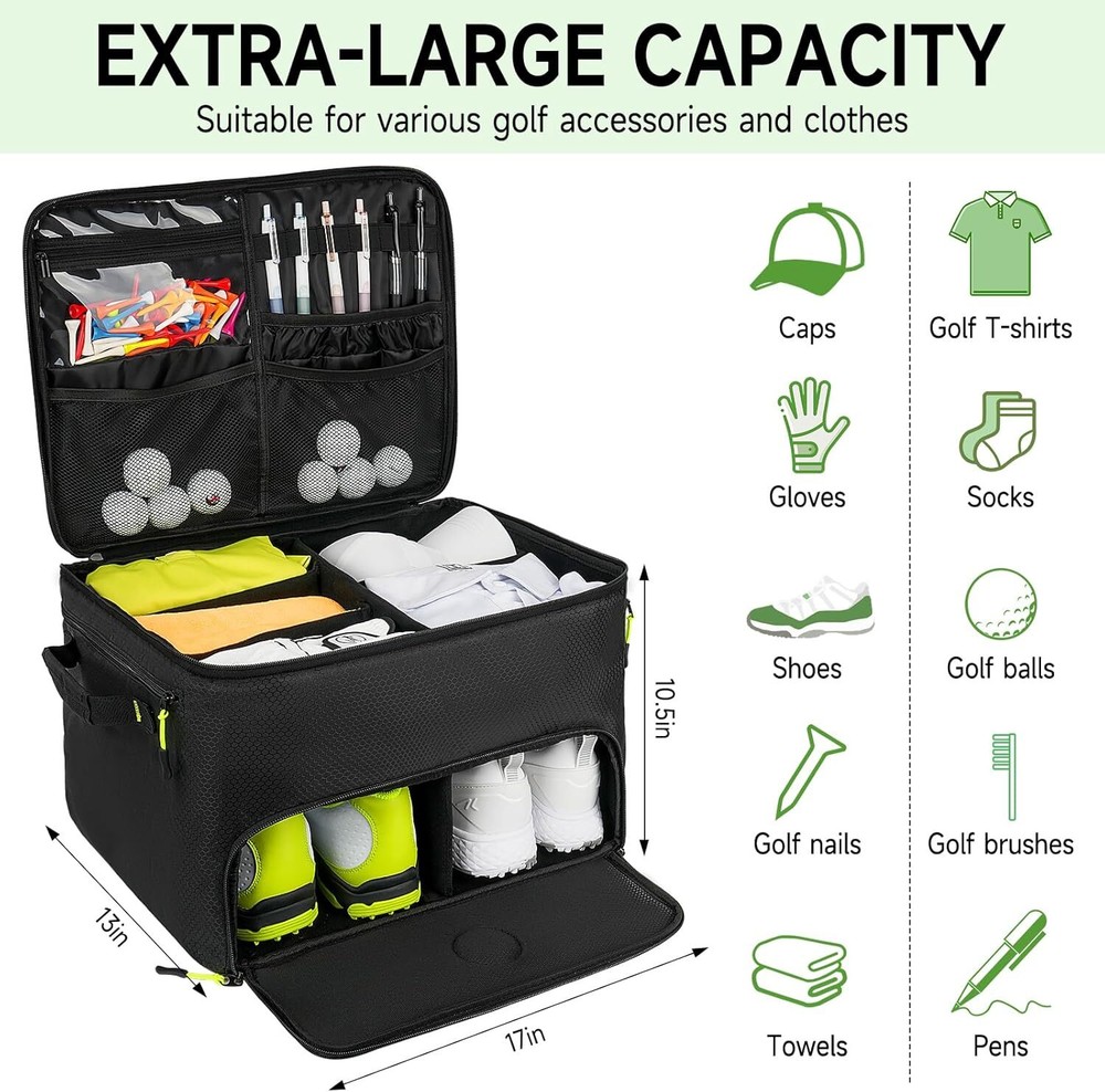 Golf Trunk Organizer, 2 Layers Golf Accessories Bag for Men, Waterproof Car Golf Storage Organizer with Compartment for 2 Pairs of Shoes, Golf Gifts for Men Women, Black Keep Structure: Our golf accessories bag comes with extra 2 support pads, you can insert these 2 hard pads into both sides for keeping the bag structure. And the anti-slip bottom base added durability. Separate Shoe Compartment: The golf organizer for car has shoe compartments to hold 2 pairs of shoes, up to size 11. The breathable design keeps air flowing, helping you solve odor problems. The golf logo design adds a touch of color to this golf bag. Large Capacity: The golf car bag organizer adopts multi-pocket design, and main compartment has 4 removable dividers, which can divide the space into 5 parts, can easily store your golf accessories such as towels, T-shirts, socks, hats, gloves, etc. Sturdy: The golf car organizer is made of high quality oxford fabric materials with reinforced corners, which has excellent wear resistance, scratch resistance and water resistance. Double layer design provides more space to store your golf accessories. Ideal Present: This golf trunk organizer stores all your golf essentials in your car for easy access, making it an ideal golf present for golfers. Also a great choice for Father's Day, Mother's Day, Thanksgiving Days, etc.