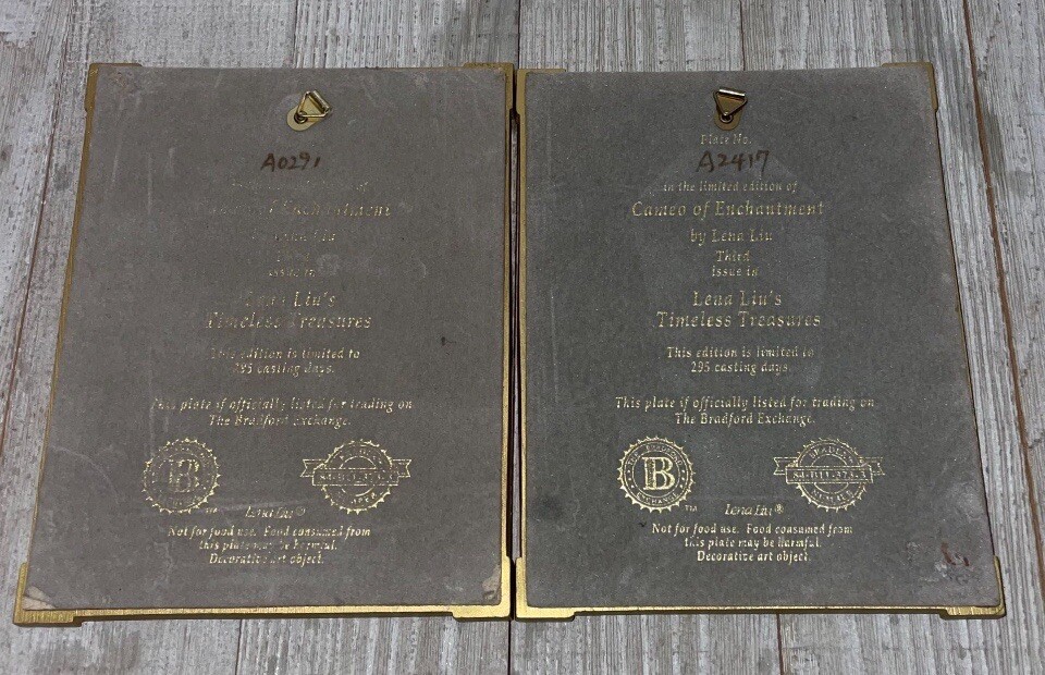 Add a touch of elegance to your collection with this set of two limited edition collector plates by Lena Liu. These plates feature the "Timeless Treasures" design, with intricate details and vibrant colors that will make them stand out in any display. Made of high-quality ceramic and crafted using traditional pottery techniques, these plates are a true work of art. The plates are perfect for display on a wall or table, and their vintage design adds a unique touch to any room. Don't miss out on the opportunity to own these beautiful plates, produced in the late 20th century by the Bradford Exchange. A1508