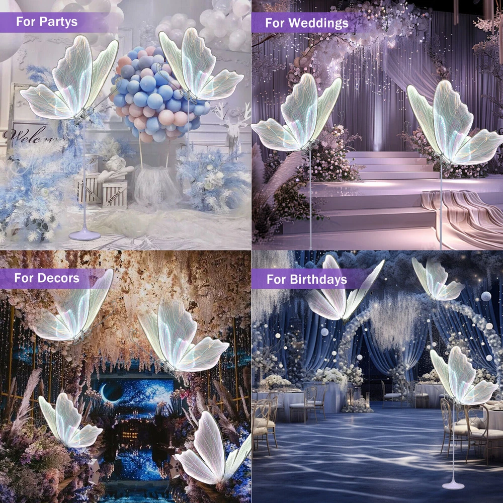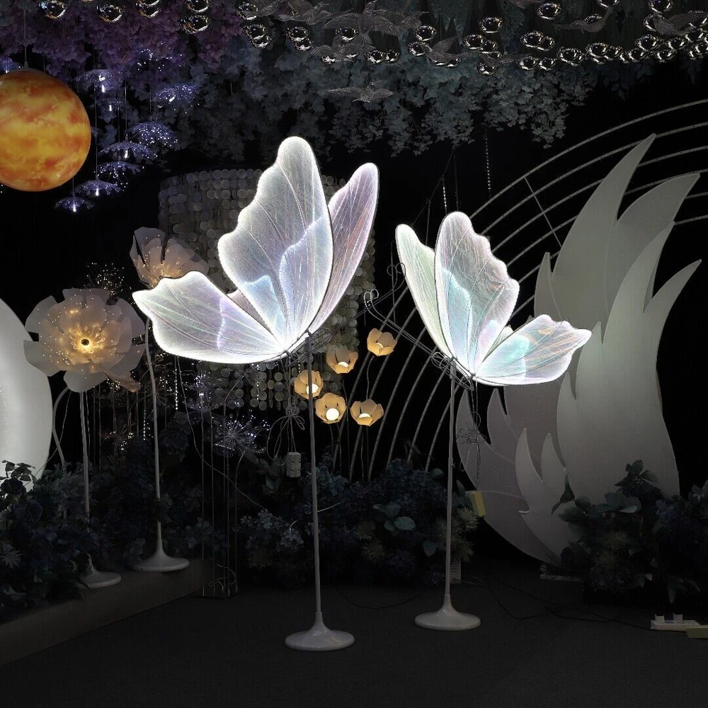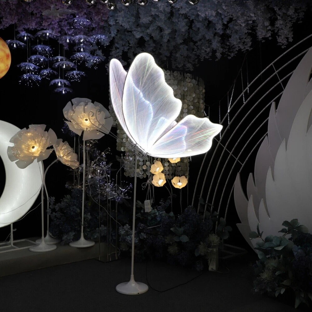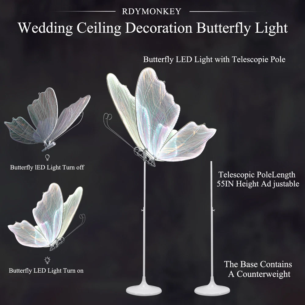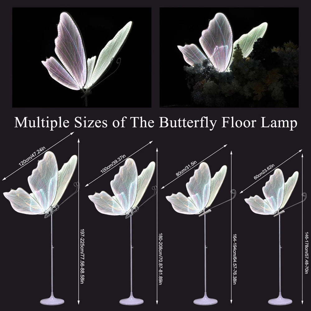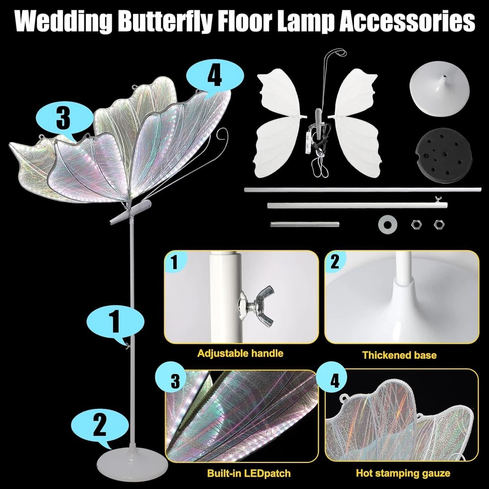 Product Description 🩋【Wedding Butterfly Floor Lamp】The wedding romantic atmosphere floor lamp creates a romantic, warm and elegant atmosphere at the wedding or party venue. It can be used on the floor or ceiling. Butterfly decorations can be matched with flowers and background to bring you a unique romantic atmosphere. 🩋【Sturdy Material】Butterfly floor lamp made of iron body + lace cloth + LED light strip, with LED white light (white lace cloth) Butterfly lamp uses built-in LED chip light source,white light (6000K). They can be placed in every corner of the venue to add a warm and romantic light and shadow play. 🩋【Easy to Install】Surface mount, includes all mounting hardware for quick and easy installation, features push button switch for easy adjustment. The package includes the butterfly lamp and base, which can be hung or ceiling-mounted. 🩋【Applicable Scenes】Wedding Romantic Atmosphere Floor Lamp creates a romantic, warm and elegant atmosphere at the wedding or party venue. Butterfly lamp suitable for wedding stages, T stage street guidance decorative lights, wedding halls, hotel layouts, window layouts, lamps, hotel decorations. Creating a Romantic Atmosphere: These decorative lights typically emit soft lighting, creating a warm and romantic ambiance at the wedding venue. They can be placed in various corners of the venue, adding a cozy and romantic play of light and shadow.