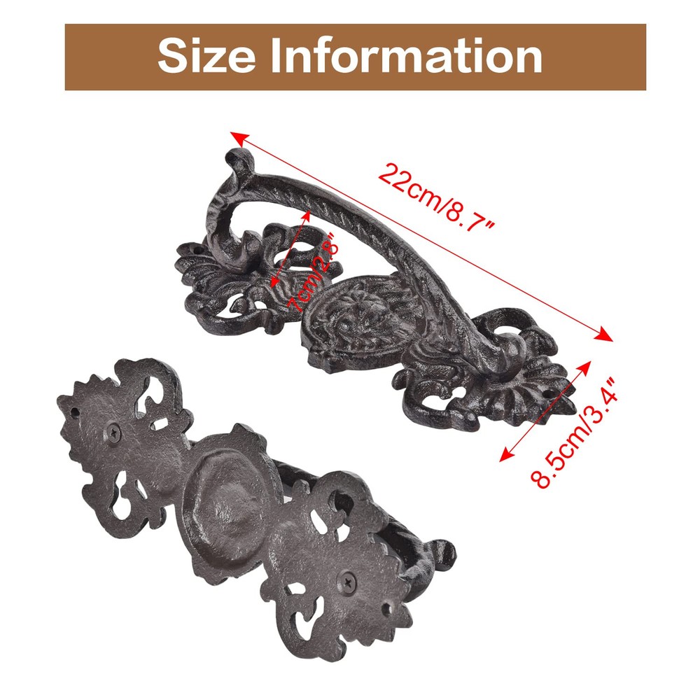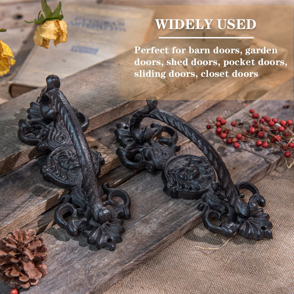 Material: These door handles are made from heavy duty cast iron, finished with antique black brown color coated, solid construction. Rustic & Vintage Style: Rustic drawer pulls with a smooth-ish but with an aged hand-made iron look. They are the opposite of modern and should look nice in any old or rustic or industrial type of décor. Exquisite Details: Handles are well made, they have been ground, no sharp edges and are comfortable to grasp, very heavy and sturdy. It is very easy to apply, and definitely give your door some extra panache. Widely Application: Solid metal barn door handles are perfect for barn doors, garden gates, garage doors, wooden doors, fence gates, french doors, shed doors, closet door, sliding doors etc. Pull door handle can be used in interior and exterior. Easy to Install (Note:Mounting screws are not included); Package Includes - 2 * Door Pull Handles; Size:22L*8.5W*7H (CM) / 8.7H*3.4W*2.8H (INCH)