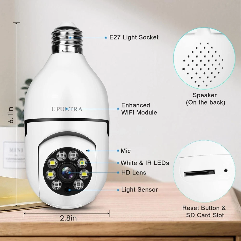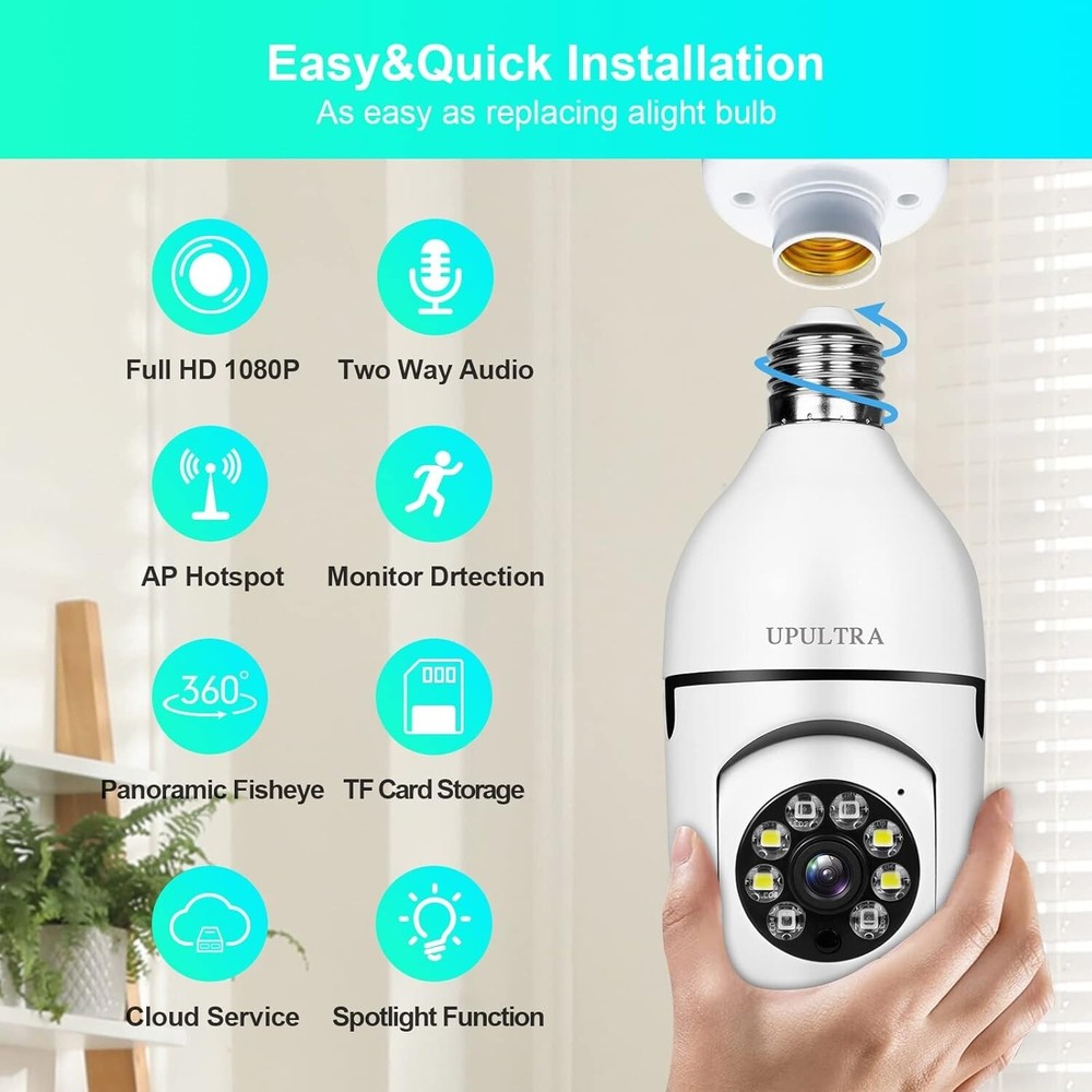 About this item đź’ˇWireless & Easy Installation: This camera can be installed using a normal E27 base(110V~240V),NO MORE EXTRA INSTALLATION STEPS.then you just need to connect the camera system to the router,open the app to setup the camera within minutes. đź’ˇ1080P & Pan Tilt: This Pan Tilt WiFi camera can provide you with a clear vision (Full HD 1080P resolution) at any time,You can use the APP to control the camera viewing angle to achieve 360 viewing without blind spots. đź’ˇMotion Detection & Real-time Alerts: this PTZ dome surveillance camera adopts a highly sensitive motion sensor,Once the camera detects the movement of the object after connecting it to the Internet, it will record the moving picture and notify you through the APP. đź’ˇRemote Viewing & Night Vision: Our camera can control the viewing angle through APP,you can access remotely view anywhere and any time through your iPhone/Android phone/Ipad,Even in complete darkness, you can view clear images. đź’ˇTwo-Way Audio & High Quality Service: Built-in microphone and speaker, the bulb security camera can have a conversation between you and your visitor,If you have any question, please contact us.We provide lifetime technical support and services. E27 Light bulb security camera,100% WIFI and easy to install,Keep your family safe. Main Features: 1.Easy to install, comes with an E27 jack. 2.With infrared and white light, You can switch between black and white and color night vision at will,even at night, you can see as clearly as day. 3.You can control the camera to rotate 360 degrees at any time through the mobile APP, no visual blind spots. 4.Sensitive motion detection, when an object is detected to move, you can push notifications to your mobile phone as soon as possible. 5.Two-way Audio allows you to communicate clearly with the person opposite the camera at any time. Tips: 1.Please make sure the device is connected to the power and your phone is connected with Wifi. 2.The product does not have a memory card, please prepare by yourself if you need it, or choose the link with a memory card when purchasing. Easy to Install It is very easy to install this E27 camera. Just screw the camera into the lamp holder, connect to the wifi, no drilling, no wiring, no power cord, no hard settings, and then open the APP to set up the camera in a few minutes. Night Vision With infrared and white light, You can switch between black and white and color night vision at will,even at night, you can see as clearly as day. Motion Detection This Wireless camera is a good protector for your family and house property. When the PIR catches the motion, it will push an alarm notification to our phone app and it begins to record at lest 15s after the motion is out of the detecting area. Two-way Audio Two-Audio voice makes it more convenient for you to communicate with your family, allowing you to video and voice with your family anytime, anywhere. Easy Remote Monitoring You can watch live monitoring video on your Smartphone, support iOS, Android, tablet, iPad, and windows system IE anytime and anywhere,Can also share with family. Easy Remote Monitoring The camera used for home security can choose to save all videos to micro SD card or cloud storage. All videos can be played directly through the application. Product information Compatible Devices Android Power Source Corded Electric Connectivity Protocol Wi-Fi Controller Type Android Mounting Type Wall Mount Video Capture Resolution 1080p Color 2pcs 64G memory card included Number of Items 1 Wireless Communication Technology Wi-Fi Item dimensions L x W x H 7 x 3.1 x 7 inches Batteries Required? No Low light technology Night Color Alert Type Motion Only Room Type Office, Kitchen, Living Room, Classroom Video Capture Format MPEG-4 Unit Count 2.0 Count International Protection Rating IP67 Product Dimensions 7 x 3.1 x 7 inches Item Weight 1.07 pounds ASIN B0BD4C9WG1
