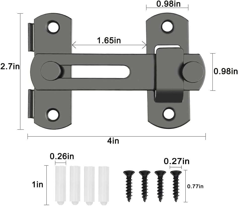 Easy to Operate: The barn door lock is a classic hook and eye lock, easy to operate and can be quickly locked and unlocked, and difficult to automatically unlock. Compact and exquisite, it can firmly grasp your doors and windows, not only do you not have to worry about children and pets entering, but also protect your privacy. Sturdy and Durable: The barn door latch is made of high-quality alloy steel, sturdy and durable, and will not easily deform. The surface is covered with anti rust coating, which can resist daily corrosion, ensuring the durability and reliability of the sliding door lock. No Limited by Space: The barn door lock is not limited by space and can firmly lock the door. The barn door latch can also rotate 180 degrees and can be installed on both the left and right sides of the doors and windows. Easy to Install: This gate latch is easy to install, each equipped with 4 mounting screws. Once the screws are fixed, the installation is complete. However, pay attention to the distance between the two accessories to ensure that the barn door lock can work properly. Wide Application: The barn door latch is lightweight, but sturdy and practical, making it an ideal choice for most farm gates, small pet cages, sheds, cabins, windows, cabinets, garages, barn doors, and more. Add a simple protection to your doors and windows, and bring convenience to your life. VEAPIZ brand is committed to providing you with the highest quality products and services to make your shopping experience the best it can be. we want to bring convenience and fun to you and your family. Product Advantages: ● Classic hook eye lock that is easy to operate and can be quickly locked and unlocked. ● Made of high-quality alloy steel, covered with a rust resistant coating on the surface, which can resist daily corrosion, and discoloration. ● Not limited by space,can also rotate 180 degrees,both sides can be installed. ● Attention to the distance between the rotating cards to ensure that the door latch can work proper. ● The door lock and latch are lightweight, sturdy, and durable, and will not easily deform. ● not only do you not have to worry about children and pets entering, but also protect your privacy. If you like it, don't hesitate to act! Material: High-quality carbon steel Lifetime Guarantee: VEAPIZ products are subject to strict quality checks and provide a lifetime guarantee on our products. If there is any problem with the product during the warranty period, we will give you a full refund. Package Includes: 2PCS Barn door lock(black) 8PCS Installing screws(black)