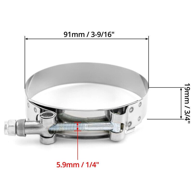 2PCS 3" Inch T-bolt Clamp Silicone Stainless Steel Hose Turbo Intake Intercooler ✨Item Description [What You Get]: Our product includes 2pcs 83 mm-91 mm or 3.27"-3.35" T-bolt hose clamps which are fittting for 3'' ID hoses. You can use them to replace the old hose clamps at home. [Premium Material]: The hose clamps are made of stainless steel material with strong tensile strength. With zinc plated on the surface, which makes the hose clamp have strong corrosion and rust resistance and enhances the service life of the product. [T-Bolt Design]: The self-locking nut can prevent the hose clamp from loosening, realize the leak-proof effect, and maximize its fastening effect. Compared with traditional hose clamps, T-bolt clamps can achieve better leak-proof effect. [Excellent craftsmanship]: Our T-bolt clamps are carefully polished, the edges are smooth, the surface is clean and free of burrs, and will not harm the pipeline. The smooth surface is uniform and shiny, which is practical and beautiful. [Application]: These hose clamps are accurate in size. These are the perfect choice for medium and high boost applications. Works great for DIY Turbo, Intake system, Intercooler, piping, radiator hoses. ✨Specifications Condition:100% Brand New Warranty: 90 Day Free Return:30 Day Material: stainless steel Color: Silver Band Width: 19 mm or 0.75" Band Thickness: 0.6 mm Clamp Range: 83 mm-91 mm or 3.27"-3.35" This T-Bolt Clamp fits for 3" or 76 mm inner diameter silicone hose, fits for 3.39" or 86 mm outer diameter silicone hose The thickness of the silicone hose should be between 4mm and 5mm ✨Package Included 2PCS Stainless steel T Bolt Clamp As pictures show FAQ: I purchased by mistake, how do I cancel the order? Please contact us ASAP. If the item has not been shipped out we can cancel the order for you. If the item was shipped out you can refuse the package and wait for the item to return to us. I received your item but it does not fit or is defective Please contact us so we can assist you on the matter. Buy with confidence Our quality is based on meeting the requirements of the manufacturer and improvement them in design problems manufacture. NOTE: (1)It would be highly appreciated if you might contact us first once you have any problems concerning the items. And you can expect all the issues would be resolved ASAP! (2)Please let us know before you send us the neutral/negative feedback that wont help to finish the issues. And I will definitely try my best to provide the best solutions which would meet our satisfactory! (3)According to the distance of the receipt address items would be sent from CA or NJ