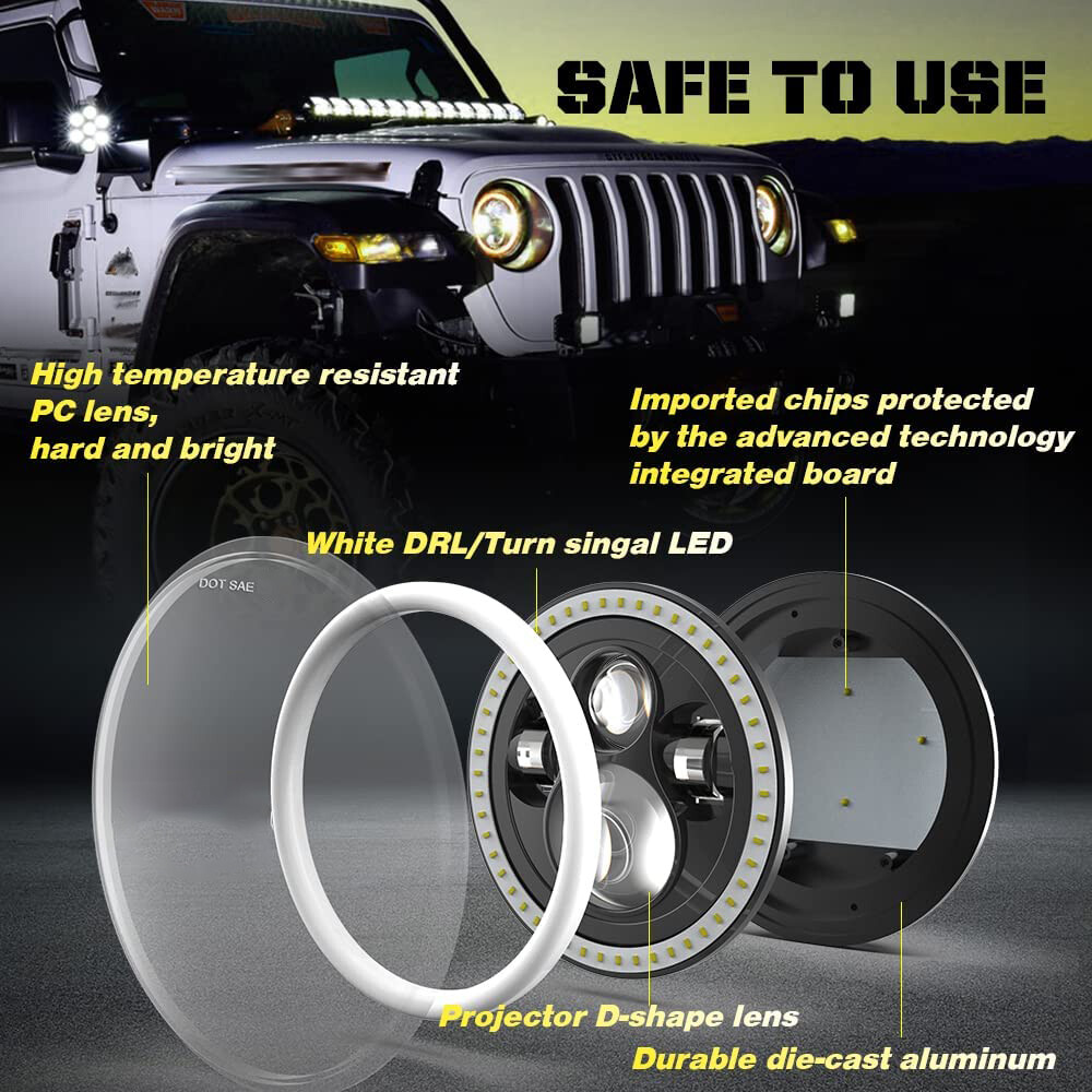 2PCS 7" Inch Round LED HEADLIGHTS Hi/Lo Beam Sealed Fit For 1965 -1973 Ford Mustang Features: * Chrome 7" Round LED Headlight with high low beam. Easy Install: 30 Minutes or Less. With a pair H4 - H13 wire adapter, fit varies vehicle with different plug. * High-Quality LED Chips:Upgrade High Power LED Source: 400% brighter than original halogen and HID factory headlight. The halo lights made with advanced LED chips to give out bright and white rays for clear visibility and broader illumination range, making your driving safe. * Excellent Heat Dissipation & Waterproof The housing of the led headlight is made with Die-cast aluminum and has high heat dissipation performance. This product is weatherproof, waterproof, energy efficient, durable and long-lasting. It can be effective against rain, snow, and heavy fog weather. Die-cast aluminum alloy heat sinks effectively extend the lifespan of the headlight to over 80,000 hours. * Main LED headlight provide cool 6000K white bright light to improve driving conditions drastically. * Low Voltage Protection, High precision Constant Current Driver Chip. * Built in Internal Fan and Integrated Cooling system Specification: Size: 7 inch Housing Color: Chrome Lighting Mode: High Beam + Low Beam Wattage: 120W/PC LED: High Intensity LEDs Voltage: DC 10-30V(fit 12V 24V vehicles) Lumens Output: 13000 LM ( High Beam), 6500 LM ( Low Beam) Waterproof Rate: IP68 Housing Material: Aluminum Color Temperature: 6000K Low Power Consumption, Life Span: 80,000Hrs. Certifications: DOT, SAE Warranty: 5 Years Package Included: 2 x Chrome 7" Round LED Headlight 2 x H4 to H13 Wire Adapters (install instruction is not included) Application: For Any Vehicle models with 7 inch Round headlight,such as: For Jeep Wagoneer (1963-1978) For Jeep CJ-7 (1976-1986) For Jeep CJ-8 Scrambler (1981-1985) For Jeep Wrangler TJ 2 Door (1997~2006) For Jeep Wrangler LJ unlimited (4 Door) (2004~2006) For Jeep Wrangler JK 2 Door (2007~2018) For Jeep Wrangler Unlimited JK 4 Door (2007~2018) For Chevy Camaro (1969-1981) For Mazda Miata MX5 MX-5 (1990-1997) For Honda Civic (1976-1981) For Ford Custom 500 (1971/1976) For Ford F100 Pikcup (1969-1974) For Ford F150 (1975-1979) For Toyota Corolla (1969-1980) For Toyota LandCruiser (1979-1987) For Toyota Pickup (1979-1981) For Oldsmobile Omega (1974-1979) For Plymouth Barracuda (1964-1974) For Plymouth Valiant (1963-1976) For Land Rover Defender 90 (1997) For Land Rover Defender 90 (1995) For Land RoverRange Rover County Classic Sport Utility 4-Door 1995 For Land Rover Range Rover (1987-1995) For Jeep Wrangler (1997-2015) For Land Rover 90/110 1983 to 1991 (including 2.5N/A, 2.5 Turbo, V8) For Land Rover 90/110 Defender 200 Tdi For Land Rover 90/110 Defender 300 Tdi For Land Rover 90/110 Defender Td5 For Land Rover 90/110 Tdci For Hummer H1 H2 (2003~2009) (H2 needs 9007 male to H4 female adapter, package not included) For Lada 4x4 urban Niva For UAZ Hunter For Suzuki Samurai For Kenworth T-2000 1998-2010(Buyer Note, Our Headlight plug is H4,H4-H13) For Puch G and Mercedes G models For 1990-1997 Mazda Miata For 1976-1977 Mazda Mizer For 1979-1985 Mazda RX-7 For 1976-1977 Mazda 808
