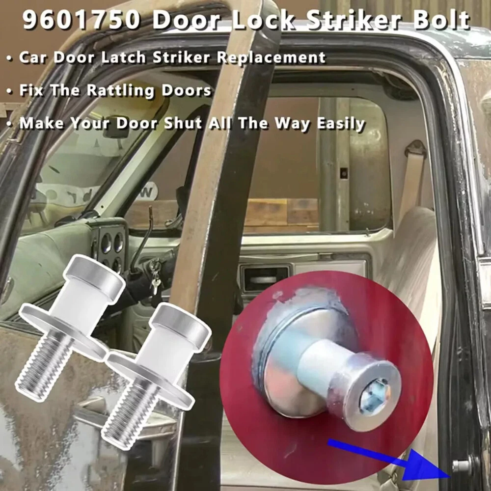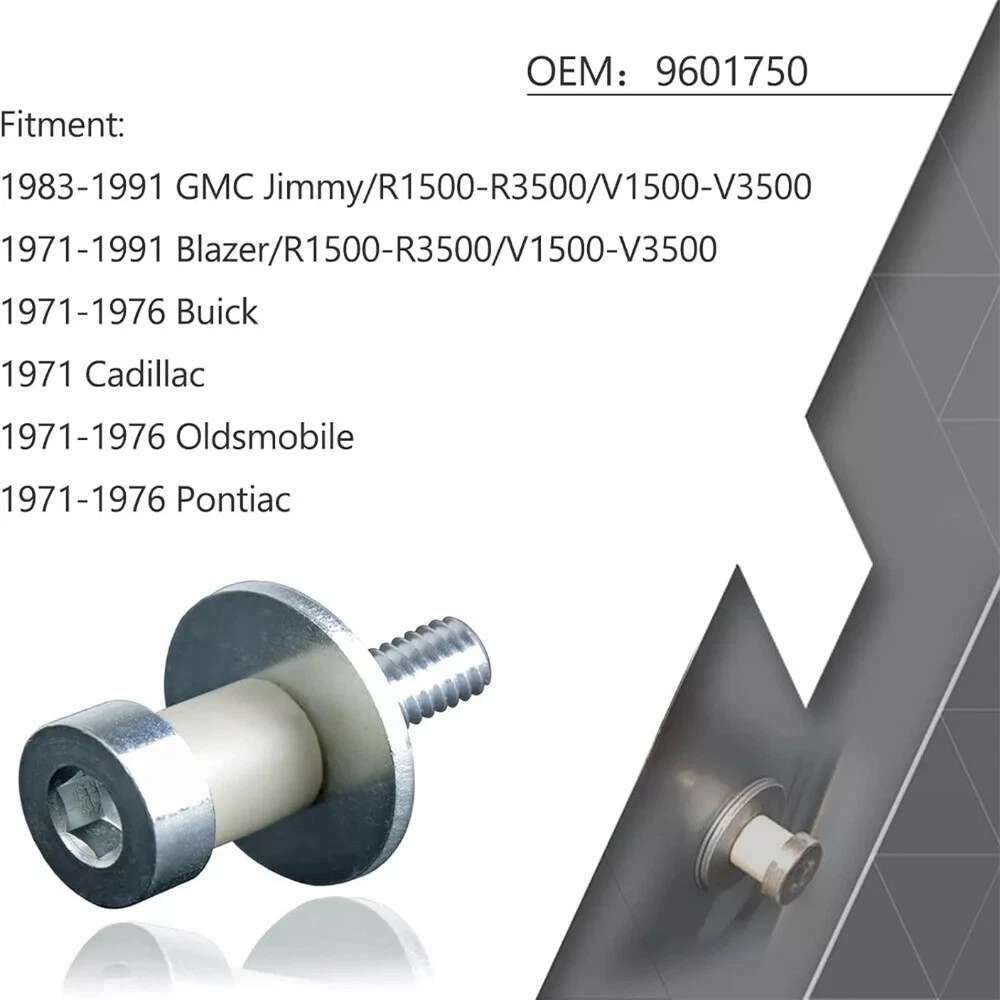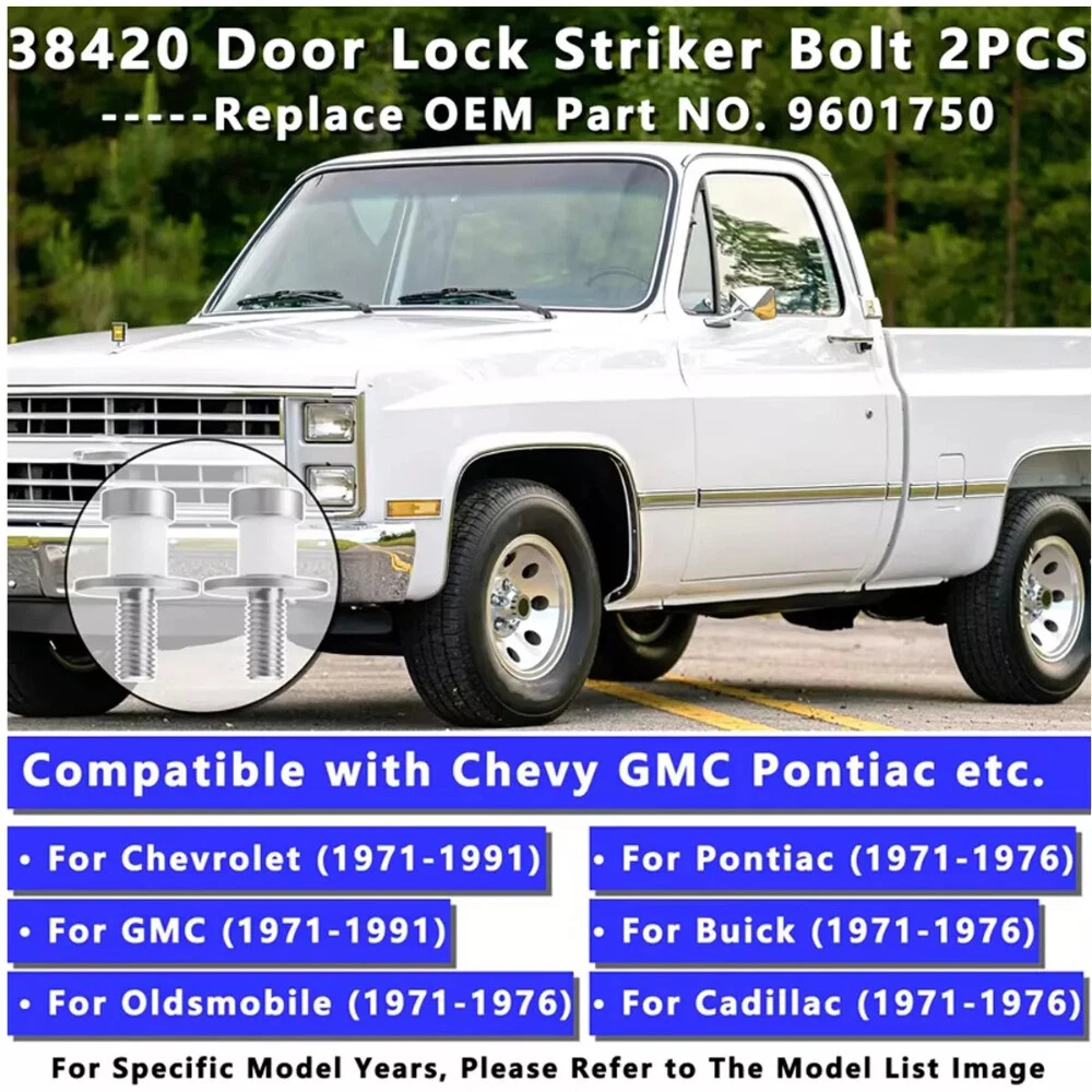 About this item **The plastic around the striker bolt that the catch couples with wears away and/or gets brittle over time and once that plastic ring fails, the door latch rattles. **If the doors rattle over bumps and needed to be weight slammed to latch, it's time to replace your door lock striker, make it shut like a new one. **2 complete part in 1 enclosed pack, door lock striker come with the plastic bushing wrap, included 2 washer, 2 door lock bolt, 2 plastic tubular spacer. **Cheaper, UNIGT door lock striker pin made of high-quality Steel Material, Painted for added resistance to rust and corrosion. **Easy to install, simple solution to the door closing problem. Specifications: Condition: New Type: Door Lock Strikers OE Part Number: 9601750 Placement on Vehicle: Left, Right, Front, Rear Package Includes: 2x Door Latch Lock Striker Bolts To Fit: For 1971-1987 Chevy GMC Truck Blazer Detailed Vehicle Applications: Buick Centurion 1971, 1972 and 1973 Buick Century 1973, 1974, 1975 and 1976 Buick Electra 1971, 1972, 1973, 1974, 1975 and 1976 Buick Estate Wagon 1971, 1972, 1973, 1974, 1975 and 1976 Buick LeSabre 1971, 1972, 1973, 1974, 1975 and 1976. Buick Regal 1973, 1974, 1975 and 1976 Buick Riviera 1971, 1972, 1973, 1974, 1975 and 1976 Cadillac Calais 1971, 1972, 1973, 1974, 1975 and 1976 Cadillac DeVille 1971, 1972, 1973, 1974, 1975 and 1976 Cadillac Eldorado 1971, 1972, 1973, 1974, 1975 and 1976 Cadillac Fleetwood 1971, 1972, 1973, 1974, 1975 and 1976 Chevrolet Bel Air 1971, 1972, 1973, 1974 and 1975 Chevrolet Biscayne 1971 and 1972 Chevrolet Blazer 1971, 1972, 1973, 1974, 1975, 1976, 1977, 1978, 1979, 1980, 1981, 1982, 1983, 1984, 1985, 1986 and 1987 Chevrolet Blazer 1988, 1989, 1990 and 1991 Chevrolet Brookwood 1971 and 1972 Chevrolet C10 1975, 1976, 1977, 1978, 1979, 1980, 1981, 1982, 1983, 1984, 1985 and 1986 Chevrolet C20 1975, 1976, 1977, 1978, 1979, 1980, 1981, 1982, 1983, 1984, 1985 and 1986 Chevrolet C30 1975, 1976, 1977, 1978, 1979, 1980, 1981, 1982, 1983, 1984, 1985 and 1986 Chevrolet Caprice 1971, 1972, 1973, 1974, 1975 and 1976 Chevrolet Chevelle 1973 Chevrolet El Camino 1973, 1974, 1975 and 1976 Chevrolet Impala 1971, 1972, 1973, 1974, 1975 and 1976 Chevrolet K10 1975, 1976, 1977, 1978, 1979, 1980, 1981, 1982, 1983, 1984, 1985 and 1986 Chevrolet K20 1975, 1976, 1977, 1978, 1979, 1980, 1981, 1982, 1983, 1984, 1985 and 1986 Chevrolet K30 1977, 1978, 1979, 1980, 1981, 1982, 1983, 1984, 1985 and 1986 Chevrolet Kingswood 1971 and 1972 Chevrolet Laguna 1973, 1974, 1975 and 1976 Chevrolet Malibu 1973 Chevrolet Monte Carlo 1973, 1974, 1975 and 1976 Chevrolet R10 Suburban 1987 and 1988 Except Back Cargo Door Chevrolet R2500 1989 Chevrolet R3500 1989, 1990 and 1991 Chevrolet V10 Suburban 1987 and 1988 Except Back Cargo Door Chevrolet V3500 1989, 1990 and 1991 GMC C1500 1979, 1980, 1981, 1982, 1983, 1984, 1985, 1986, 1987 GMC C1500 Suburban 1979, 1980, 1981, 1982, 1983, 1984, 1985 and 1986 Except Back Cargo Door GMC C2500 1979, 1980, 1981, 1982, 1983, 1984, 1985, 1986, 1987 GMC C2500 Suburban 1979, 1980, 1981, 1982, 1983, 1984, 1985 and 1986 Except Back Cargo Door GMC C3500 1979, 1980, 1981, 1982, 1983, 1984, 1985, 1986, 1987 GMC Jimmy 1971, 1972, 1973, 1974, 1975, 1976, 1977, 1978, 1979, 1980, 1981, 1982, 1983, 1984, 1985, 1986, 1987, 1988, 1989, 1990 and 1991 GMC K1500 1979, 1980, 1981, 1982, 1983, 1984, 1985, 1986, 1987 GMC K1500 Suburban 1979, 1980, 1981, 1982, 1983, 1984, 1985 and 1986 Except Back Cargo Door GMC K2500 1979, 1980, 1981, 1982, 1983, 1984, 1985, 1986, 1987 GMC K2500 Suburban 1979, 1980, 1981, 1982, 1983, 1984, 1985 and 1986 Except Back Cargo Door GMC K3500 1979, 1980, 1981, 1982, 1983, 1984, 1985, 1986, 1987 GMC R1500 1987 GMC R1500 Suburban 1987, 1988, 1989, 1990 and 1991 Except Back Cargo Door GMC R2500 1987, 1988 and 1989 GMC R2500 Suburban 1987, 1988, 1989, 1990 and 1991 Except Back Cargo Door GMC R3500 1987, 1988, 1989, 1990 and 1991 GMC V1500 1987 GMC V1500 Suburban 1987, 1988, 1989, 1990 and 1991 Except Back Cargo Door GMC V2500 1987 GMC V2500 Suburban 1987, 1988, 1989, 1990 and 1991 Except Back Cargo Door GMC V3500 1987, 1988, 1989, 1990,1991 Oldsmobile 98 1971, 1972, 1973, 1974, 1975,1976 Oldsmobile 442 1971 Oldsmobile Custom Cruiser 1971, 1972, 1973, 1974, 1975,1976 Oldsmobile Cutlass 1971, 1972, 1973, 1974, 1975,1976 Oldsmobile Cutlass Supreme 1971, 1972, 1973, 1974, 1975,1976 Oldsmobile Delta 88 1971, 1972, 1973, 1974, 1975,1976 Oldsmobile Omega 1973, 1974 and 1975 Oldsmobile Starfire 1975 Oldsmobile Toronado 1971, 1972, 1973, 1974, 1975, 1976 Oldsmobile Vista Cruiser 1971, 1972, 1973, 1974, 1975, 1976 Pontiac Bonneville 1971, 1972, 1973, 1974, 1975, 1976 Pontiac Catalina 1971, 1972, 1973, 1974, 1975, 1976 Pontiac Grand Am 1973, 1974, 1975 Pontiac Grand Lemans 1975, 1976 Pontiac Grand Prix 1973, 1974, 1975, 1976 Pontiac Grand Safari 1971, 1972, 1973, 1974, 1975, 1976 Pontiac Grandville 1971, 1972, 1973, 1974 ,1975 Pontiac Lemans 1973, 1974, 1975, 1976