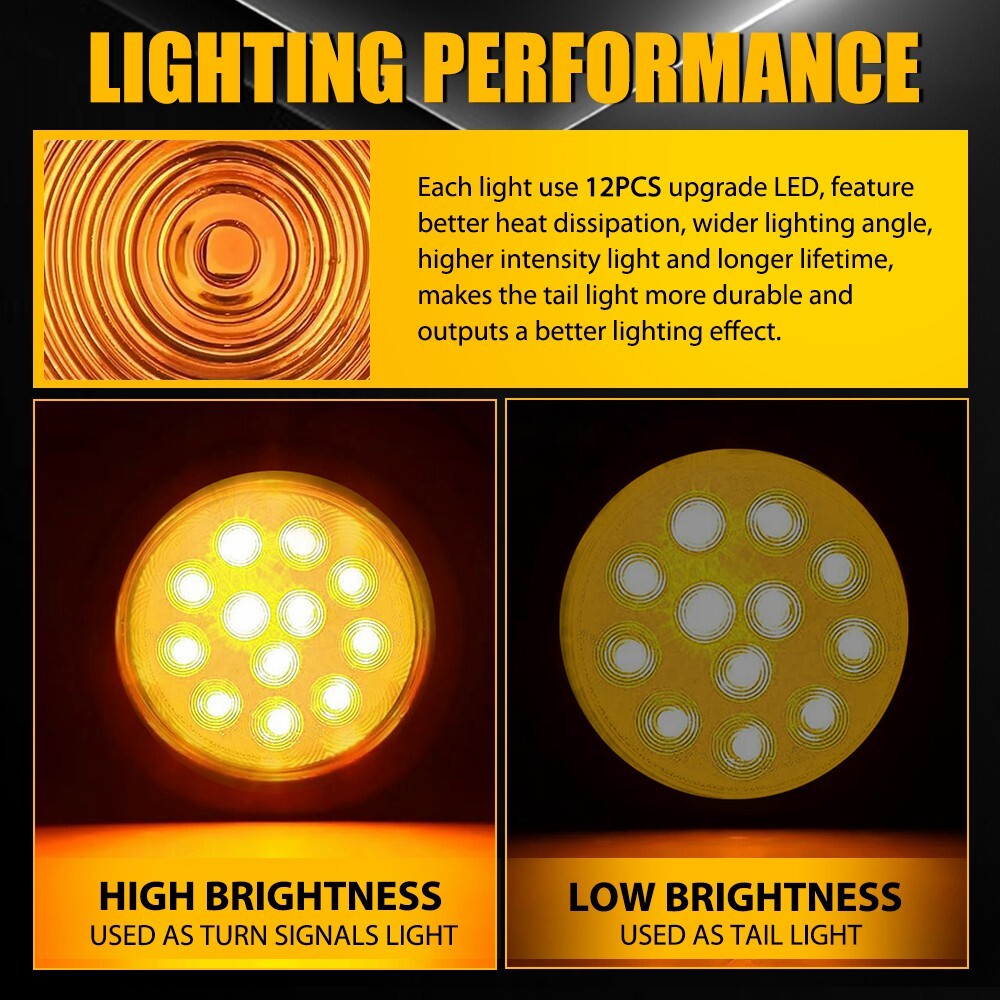 Specification Light color:Amber Shell diameter:4 inches Material:ABS+PC+Rubber+Metal LED quantity:12LED Voltage:12v Waterproof grade:IP67 Service life:50000h+ Features: *Upgraded LED: Each lamp consists of 3030 SMD LED chips with wider lighting angle and better heat dissipation. It is 3 times brighter than other products. *Waterproof: The tail light is highly silicon sealed with an IP67 waterproof rating, which works even under extreme conditions such as rain and snow. *Easy to install: Easy installation with direct replacement, other modifications are not required. *Unique design 2PCS Amber 4Inch Round Tail Lights w/ Mounting Bracket Trailer Lights for Truck Specification Light color:Amber Shell diameter:4 inches Material:ABS+PC+Rubber+Metal LED quantity:12LED Voltage:12v Waterproof grade:IP67 Service life:50000h+ Features: *Upgraded LED: Each lamp consists of 3030 SMD LED chips with wider lighting angle and better heat dissipation. It is 3 times brighter than other products. *Waterproof: The tail light is highly silicon sealed with an IP67 waterproof rating, which works even under extreme conditions such as rain and snow. *Easy to install: Easy installation with direct replacement, other modifications are not required. *Unique design The groove inside the ring has been upgarded, adding three bumps to make the connection between the ring and the taillight tightly.These help the tailights not to fall out and can be firmly fixed the seal ring installed on the mounting bracket.You don't need to worry about the loose lights or wires anymore! *Connection White wire connects to negative. Red wire connects to amber light with high brightness Black wire connects to amber light with low brightness *Functions It can be used as running lights, brake lights, taillights and so on. *Wide application: Universal Fits All vehicles with 12V Power Supply such as car, truck, trailer, Semi Trailer, Semi Trucks, boat, flatbed, bus, lorry, van, caravan, camper, RV Jeep etc. Note: Please check the detail information carefully before purchasing. Your satisfaction is our utmost concern, please feel free to contact us for any questions and concerns. Package Include: 4Inch Tail Lights w/ Mounting Bracket*2 Item Specifics Brand AUXITO Performance Part Yes Brand AUXITO Lens Color Amber Light Color Amber Manufacturer Part Number Does Not Apply Material ABS PC Placement on Vehicle Rear Diameter 4 inches Voltage 12 V Warranty 1 Year Waterproof IP67 Package Include tail light*2 Lighting Technology LED Housing Color Black Type Tail Light Assembly Items Included Bulbs Features Sealed Assembly Vintage Car Part No Mounting Style Screws Performance Part Yes Universal Fitment Yes Manufacturer Warranty 1 Year Finish Smooth Functions running lights, brake lights, taillights and so on Model Fits All vehicles with 12V Power Supply Payment We can accept payment by credit, debit, and gift cards; Apple Pay, Google Pay, PayPal, and PayPal Credit. Shipping 1. All items will be shipped in 24 hours after receiving your payment . 2. We ship this item to US only via USPS first class mail. It usually takes 3-5 working days to deliver. Returns 1. We offer 60 days return policy. 2. Please contact us within 60 days from the date you receive your package if you have any questions with the products . 3. Refund will be sent after we got your returned package. 4. All returned items should be in the original packaging with tracking number. Contact Us We work from Monday - Saturday 9:00AM - 6:00PM PST, but we will reply you once we get your message .There will be some delay on response if you send message or E-Mail on Sunday. DESCRIPTION PAYMENT SHIPPING RETURN POLICY CONTACT US Hot item Help & Info Payment Policy Shipping Policy Return Policy FAQ About Us 2PCS Amber 4Inch Round Tail Lights w/ Mounting Bracket Trailer Lights for Truck Specification Light color:Amber Shell diameter:4 inches Material:ABS+PC+Rubber+Metal LED quantity:12LED Voltage:12v Waterproof grade:IP67 Service life:50000h+ Features: *Upgraded LED: Each lamp consists of 3030 SMD LED chips with wider lighting angle and better heat dissipation. It is 3 times brighter than other products. *Waterproof: The tail light is highly silicon sealed with an IP67 waterproof rating, which works even under extreme conditions such as rain and snow. *Easy to install: Easy installation with direct replacement, other modifications are not required. *Unique design The groove inside the ring has been upgarded, adding three bumps to make the connection between the ring and the taillight tightly.These help the tailights not to fall out and can be firmly fixed the seal ring installed on the mounting bracket.You don't need to worry about the loose lights or wires anymore! *Connection White wire connects to negative. Red wire connects to amber light with high brightness Black wire connects to amber light with low brightness *Functions It can be used as running lights, brake lights, taillights and so on. *Wide application: Universal Fits All vehicles with 12V Power Supply such as car, truck, trailer, Semi Trailer, Semi Trucks, boat, flatbed, bus, lorry, van, caravan, camper, RV Jeep etc. Note: Please check the detail information carefully before purchasing. Your satisfaction is our utmost concern, please feel free to contact us for any questions and concerns. Package Include: 4Inch Tail Lights w/ Mounting Bracket*2 Payment Shipping Returns Contact Us We can accept payment by credit, debit, and gift cards; Apple Pay, Google Pay, PayPal, and PayPal Credit. 1. All items will be shipped in 24 hours after receiving your payment . 2. We ship this item to US only via USPS first class mail. It usually takes 3-5 working days to deliver. 1. We offer 60 days return policy. 2. Please contact us within 60 days from the date you receive your package if you have any questions with the products . 3. Refund will be sent after we got your returned package. 4. All returned items should be in the original packaging with trackin