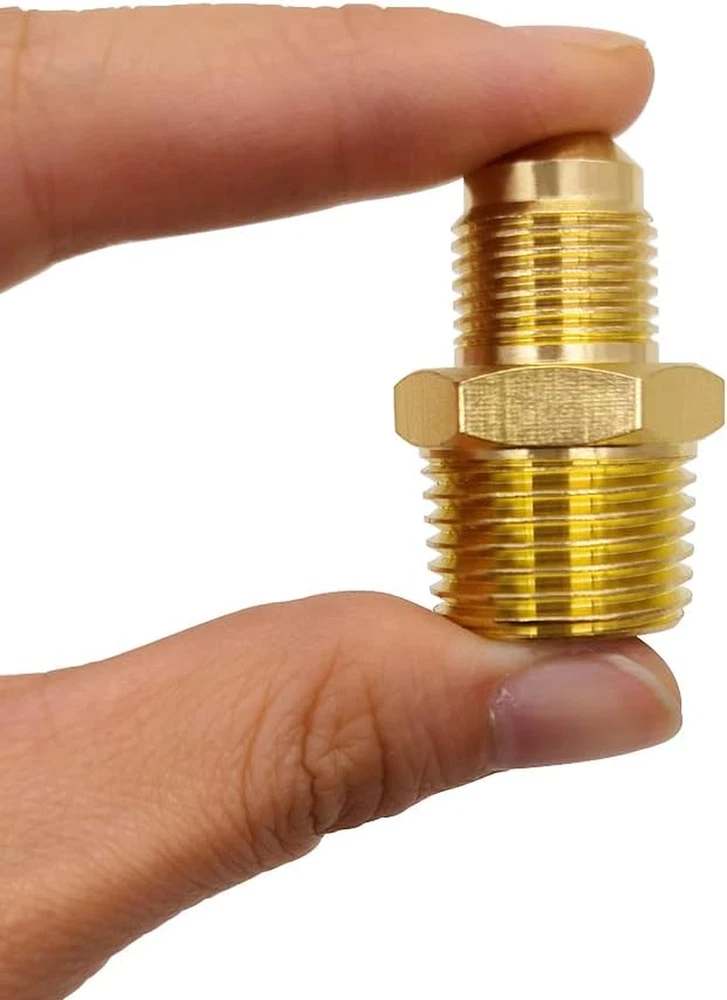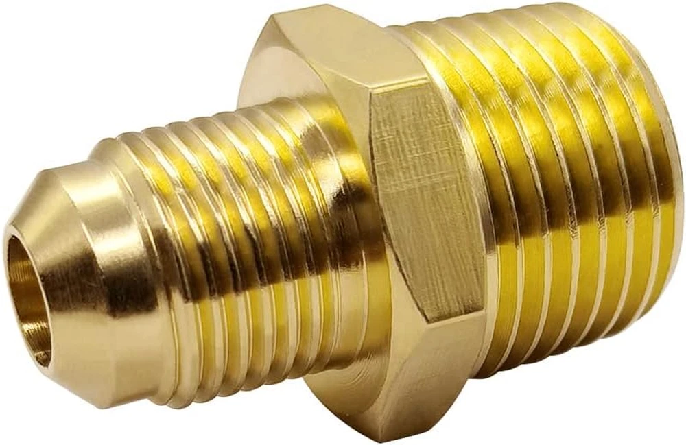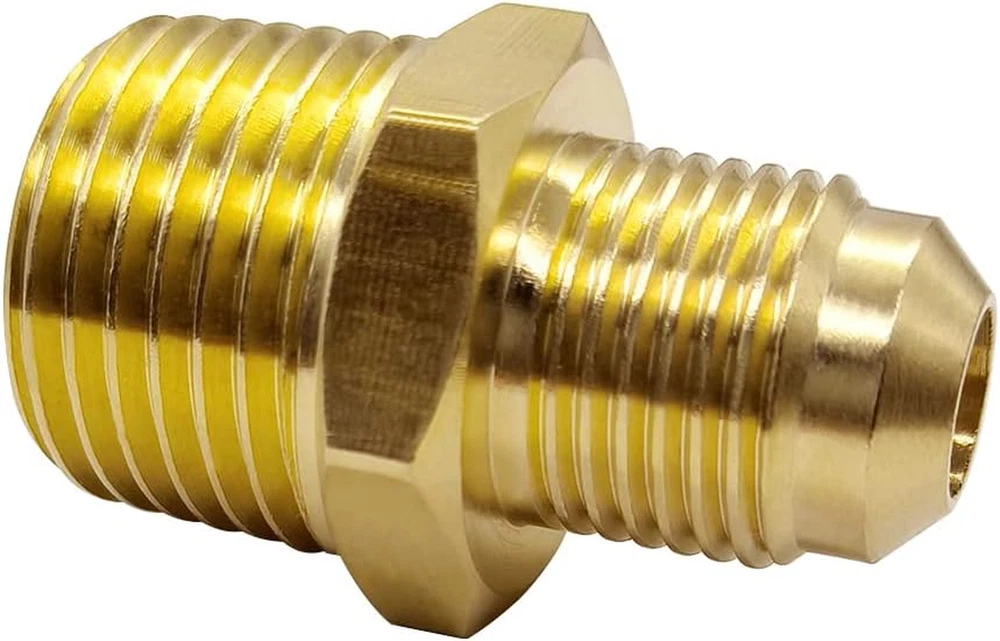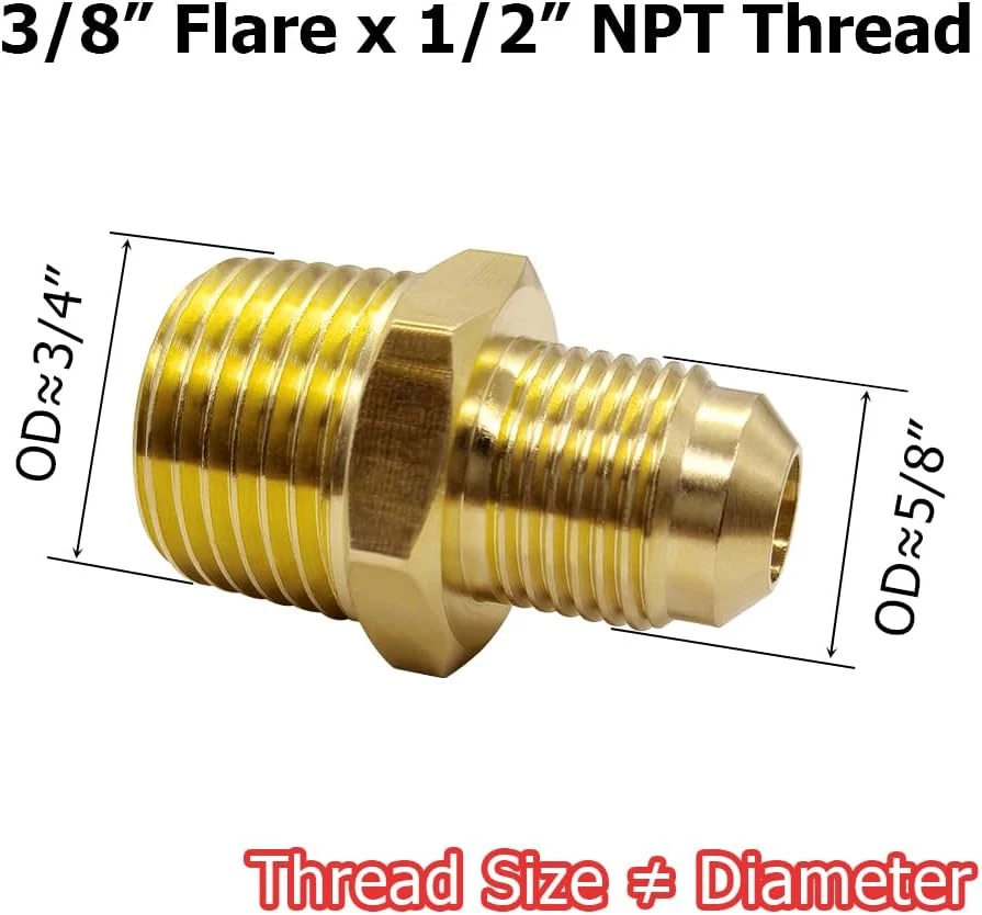 SIZE - 3/8" Flare x 1/2" NPT Male. (O.D. x O.D. about 5/8" x 3/4") Note: Thread size does not represent the actual diameter. FIRM & DURABLE - Heavy Duty Brass for corrosion resistance, high temperature ductility and low magnetic permeability. EASY TO INSTALL - Half union for connecting and disconnecting two tubes more easily than with couplings. WIDELY USE - The Flare threaded connects to a flared tube or fitting, and is suitable for use with fuel and gas systems, plumbing, refrigeration, and vacuum applications. WORKING TEMPERATURE - Range from -53°C to 121°C (-65 to 250 Degree F). Product Description Good Performance Easy to disassemble no flaring tool required. The Flare threaded connects to a flared tube or fitting, and is suitable for use with fuel and gas systems. These fittings are precision machined and have tighter, deeper and smoother threads than conventional products, making work easier and more efficient. When purchasing fittings,please make a choice according to the correct size and corresponding application. Firmer than Iron and Iron Galvanized Products More Robust and Durable than Castings Easy to Connect Flare Fittings, No Need to Weld. Premium brass made Heater resistance Anti-corrosion Longer service life Thread Size 3/8" Male Flare series Features Flare Fitting, Threaded Screw Material Solid Brass,Rust Resistant, Leak Resistant Application Hydraulic, Plumbing, Refrigeration, Vacuum, Pneumatic Systems,RV Temperature Range -65°F to +250°F (-53°C to +121°C) Wide Application Hydraulic Applications Natural Gas Refrigeration Equipment RV Camping