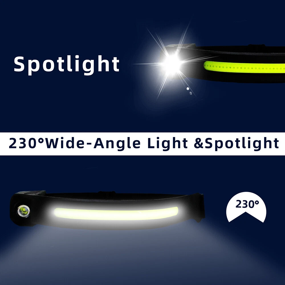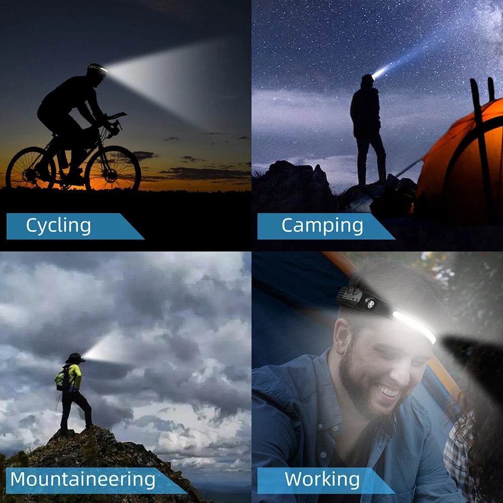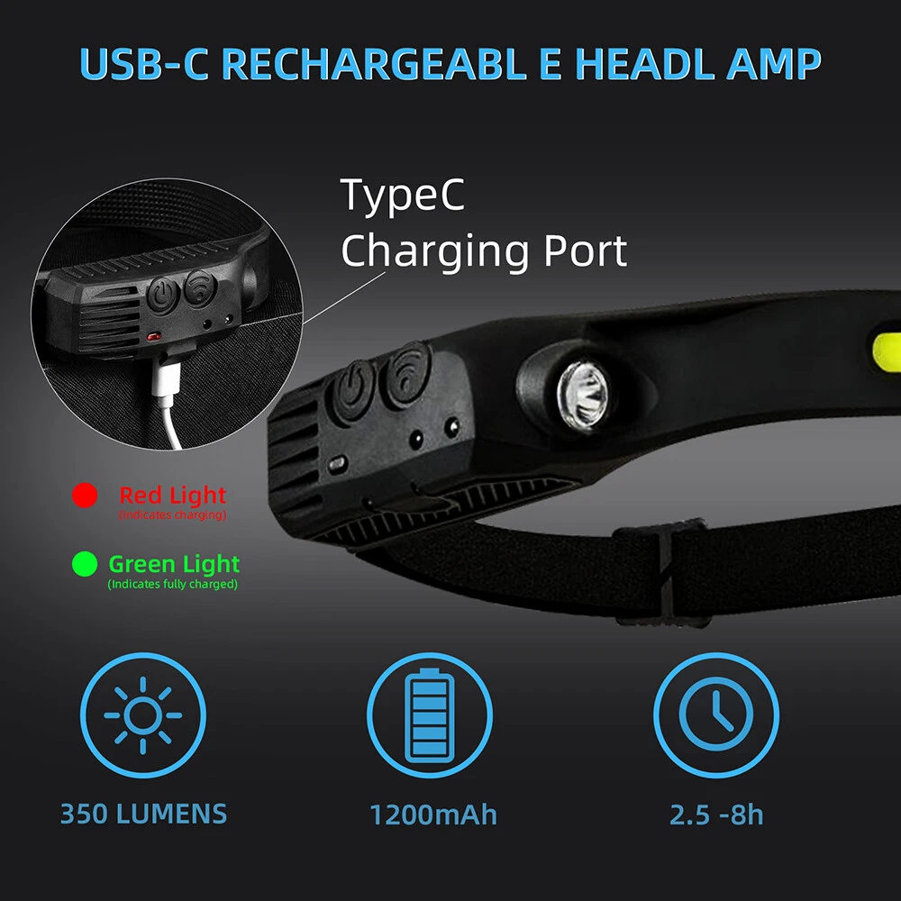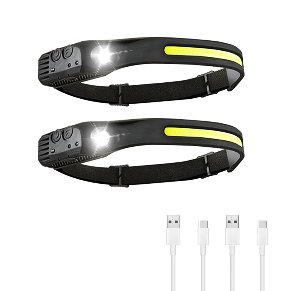 Not e : Only supports 5V 2A chargers. Do not use fast charging, as it may damage the battery of the headlights, leading to inability to charge or use. Description : Hands Free: Thanks to the built-in motion sensor, our rechargeable headlight can be easily turned on/off by waving your hand by running the side of the headlight. First turn on the main switch, adjust to the light you need, then turn on the sensor switch for a few seconds to activate the motion detection mode. When your hands are oily or dirty or you are wearing gloves, the sensor mode will perfectly solve the trouble of needing to touch the button for you. Built-in Battery: The headlamp built-in 1200mAh rechargeable lithium battery, Type-C USB charging cable included. Fully charged the rechargeable LED head torch for 2.5 hours and use up to 6-8 hours(depends on the light mode you use). Comfortable and lightweight: The weight of the headlight is only 100 grams, so you can easily wear it on your head without pressure. Adjustable bands to satisfy people from different head circumference, it will provide the maximum comfort. Different modes of flashlights can meet the light needs of different scenes, which is one of the must -have tools for the family. Multifunctional Usages: Head Torches LED Super bright Rechargeable extremely suitable for jogging , cycling , camping,fishing head torch and other long time night activities. Only supports 5V 2A chargers. Package included: 2x COB headlamps