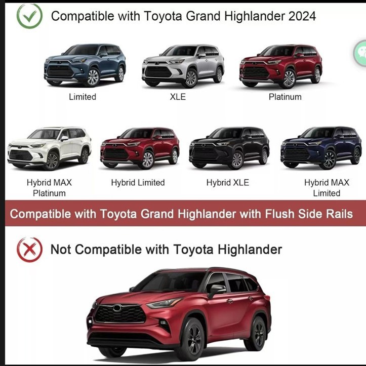 ROADLINKER - Welcome to my store Store Home New Listings Featured Deals See All Reviews About Us Contact Us WHY SHOP WITH US? FAST SHIPPING Usually delivered in 5-7 working days HIGH QUALITY All products are quality controlled EXCELLENT SERVICE Everyday 9:00 AM - 10:30 PM CST RETURN POLICY Free returns and exchanges within 30 days AFTER-SALES GUARANTEE 1 Year Warranty Must Read Before Order For many cars, we need to confirm whether fit or not, and send message to confirm, so please pay more attention on Ebay messages. If any install problem, please contact us first before make a return, we will try our best to solve your problem. Thanks!! Description Item Includes: 2PCS Crossbars + Screws Fits For: Toyota Grand Highlander 2024-2026, Models with Flush-mounted Roof Rails Material: High Quality Aluminum Color: Black Installation: With Installation Instruction, Easy to Install and Remove Weight Capacity: Dynamic load-bearing capacity 75kgs/165lbs & Static load-bearing capacity 300kgs/661lbs STORE CATEGORIES Crossbars Roof Racks Side Steps Electric Tailgate Rear Spoiler Roof Platform Roof Light Side Ladder Gear Box Door Trim Truck Ladder Truck Cover Portable Tent others SHIPPING 1.PO BOX/ HC BOX/ APO/ FPO address can't be delivered. Please provide your physical address and the courier will deliver the goods to your door. 2.We will send the items within 5 Days once system confirms buyer's payment. 3.Expediated shipping such as FedEx, DHL, UPS Or SF EXPRESS used, 5-7 working days for formal order, but the specific delivery time depends on destination and other factors. 4.Our price only includes prepaid shipping cost + item cost. Import duties/tariff, tax and other charges are maybe charged according to different countries policies, the charges are on buyer's cccount. 5.If the package arrives damaged , please refuse the shipment, or report to us within 5 days upon receipt. Please keep the broken package for evidence. PAYMENT 1.Please complete your payment within 5 days after the offer is accepted. If you have difficulty completing your payment within the required time, please contact us. 2.If the parcel returns back to us due to the buyer refuse to pay import duties/tariff, tax fees, we will not send the parcel again unless the buyer completes those fees and pay all the return and resend cost. The buyer can not cancel the order or request a refund due to this reason. RETURN POLICY 1.We accept return within 30 days after receipt of the item. Please make sure item is in original package, with no signs of use, and that all accessories are complete. 2.We will issue full refund when our warehouse receive the returned item which in good condition. 3.For any defective or damaged item, we will provide full refund or replacement. ABOUT US 【Experience & Expertise】For over a decade, we've been your trusted partner in auto parts and online sales. We offer a wide range of auto parts and accessories, backed by expert technical support. 【Support & Solutions】Our dedicated customer service team and engineers are always ready to help. We provide friendly and knowledgeable support, guiding you smoothly from pre-sales questions to after-sales care. 【Partnership & Value】Looking for wholesale opportunities? Let's discuss how we can help your business succeed! We offer competitive wholesale pricing designed just for partners like you.