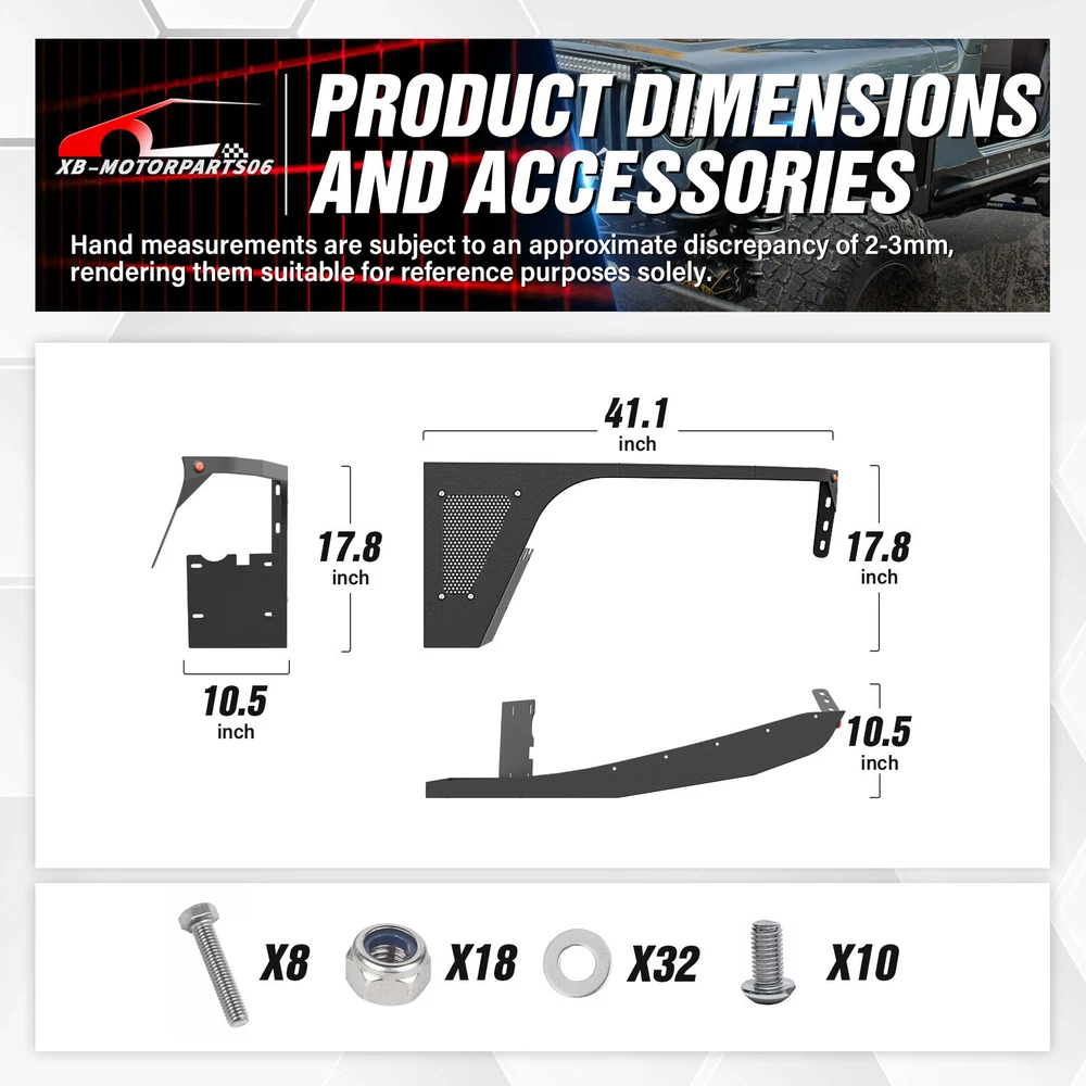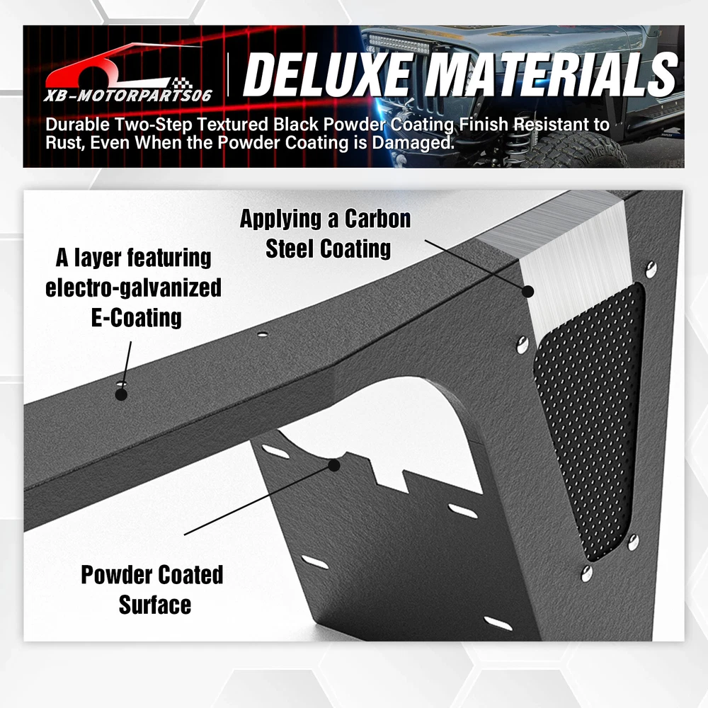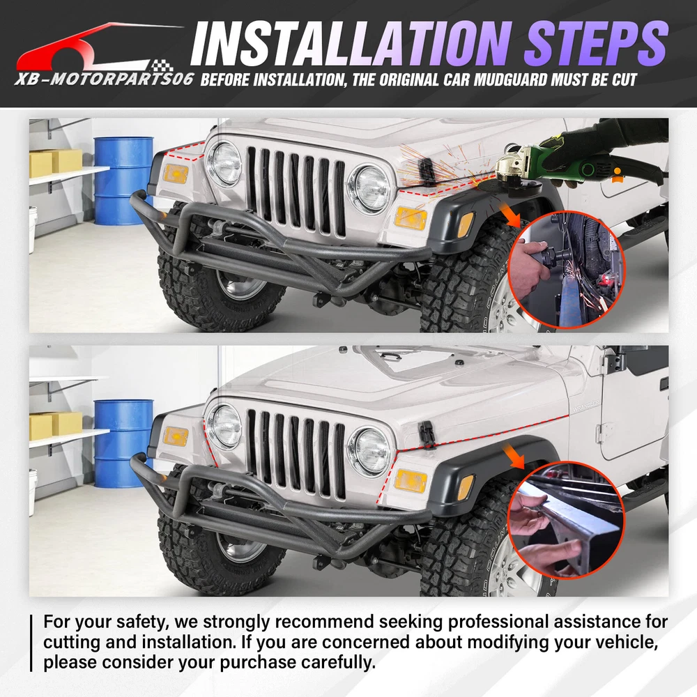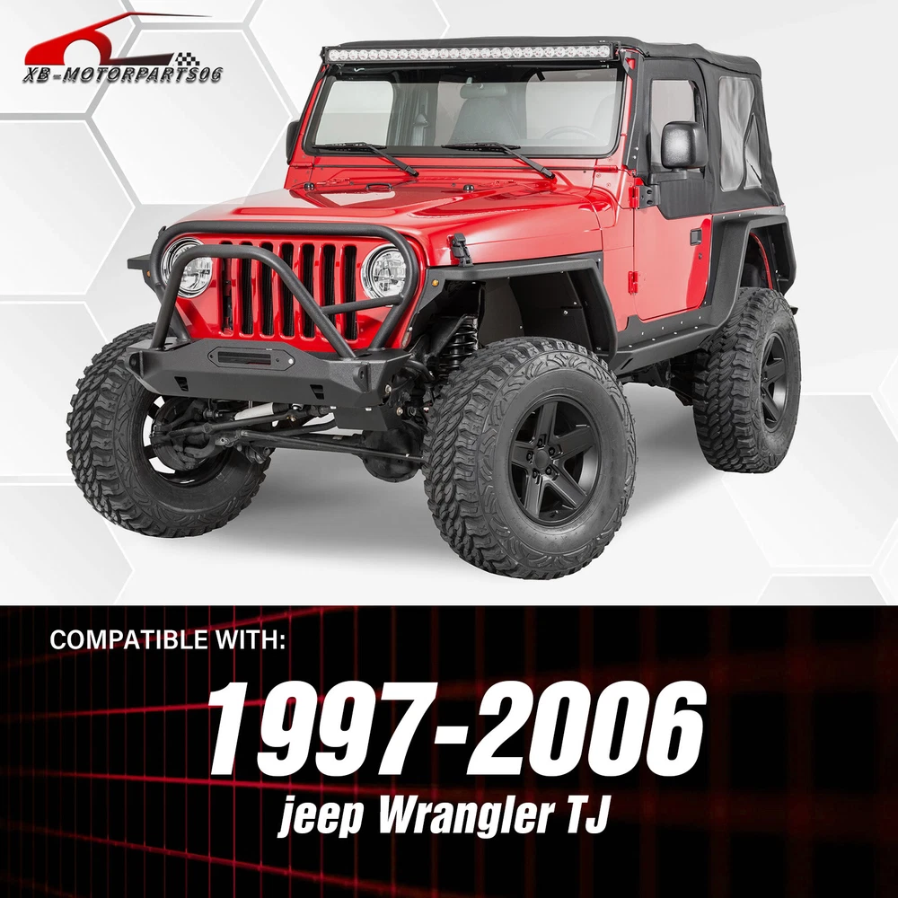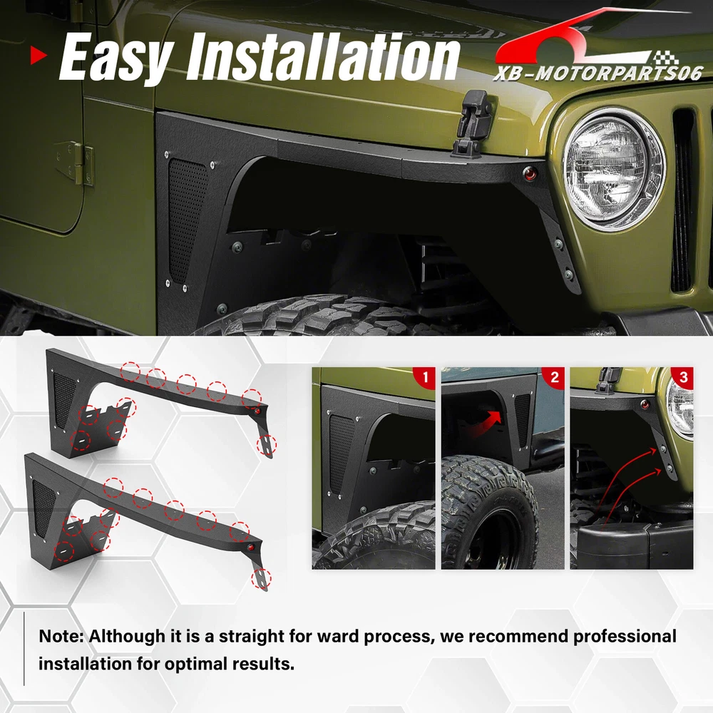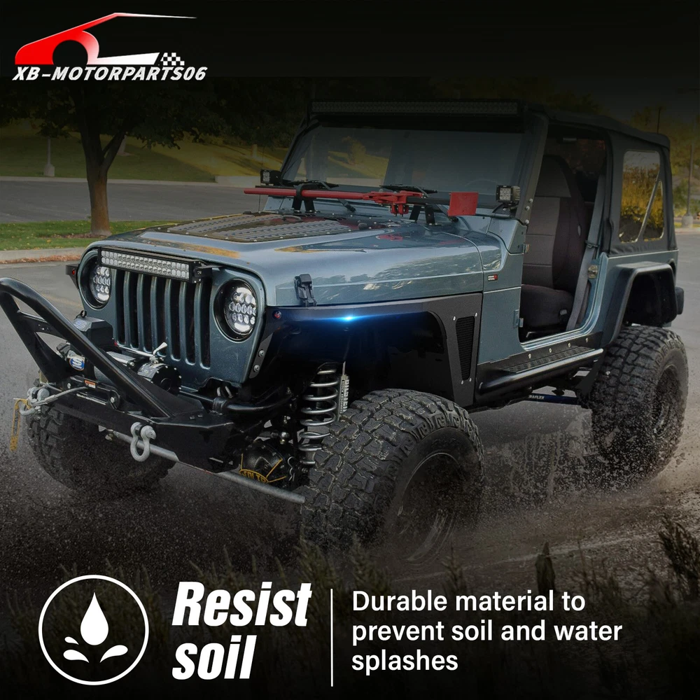 2PCS Flat Front Fender Flares Kit For 1997-2006 Jeep Wrangler TJ & 2004-2006 LJ Suitable Models : Compatible with 1997-2006 Jeep Wrangler TJ & 2004-2006 Jeep Wrangler LJ Package Includes : 2 front fender flares, installation instructions, and screw fittings Product Information : Product Dimensions : Please see the size picture Package Dimensions : 44.49 x 18.70 x 15.35 inches Installation mode : Bolt-on Exterior Finish : Powder Coated Placement on Vehicle : Left and Right Item Weight : 35.2 pounds Material : Carbon Steel Color : Black (hand measurements may have an error of 2-3 mm/0.078-0.118 in) Feature : ① Our fender flares are made from sturdy stainless steel and feature a tough black powder coating. They offer dependable protection for your wheel wells, guarding against mud, scratches, sand, and other external damages; ② It can be easily installed with simple bolts, without the need for drilling. While the process is relatively simple, we strongly advise seeking professional installation for the best possible outcome; Warranty Period : 1 year Payment Shipping Standard Shipping (FedEx Ground or FedEx Home Delivery). Terms of Sale Will usually ship within 3 business days of receiving cleared payment. Suitable Models : Compatible with 1997-2006 Jeep Wrangler TJ & 2004-2006 Jeep Wrangler LJ Package Includes : 2 front fender flares, installation instructions, and screw fittings Product Information : Product Dimensions : Please see the size picture Package Dimensions : 44.49 x 18.70 x 15.35 inches Installation mode : Bolt-on Exterior Finish : Powder Coated Placement on Vehicle : Left and Right Item Weight : 35.2 pounds Material : Carbon Steel Color : Black (hand measurements may have an error of 2-3 mm/0.078-0.118 in) Feature : ① Our fender flares are made from sturdy stainless steel and feature a tough black powder coating. They offer dependable protection for your wheel wells, guarding against mud, scratches, sand, and other external damages; ② It can be easily installed with simple bolts, without the need for drilling. While the process is relatively simple, we strongly advise seeking professional installation for the best possible outcome; Warranty Period : 1 year