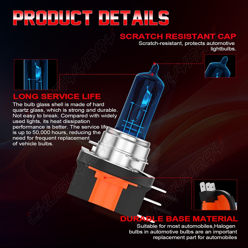 2x H15 Halogen Bulb 12v 15/55w Headlight Bulb Original Replacement. Include: 2 X H15 Halogen Light Bulbs Features: 【SUPER BRIGHT】 Our Halogen Headlight Bulb is filled with more than 45% Xenon gas to obtain a brightness of more than 2000LM(55W); Blue ion membrane filters yellow light and gets SUPER WHITE LIGHT with color temperature close to 5000K. 【LONG LIFE】 Our designer uses Anti-UV quartz glass, the thickness of glass is increased and the internal pressure is increased in order to obtain more than 50000 hours(55W) life. 【EASY TO INSTALLATION】 Our Halogen Headlight Bulb plug and play.Please wear gloves when you install! Avoid touching the bulb with bare hands! 【Light Up the Night】 Experience superior brightness compared to standard halogen bulbs, piercing through darkness for improved visibility and safer driving. 【Quality You Can Trust】 From experienced and dedicated manufacturers, these halogen bulbs deliver consistent performance and exceptional durability. 【Value for Your Money】 Invest in long-lasting quality and exceptional brightness without breaking the bank. A smart choice for all drivers Information: a)Compatible List can not show up all Car model. Please check the Correct item size of your vechicle. it will work and fit.Thank you! b)If you are unsure the item fit or not , please do remember send message to tell us your car make, model, year and other information which is helpful to check the item fit or not.For example: For 2014-2019 Mercedes CLA250 For 2014-2016 Mercedes CLA-Class For 2014-2018 Mercedes CLA45 AMG For 2015-2016 Mercedes GLA-Class For 2015-2019 Mercedes GLA250 For 2015-2019 Mercedes GLA45 AMG For 2013-2015 Mercedes GLK-Class For 2016-2019 Mercedes Metris For 2019 Mercedes Sprinter 1500/2500/3500
