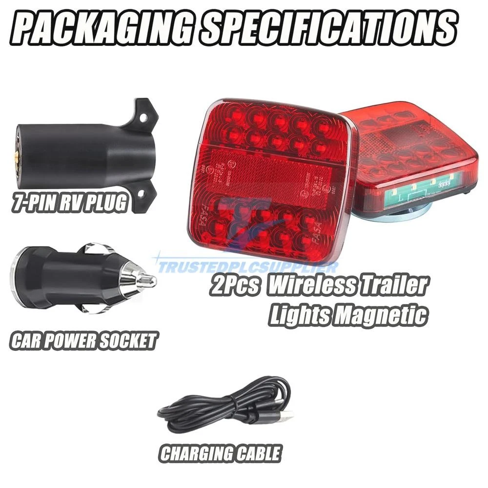 Product Description 2PCS Magnetic Wireless Tail Lights for Trailer, Wireless Trailer Lights Kit Additional application notes: 【Normal Usage Procedure】 Step 1: Insert Vehicle Plug Securely insert the trailer light plug into the vehicle's trailer socket (ensure plug and socket match). Step 2: Power On Press the power button on the back of the trailer light (press once only). The white power indicator will illuminate steadily, indicating the device is powered on. Step 3: Verify Connection Success Press the brake pedal and observe the trailer light: Red turn signals illuminate: Connection successful; normal operation. Brake lights do not illuminate: Refer to “Troubleshooting” below. 【Troubleshooting: Connection Failure】 Method: Quick Re-pairing Keep the plug connected without unplugging. While pressing the brake pedal, rapidly press the power button 3 times in quick succession (short intervals). The red turn signals will begin flashing, indicating pairing mode. Red brake light illuminates: Pairing successful, resume normal use. Red light continuously flashes: Repeat the above steps or check if the vehicle socket is supplying power. 【License Plate Light Activation】 (To conserve power) Press and hold the button for 3 seconds to activate the license plate light. 【Power Off】 Press once to power off after use. Automatically powers off after 1 hour of standby. Specification: Model Number: H37069 Product Name: Wireless Magnetic Trailer Tail Light Material: GPPS+AAS+PP+ABS+Iron Shell&Light Color: Red Light Color: Red Type: Led Tail Light Waterproof Level: IP65 Input Voltage: 5V Working frequency : 2.4GHz Radio communication range: 30 Meters Battery capacity : 3.7V ,2000 MAH Input Volts Of Transmitter: 12V Battery Life: 100% = 10hrs , 50% = 5hrs , 25%= 2hrs Charging time : 2-2.5 Hrs Standby time: 20 hours Lights Dimensions : 105 mm (4.13") x 105mm ( 4.13") x 55mm (2.17") 6 Functions: Brake light/Flasher light/Position light/License plate light/Reflector light Quantity: 1Set w/ 2 lights Fitment: For Trailers,Horse Boxes,Tractors,Boat & Jet Ski Trailers,Bike Racks , etc. Features: - No more wires! - Waterproof, strong - Each lamp has a magnet behind it for added stability. - Perfect for all trailer users especially the farmer. - Each unit has the strongest magnet on the market so you can feel confident you can drive over any terrain without having to worry if the tail light is still attached! - No tools required to attach simply set to the best area you want the light on! - Swap between vehicles and machinery in a matter of seconds. And the best bit is that you dont need any tools to attach it. (Rubber coated magnet to help prevent slipping) Package Includes: 2x LED Indicator Sealed Cluster Lights 1x Charging Adapter 1x USB Cable 1x 2.4GHz 7 Pin Transmitter Instruction Sheet Carry-On Box Note: 1.We provide clear pictures, measurements where possible. Please check as much as possible to make sure the item is the one that you need. 2. Please allow 0.5-1 inch difference due to manual measurement.(1inch=2.54cm) 3.There are no instructions included in this kit.If you want to know how to use or install it,please contact us by Email.We will provide help as much as possible. About Us Payment Shipping Returns Contact Us 1. Unless specified otherwise, all our products are IN STOCK and are shipped from USA Local warehouse - Not Overseas! 2. We provide a 30 day Satisfaction Guarantee or your money back (provided items are in the same new and resaleable condition.) 3. We have a PayPal Verified Business Account, please buy with Confidence! 4. Every item will be tesrted before send.We know our products well and if we don't have the answers we will do our best to find them for you! 5. Our friendly team look forward to serving you! Your satisfaction is our No.1 Priority We will do our best to satisfacy you. 1.Paypal, Credit Card, G Pay etc, many payment way is accepted. 2.Please be sure your shipping address is correct before make a payment. 1.We will ship out the item within 1-3 business days after comfirming the payment, appreciate your patience. 2.If the items are broken on the way(we will check the orders clearly before we sent them),please contact us in 3 days you received it. We will send you a new one or refund your payment. 1.We stand behind every buyer.Items can be returned for exchange or refund within 30 days. 2.Please contact us when you have any confusion of our item, we will solve the trouble for you as soon as possible. 1.This is professional Seller.We will reply your message within 24 hours. 2.Please contact us whenever you have any question about the item. We will deal with it as soon as possible. 3. If you are unhappy with the item or our service,please Contact Us before leave feedback,just give me a chance,thank you! About Us 1. Unless specified otherwise, all our products are IN STOCK and are shipped from USA Local warehouse - Not Overseas! 2. We provide a 30 day Satisfaction Guarantee or your money back (provided items are in the same new and resaleable condition.) 3. We have a PayPal Verified Business Account, please buy with Confidence! 4. Every item will be tesrted before send.We know our products well and if we don't have the answers we will do our best to find them for you! 5. Our friendly team look forward to serving you! Your satisfaction is our No.1 Priority We will do our best to satisfacy you. Payment 1.Paypal, Credit Card, G Pay etc, many payment way is accepted. 2.Please be sure your shipping address is correct before make a payment. Shipping 1.We will ship out the item within 1-3 business days after comfirming the payment, appreciate your patience. 2.If the items are broken on the way(we will check the orders clearly before we sent them),please contact us in 3 days you received it. We will send you a new one or refund your payment. Returns 1.We stand behind every buyer.Items can be returned for exchange or refund within 30 days. 2.Please contact us when you have any