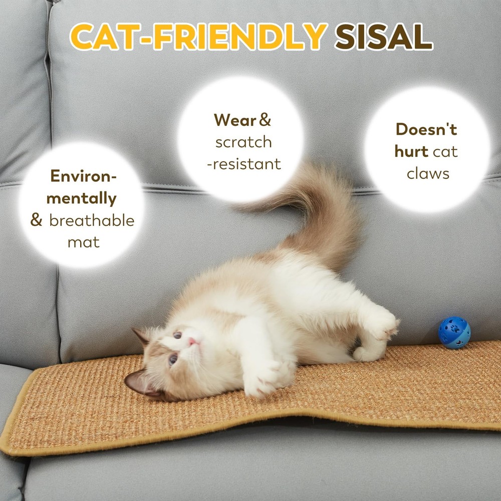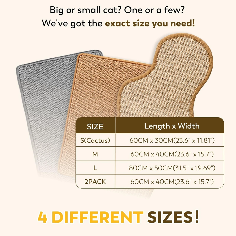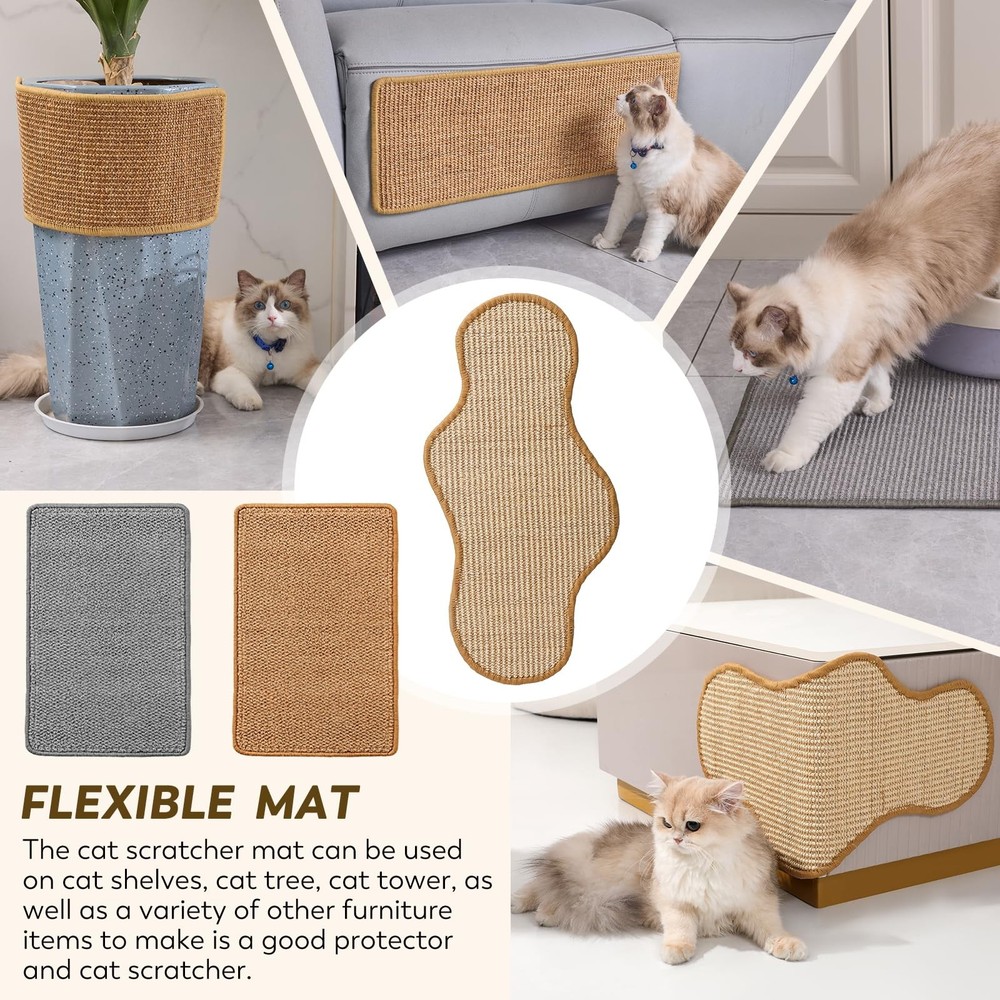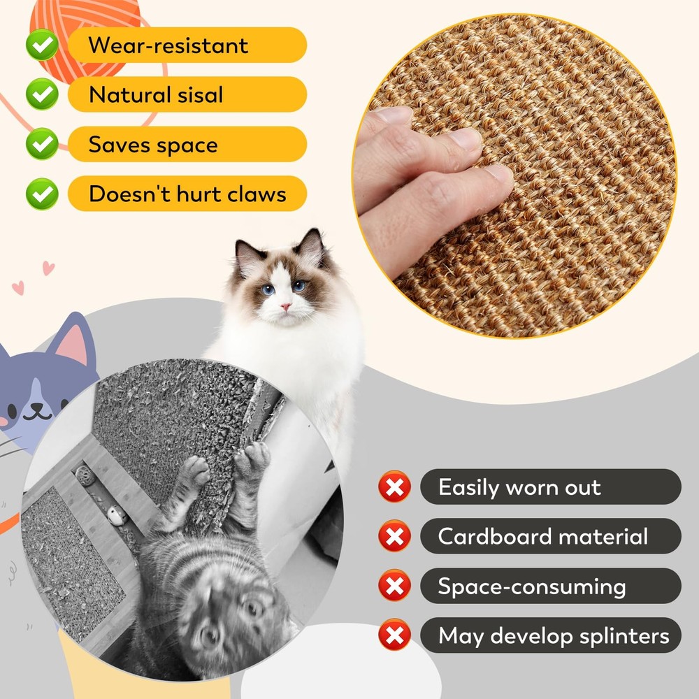 This sisal cat scratch pad is suitable for all households, offering a perfect balance of pet-friendliness and furniture protection. It provides your cat with a healthy scratching outlet while preserving the beauty of your home. Natural Sisal Material: The scratch pad is made from durable and eco-friendly sisal, which not only satisfies a cat's natural scratching instinct but is also environmentally friendly. Furniture Protection: By directing your cat’s scratching to a designated area, the scratch pad helps protect your sofa, chairs, and other furniture from claw marks, extending the life of your furniture. Includes and Damage-Free Nails: The product comes with easy-to-apply , allowing it to be securely fixed onto sofas or other furniture surfaces. The damage-free nails ensure that your furniture remains unharmed while the pad can be easily repositioned. Multi-Purpose Design: Not only does it serve as a scratching pad, but it can also be placed on furniture as a cozy spot for your cat to curl up and relax. Durable and Reinforced Design - Our cat scratch pad features a tightly woven front and thick edged sides, enhancing the cat scratcher mat’s durability. The reinforced structure ensures long-lasting use, even with vigorous scratching. Versatile and Secure Attachment - Equipped with and traceless nails, this sisal cat scratcher can be attached to cat trees, towers, and various furniture. The anti-slip backing keeps cat scratching pad firmly in place on sofas or floors. Eco-Friendly and Natural Material - Made from high-quality natural plant fiber sisal, our cat scratching carpet for indoor cats are eco-friendly. The sisal mat attracts cats to scratch, diverting their attention from furniture and preventing damage. Protects Furniture and Cat-Friendly - The sisal material is tough and scratch-resistant, protecting sofas, carpets, curtains, and walls. It’s also gentle on your cat's paws, ensuring no harm during scratching. Multi-Purpose Use - Beyond being a cat scratching board, it serves as a play area, litter mat, sleeping pad, or door mat, suitable for both indoor and outdoor use. It’s a versatile addition to any cat owner’s home.