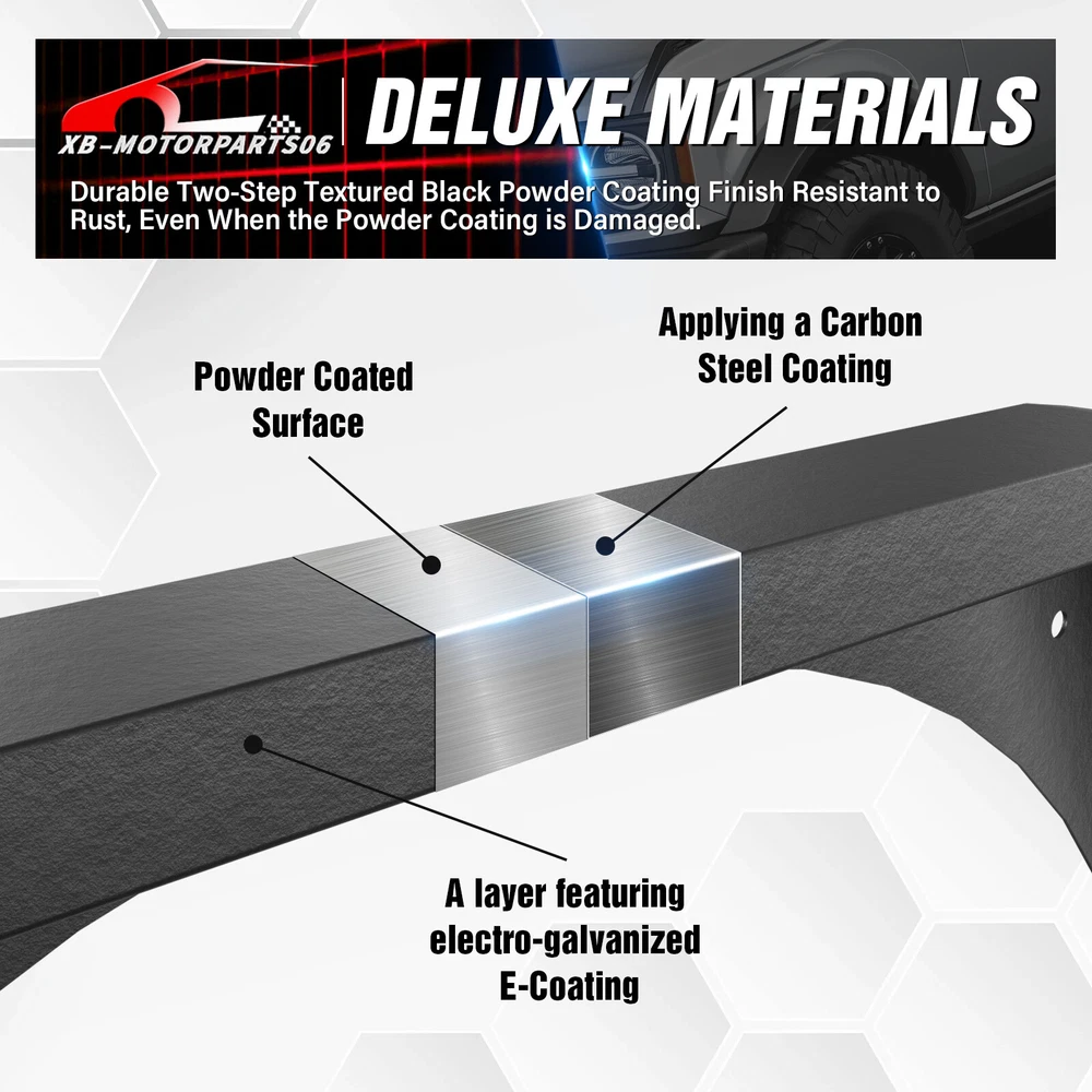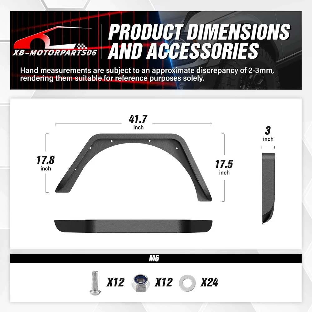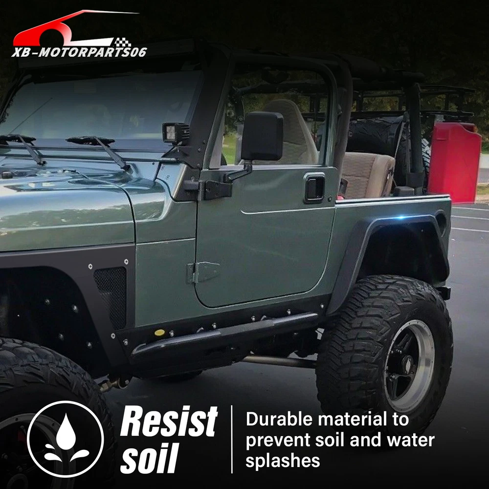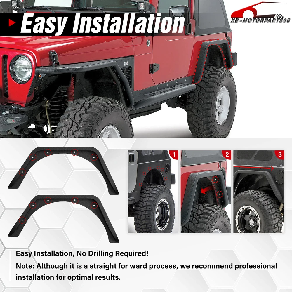 2PCS Rear Fender Flares For 1997-2006 Jeep Wrangler TJ & 2004-2006 Wrangler LJ Suitable Models : Compatible with 1997-2006 Jeep Wrangler TJ & 2004-2006 Jeep Wrangler LJ Package Includes : 2 Rear fender flares, installation instructions, and screw fittings Product Information : Product Dimensions : Please see the size picture Package Dimensions : 42.91 x 22.05 x 3.54 inches Installation mode : Bolt-on Exterior Finish : Powder Coated Placement on Vehicle : Left and Right Item Weight : 22 pounds Material : Carbon Steel Color : Black (hand measurements may have an error of 2-3 mm/0.078-0.118 in) Feature : ① Our fender flares are made from sturdy stainless steel and feature a tough black powder coating. They offer dependable protection for your wheel wells, guarding against mud, scratches, sand, and other external damages; ② It can be easily installed with simple bolts, without the need for drilling. While the process is relatively simple, we strongly advise seeking professional installation for the best possible outcome; ③Easy to install, no drilling required. Warranty Period : 1 year Payment Shipping Standard Shipping (FedEx Ground or FedEx Home Delivery). Terms of Sale Will usually ship within 3 business days of receiving cleared payment. Suitable Models : Compatible with 1997-2006 Jeep Wrangler TJ & 2004-2006 Jeep Wrangler LJ Package Includes : 2 Rear fender flares, installation instructions, and screw fittings Product Information : Product Dimensions : Please see the size picture Package Dimensions : 42.91 x 22.05 x 3.54 inches Installation mode : Bolt-on Exterior Finish : Powder Coated Placement on Vehicle : Left and Right Item Weight : 22 pounds Material : Carbon Steel Color : Black (hand measurements may have an error of 2-3 mm/0.078-0.118 in) Feature : ① Our fender flares are made from sturdy stainless steel and feature a tough black powder coating. They offer dependable protection for your wheel wells, guarding against mud, scratches, sand, and other external damages; ② It can be easily installed with simple bolts, without the need for drilling. While the process is relatively simple, we strongly advise seeking professional installation for the best possible outcome; ③Easy to install, no drilling required. Warranty Period : 1 year