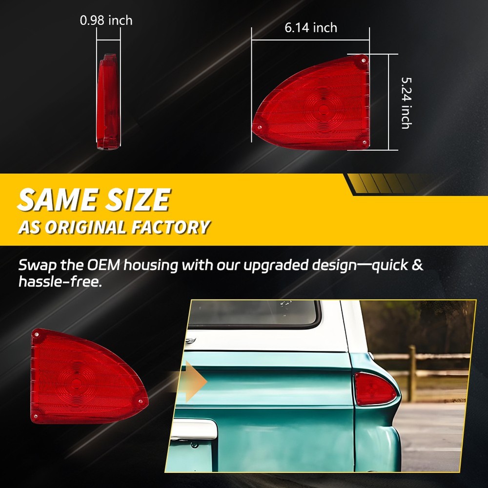 Product Detail Copyright©MotoringPlus Details This page features One Set (2 Pieces) Red Rear Tail Lights Lenses For 1960-1966 Chevrolet Panel Truck, 1960-1966 Chevrolet Suburban, 1960-1966 GMC Panel Truck & 1960-1966 GMC Suburban These lenses are made with high-quality Polymethy l Methacrylate (PMMA) and Polycarbonate (PC) plastics No modification required! Each piece is easy to install with an OEM fit, Instantly transform your car and give it a modern and trendy appearance and feel! Note: Lamp housings, Bulbs & socket adapters are NOT included Specifications: 100% Brand new and quality Lens Color: Red A complete set of tail light lenses, replacement for the driver side & passenger sides Compatible With 1 960-1966 Chevrolet Panel Truck, 1960-1966 Chevrolet Suburban, 1960-1966 GMC Panel Truck & 1960-1966 GMC Suburban Directly replace or repair your car's rear tail light lenses CE DOT SAE approved Application: For 1960-1966 Chevrolet Panel Truck For 1960-1966 Chevrolet Suburban For 1960-1966 GMC Panel Truck For 1960-1966 GMC Suburban Please make sure you have available space in your car for these lights to fit before placing or der. Package include: 2PCS Driver & Passenger side rear tail light lenses (Red Lens) Installation: Direct replacement the OEM parts without any modification needed Note: Professional installation is highly recommended! Returns Policy Shipping Policy Payment Method About US Contact Us Returns Policy Please check actual stock bulb model & housing size before purchasing replacement bulbs. Compatibility list on eBay listing is not a complete list and it is a known issue that there are errors on it. Half year warranty from the purchased date. Please contact us via ebay message before returning the defectived item. Our warranty does not extended to any products that are physically damaged or that are not under normal operating conditions as a result of misuse or improper installation on the buyers/user's part. Return items should include the original packaging and all accessories. Buyers MUST contact us for the returning address. In all cases, buyers pay shipping fees at their own cost to return products for exchange or refund. We will be responsible for the postage of replacements. Refund will be made upon receipt of the returned item. Our goal is to make sure you are a happy buyer and pleasant shopping with us. If you have any problems, please contact us immediately before leaving us any negative or neutral feedback. We understand the concerns and frustrations you might have, and will do our endeavor to resolve the issues. Please give us the opportunity to resolve any problem. Shipping Policy Item will be shipped from China / Hongkong Post by Standard International Post. All orders will be shipped to buyer's paypal shipping address within 24 hours after receiving your verified payment (Excluding Weekends and Public Holidays) International order may takes about 15-25 business day delivery time for most countries. Transactions on weekends or public holidays,item will be sent later on work time. Payment Method We accept Paypal ONLY. Unpaid transaction will be cancelled after 8 days About US Contact Us We are dedicated to providing you the best shopping experience and high quality items at a very low price. If you are satisfied with our service,Please remember to leave us 5 STAR for All Detailed Seller Ratings If you found any problem/issue of our merchandise/service,please let us know before leaving any negative feedback! Please feel free to contact us if you have any question. Any message will be replied within 24 hours. We will try our best to help! Home Payment Shipping About us Contact us Copyright©MotoringPlus Home Payment Shipping About us Contact us Store Categories Store Categories SIDE MARKER LIGHT TURN SIGNAL LIGHT TAIL BRAKE LIGHT LICENSE PLATE LIGHT DECODER OTHERS Other Product Detail Copyright©OFFKAT Why Buy From Us Why Buy From Us Details This page features One Set (2 Pieces) Red Rear Tail Lights Lenses For 1960-1966 Chevrolet Panel Truck, 1960-1966 Chevrolet Suburban, 1960-1966 GMC Panel Truck & 1960-1966 GMC Suburban These lenses are made with high-quality Polymethy l Methacrylate (PMMA) and Polycarbonate (PC) plastics No modification required! Each piece is easy to install with an OEM fit, Instantly transform your car and give it a modern and trendy appearance and feel! Note: Lamp housings, Bulbs & socket adapters are NOT included Specifications: 100% Brand new and quality Lens Color: Red A complete set of tail light lenses, replacement for the driver side & passenger sides Compatible With 1 960-1966 Chevrolet Panel Truck, 1960-1966 Chevrolet Suburban, 1960-1966 GMC Panel Truck & 1960-1966 GMC Suburban Directly replace or repair your car's rear tail light lenses CE DOT SAE approved Application: For 1960-1966 Chevrolet Panel Truck For 1960-1966 Chevrolet Suburban For 1960-1966 GMC Panel Truck For 1960-1966 GMC Suburban Please make sure you have available space in your car for these lights to fit before placing or der. Package include: 2PCS Driver & Passenger side rear tail light lenses (Red Lens) Installation: Direct replacement the OEM parts without any modification needed Note: Professional installation is highly recommended! Returns Policy Shipping Policy Payment Method About US Contact Us Returns Policy Our 60-day Satisfaction Guarantee assures our customers that they will receive all orders promptly and exactly as described. In addition, it allows customers to return new and unused products in their original factory condition for any reason within 60 days from the date of purchase. Buyers are responsible for appropriate packing, returning shipping cost, insurance and returning the item in "new" condition. Used items will not be accepted for return. We will replace the returning item with an identical item, issue a full store credit or a full refund. Our goal is to make sure you are a happy buyer and pleasant shopping with us. If you have any problem