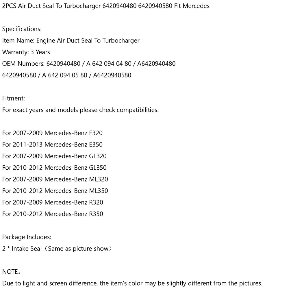 Turbo Charger Waste Gate Solenoid Valve For Sonata Tucson 2016-2018 1.6L 89.99 USD Free shipping Turbo Boost Valve Pressure Converter for Mercedes Sprinter W203 A0005450527 28.38 USD 29.87 USD Free shipping 5% off Intercooler Air Turbo Hose for Mercedes-Benz GLK 200 220 250 CDI 2045280000 Y8 73.87 USD Free shipping Turbo Electronic Actuator 28235-2F700 BV40 for Kia Sportage 2.0 CRDi 282312F670 161.87 USD Free shipping Turbo Solenoid Valve For VW Golf 5 6 Passat Sharan Tiguan 03C906283B YU 18.87 USD Free shipping Intake Charge Pipe for BMW M2 M235i 335i 435i N55 F20 F30 RWD 2012~2016 69.99 USD Free shipping Left & Right Valve Cover Gasket Set Fit Cayenne V8 Spark Plug Seals Cam Gasket._ 43.87 USD Free shipping 06K145725R 06K145725T Turbo Electric Actuator for Audi for VW Engine EA888 76.87 USD Free shipping 25819-0R011 Turbocharger Solenoid Valve for Toyota Auris Avensis 29.87 USD Free shipping New Electronic Turbo Wastegate Actuator for Honda Civic 1.5L 2016-2019 K6T52372 79.87 USD Free shipping 68445522AA 5494878RX Turbo Actuator For Dodge ISB 6.7 L Cummins Truck 2013-2018 639.99 USD Free shipping Turbocharger Solenoid Valve for Buick for Cadillac for GMC 55499323 12653327 31.87 USD Free shipping Boost Solenoid Valve for Ford Focus ST225 N75 RS MK2 Mondeo S-MAX 6M5G-9K378-AA 18.87 USD Free shipping Turbocharger Solenoid Valve For Ford Expedition Flex F-150 AA5E-9U465-AD 32.87 USD Free shipping Low Pressure Turbocharger for Mercedes-Benz W176 W246 C117 X117 X156 A2700902280 39.87 USD Free shipping Turbocharger Wastegate for BMW X5 535i 335i xDrive X6 435i X4 11658659883 99.87 USD Free shipping SAFE & SECURE SHOPPING 100% SATISFACTION GUARANTEED FAST SHIPPING 2PCS Air Duct Seal To Turbocharger 6420940480 6420940580 Fit Mercedes! Product Description 2PCS Air Duct Seal To Turbocharger 6420940480 6420940580 Fit for Mercedes Specifications: Item Name: Engine Air Duct Seal To Turbocharger Warranty: 3 Years OEM Numbers: 6420940480 / A 642 094 04 80 / A6420940480 6420940580 / A 642 094 05 80 / A6420940580 Fitment: For exact years and models please check compatibilities. For 2007-2009 for Mercedes-Benz E320 For 2011-2013 for Mercedes-Benz E350 For 2007-2009 for Mercedes-Benz GL320 For 2010-2012 for Mercedes-Benz GL350 For 2007-2009 for Mercedes-Benz ML320 For 2010-2012 for Mercedes-Benz ML350 For 2007-2009 for Mercedes-Benz R320 For 2010-2012 for Mercedes-Benz R350 Package Includes: 2 * Intake Seal(Same as picture show) NOTE: Due to light and screen difference, the item's color may be slightly different from the pictures. SHIPPING RETURNS WARRANTY ABOUT US SHIPPING ♦Every item will be inspected and packed carefully before shipping. ♦The estimated delivery time is 7-10 working days . Please note that we do not handle any orders in weekend nor holidays, all orders come during weekends or holidays will be processed in next working day. ♦Please understand that once the order is accepted by courier, it's out of our control. Shipping could be delayed by various reasons such like the weather, strike, or anything unexpected, we don't take responsibility for delay due to "severe weather". ♦If you have not received it after 10 days , please contact us first, and then we will arrange to resend or refund to you asap. ♦Buyer is responsibility to the accuracy of eBay delivery address, and pay attention to the delivery updating(we guarantee all orders can be tracked online). Once the package forced to return to us due to wrong address or attempt delivery but failed over two times, we have no choice but ask buyer to pay second shipping charge, not to mention the terrible delay it caused. ♦Please be aware that your order could be putted on porch or at the front of door when nobody at home, in very rare instances, package could be stolen, we are sorry that the courier and us do not take any responsibility, as long as it's showing "delivered" in system, the only help we can offer is provide prooves when police need it. RETURNS ♦We offer 60 days return window , it means you could return the order freely in 60 days of purchase. Please note that it requires that item is unused/uninstalled/unmodified, as the same condition as it's delivered. Though, we hope every buyer could inspect the part as quick as you can, to confirm if the part is the right one you need and make an early decision. In case the item arrive directly to workshop, please tell merchanic to inspect it clearly before set it up so hurry. ♦If you have a defective item which you want to return or exchange, please contact us after you receive the package. We will refund or make a replacement depends on your requirement. ♦Generally, every refund request should have the purchased item returned to us. We strong recommend the return procedure inside ebay, it helps both seller and buyer process return smoothly. In cases buyer can provide photos/pictures as proof, showing the item is dead/malfunctioning, we fully trust our customers and will refund directly without ask for the item back. ♦All refunds will be issued once the item arrives at our warehouse. The refund will then be credited back using the same method as when your initial order was made. The processing time typical takes 3-5 working days. However, this can depend on your financial institution. ♦We do not accept returns if the item(s) has been used/installed, working properly but buyer decided to return, or has been modified for some reason after buyer have received the item(s). WARRANTY ♦ 60 Day Money Back Guarantee ♦The warranty does not extend to normal wear and tear of products; products damaged due to environmental conditions including rain, snow, hail, salt, or natural disasters; products damaged due to accident or collision; or product damage caused by other faulty parts. ♦All items must be in their original condition and must not be damaged due to incorrect installation upon return. Products damaged as a result of abuse, misuse, improper repairs or maintenance, impro