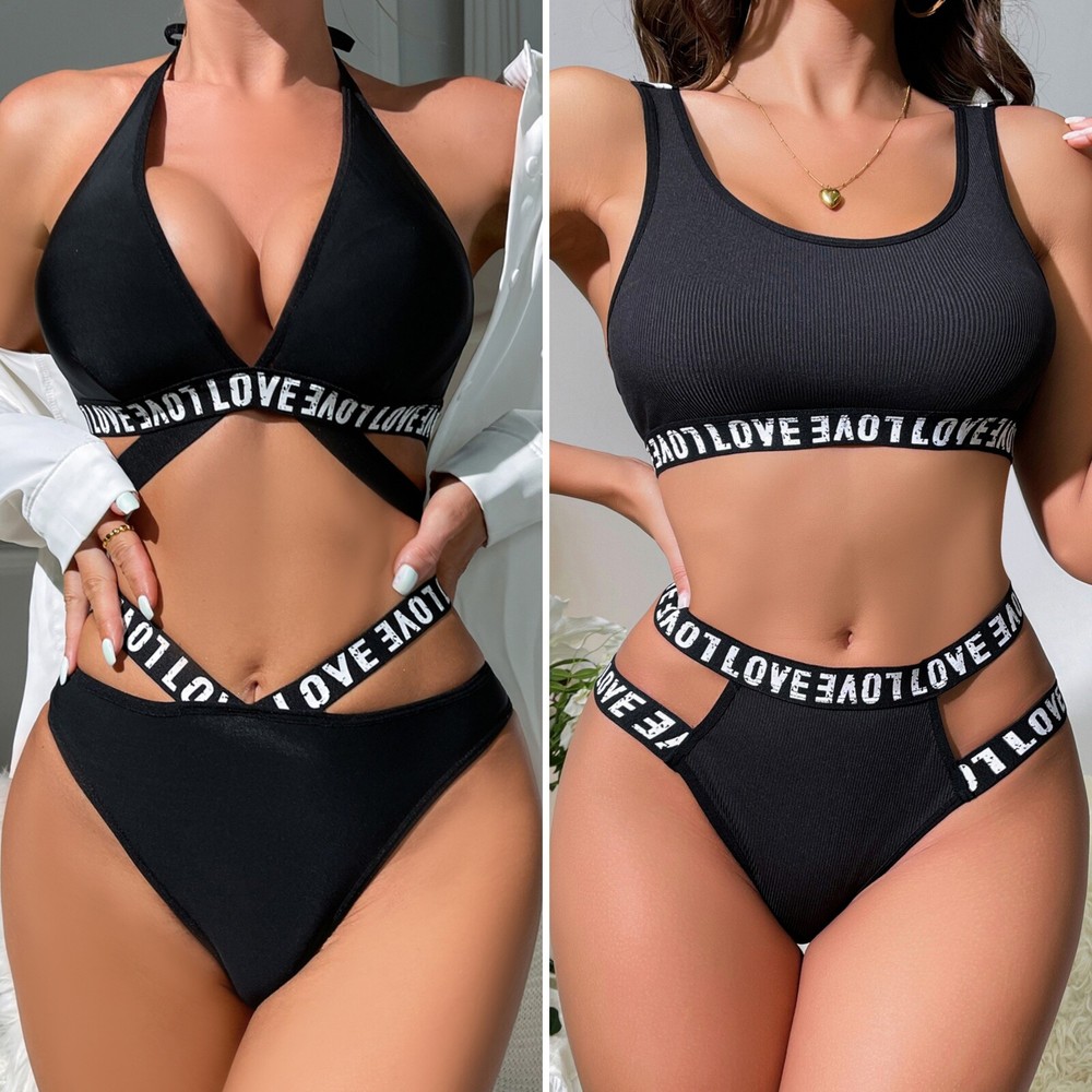 About this item: 2 piece letter tape lingerie set for women Fabric: Fabric is very stretch, and it's soft and comfortable Feature: 2 piece set, letter print, low rise, cheeky panty, womens lingerie, fashionable Occasion: Underwear, nightwear. Suit for wedding night, honeymoon, valentine's day, everyday, etc