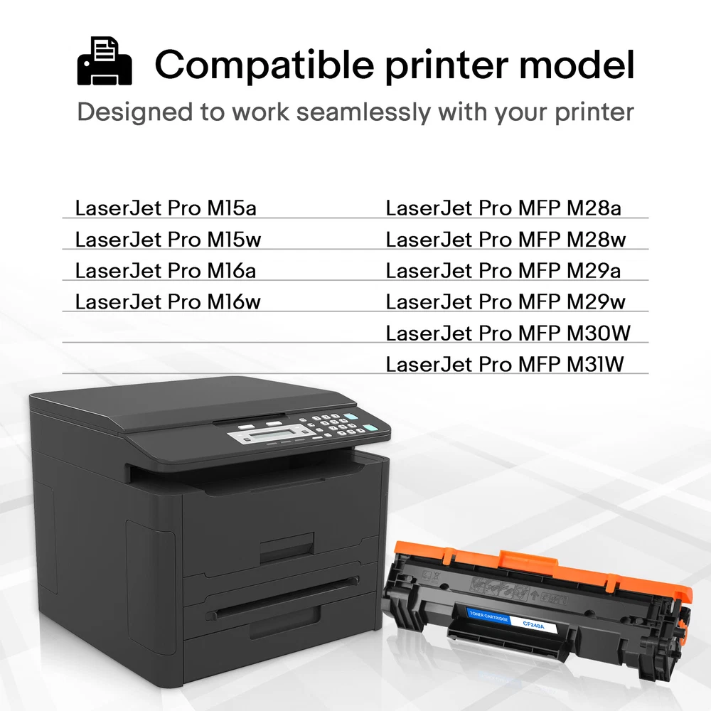 Condition: new It is certified with ISO 9001 and ISO 14001 Item:Brand New Premium Compatible For HP CF248A 48A Toner Cartridge Model:CF248A Color:Black Shelf Life:2 Years Printed Pages:1,000 pages at 5% coverage (Actual toner yield varies with usage, graphics printed and environmental conditions.) Compatible printer list: LaserJet Pro M15a LaserJet Pro M15w LaserJet Pro M16a LaserJet Pro M16w LaserJet Pro MFP M28a LaserJet Pro MFP M28w LaserJet Pro MFP M29a LaserJet Pro MFP M29w 2PK Black CF248A 48A Toner Cartridge for HP LaserJet Pro MFP M28w M29w M28a INK Model CF248A Compatible Brand HP Color Black Page Yield 1,000 pages at 5% Coverage (4A Paper) Condition 100% Brand New Provide the same performance and reliability as genuine Cartridges. Meeting standards of ISO 9001&14001 with premium sub-assemblies. High-quality printing with every document. Easy installation and never hurt your printer. 100% customer satisfaction within 30 days. Compatible for Printers Listed Below: LaserJet Pro M15a LaserJet Pro MFP M28a LaserJet Pro M15w LaserJet Pro MFP M28w LaserJet Pro M16a LaserJet Pro MFP M29a LaserJet Pro M16w LaserJet Pro MFP M29w LaserJet Pro MFP M30w LaserJet Pro MFP M31w Fast and Safe Shipping Reliability on the Move, Safety in Transportation. Print Effects Clear / Sharp / Vivid At Your Service Anytime Available to help you anytime. Please contact us through eBay messages.