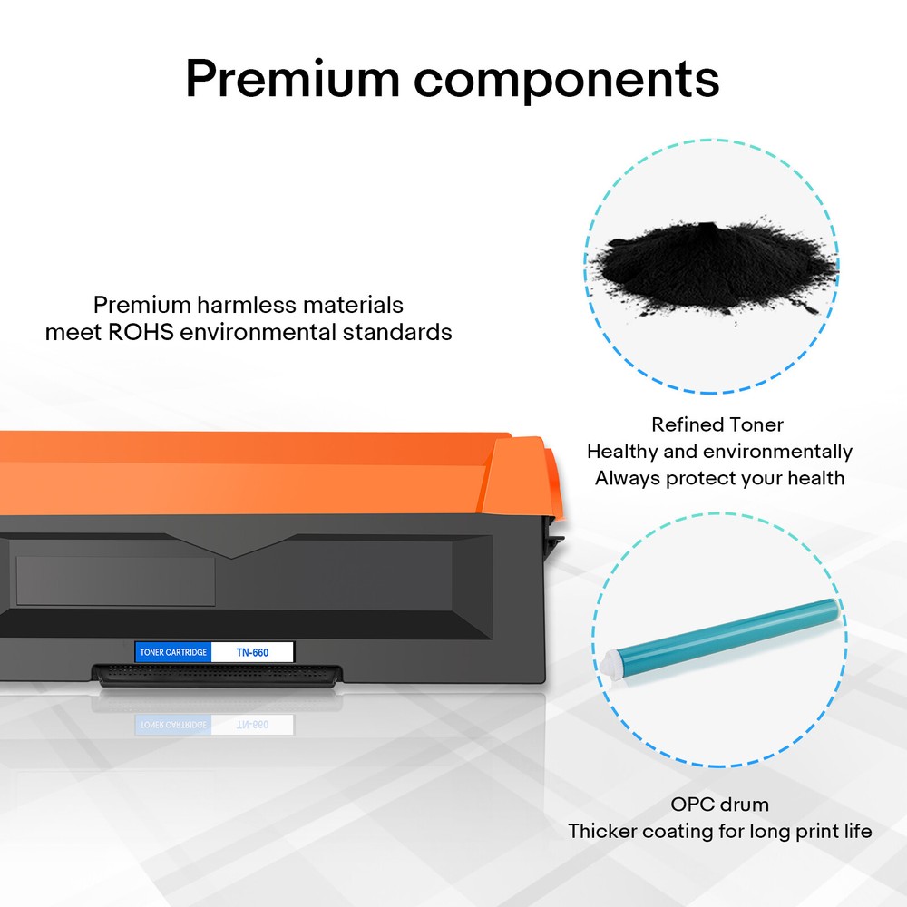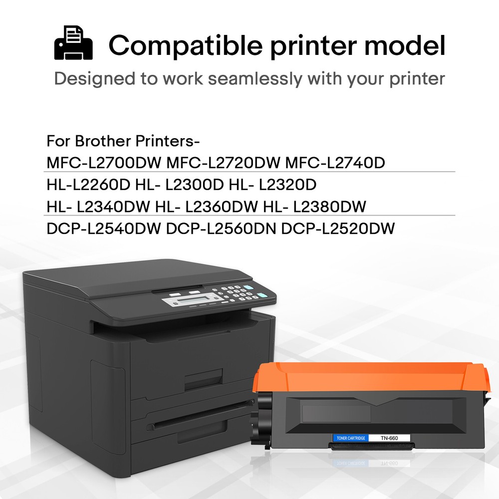 Qualification certificate: All cartridges are manufactured in an ISO 9001&ISO 14001 certified facility. Model: TN660/TN630 Color:Black Printed Pages:2,600 Pages at 5% Coverage, Actual toner yield varies with usage, graphics printed and environmental conditions. Shelf Life:2 Years Compatible Printer models Lists: Brother HL Series Printers,Brother HL-L2300D,Brother HL-L2305W,Brother HL-L2315DW,Brother HL-L2320D,Brother HL-L2340DW,Brother HL-L2360DW, Brother HL-L2380DW,Brother DCP Series Printers,Brother DCP-L2520DW,Brother DCP-L2540DW,Brother MFC Series Printers,Brother MFC-L2680W, Brother MFC-L2685DW,Brother MFC-L2700DW,Brother MFC-L2705DW,Brother MFC-L2707DW,Brother MFC-L2720DW,Brother MFC-L2740DW You printer model may not be listed here, please contact us to check for you. 2PK Toner Cartridge TN660 for Brother HL-L2300D HL-L2305W HL-L2315DW HL-L2320D Compatible Brand Brother Model TN660/TN630 Color Black Page Yield 2,600 pages at 5% Coverage (4A Paper) Condition Brand New ▲ Provide the same performance and reliability as genuine Cartridges. ▲ Meeting standards of ISO 9001&14001 with premium sub-assemblies. ▲ High-quality printing with every document. ▲ Easy installation and never hurt your printer. ▲ 100% customer satisfaction within 30 days. Compatible for Printers Listed Below: Brother DCP Printer Series Brother DCP-L2520DW, DCP-L2540DW Brother HL Printer Series Brother HL-L2300D HL-L2305W HL-L2320D HL-L2340DW HL-L2360DW HL-L2380DW Brother MFC Printer Series Brother MFC-L2680W MFC-L2700DW MFC-L2705DW MFC-L2720DW MFC-L2740DW Fast and Safe Shipping Reliability on the Move, Safety in Transportation. Print Effects Clear / Sharp / Vivid At Your Service Anytime Available to help you anytime. Please contact us through eBay messages.