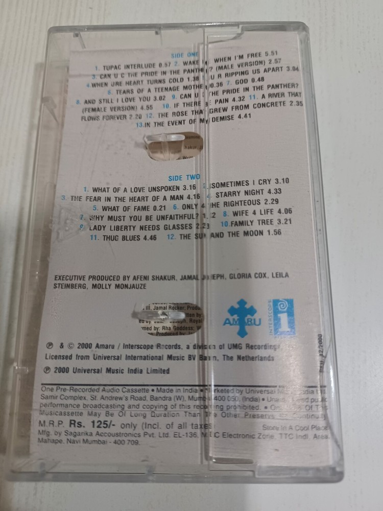 Case Condition: Very Good Plus (VG+) Genre: Rap & Hip-Hop Seller Notes: “Used Audio Cassette Tape” Country of Origin: India Release Title: etc Inlay Condition: Very Good Plus (VG+) Format: Cassette Style: Hip-Hop Cassette Condition: Very Good Plus (VG+) Artist: 2Pac