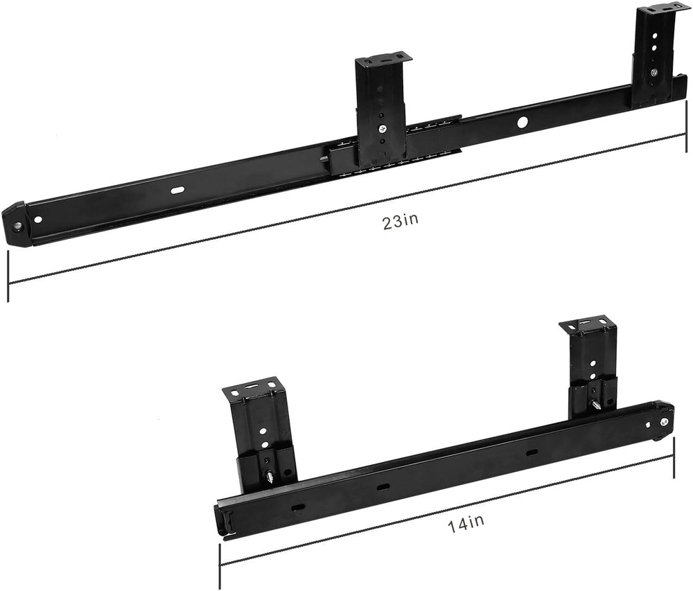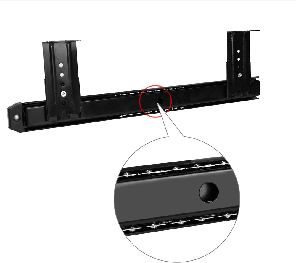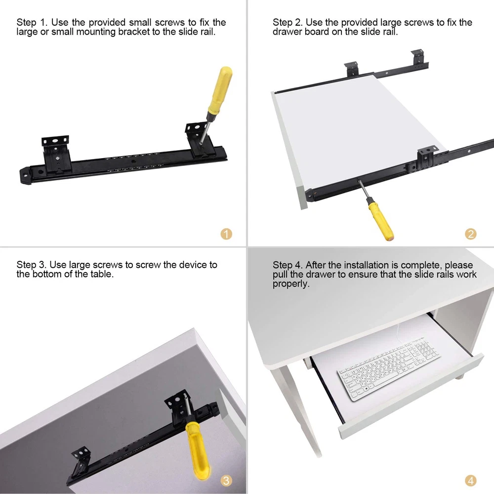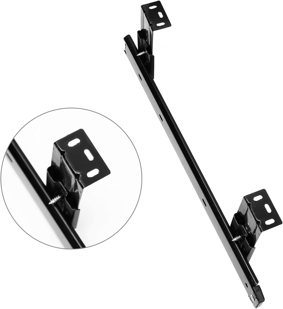 MATERIAL - This keyboard slide is made of heavy duty cold rolled steel with black powder coat finish, which ensures high strength and weight loading capacity, as well as long lasting performance. The maximum loading capacity of each pair of keyboard slide is 22 lbs. UNIQUE DESIGN - Steel ball bearings and cushion pads allow for smooth sliding and quiet performance, as well as effectively reducing the damage caused by collision while pulling in and out. 4 adjustable holes allow for height adjustment as per your requirement. EASY TO INSTALL - This 14inch keyboard slide can be easily installed with only a screwdriver to fasten the screw. The package includes 2 keyboard slides, 8 mounting brackets and 16 screws. WIDELY USED - This metal drawer slide can be applied to your office desk, computer keyboard tray and drawer, cabinet, furniture, kitchen and garage. Heavy Duty Ball Bearing Slides Product Description Heavy Duty Ball Bearing Slides Computer Drawer Tray Accessories Cabinet Furniture Rails Rack · Made of heavy duty cold rolled steel with black powder coat finish for high strength and loading capacity · Equipped with steel ball bearings and cushion pads for smooth sliding and noise and collision reduction · Comes with 4 adjustable holes for height adjustment · Multi-functional to be applied to desk, drawer, cabinet, furniture and so on