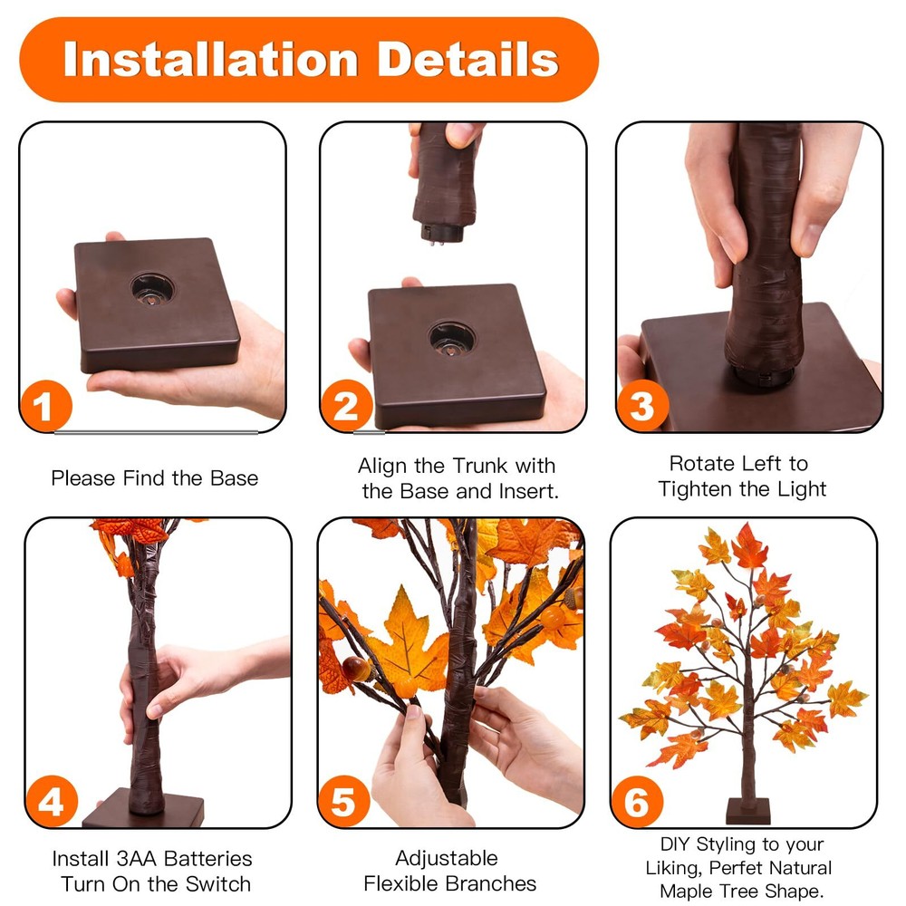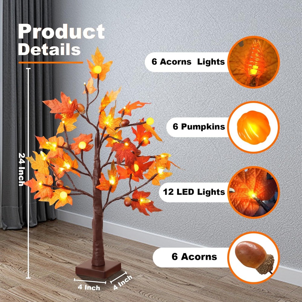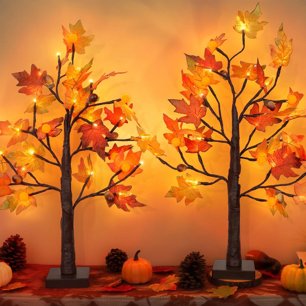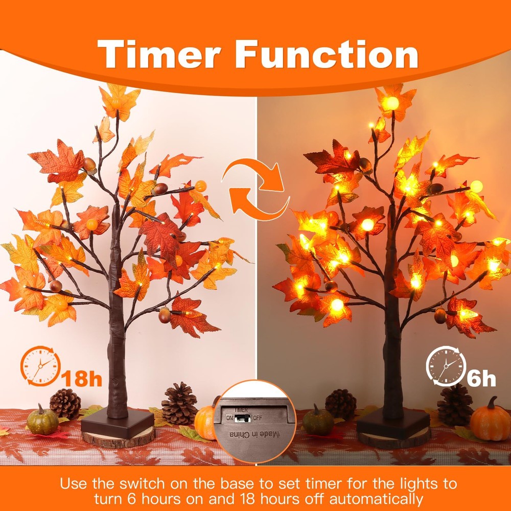 [ Package Include ]: 2 Pack 24 Inch Maple Fall Tree Table Decorations. Each Lighted Maple Tree is equipped with 24 LED lights, 6 acorns, 6 pumpkins & 6 acorns shaped LED, and 24 maple leaf. The acorn and pumpkin shaped LEDs prelit on the branches make the small maple trees full of life, bringing a stronger fall atmosphere to your home. [ Fall Maple Tree with Timer ]: You can use the on/timer/off switches of the battery box base to turn the lights on/off and set a timer, the Fall tree lights will be 6 hours on and 18 hours off per day. [ Adjustable Branches Maple Tree ]: Customize the branches into any shape you like to suit your decorating needs. Easy to install and move, this tree can be reused. The trunk and branches are wrapped in electrical tape for safe use. [ Fall Thanksgiving Decor Home Table Tree ]: Perfect Fall tree decorations for autumn themed decoration, festival, Thanksgiving party. Ideal for home, tabletop, mantel, fireplace, office room, living room, kitchen, balcony, dining table, window and more. [ Battery Powered ]: The Fall tree decor powered by 3AA batteries (Note: Batteries are not included), suitable for any scenario and location. No more worrying about power outlet.
