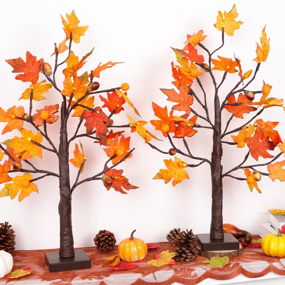 2Pack 24 Inch Prelit Maple Fall Tree Decor with 48 LED Timer Battery Lights
