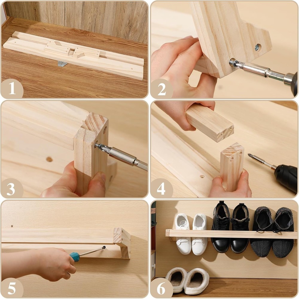 This wall-mounted shoe rack is a game-changer for small spaces! The rustic wood design adds charm while holding 3-4 pairs securely. Perfect for sneakers, heels, or sandals, it keeps everything tidy without taking up floor space. The sturdy construction feels durable, and installation was a breeze. Love how it turns shoe clutter into neat organization while looking stylish on my wall!