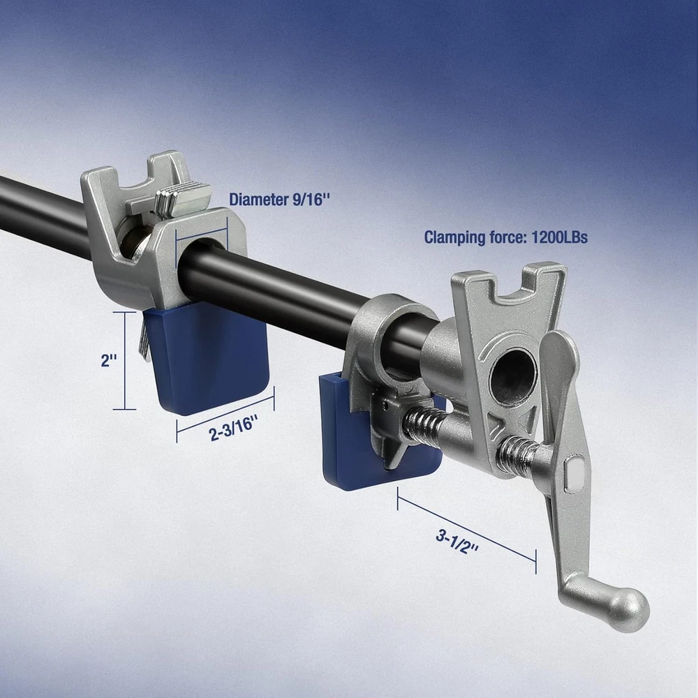 Lightweight Construction: The pipe clamps feature lightweight construction by the application of high strength aluminium alloy, 50% lighter than conventional clamps made of die casting iron Firm & Stable Clamping: With a high-pressure spring and four carbon steel sheets, the clamp makes firm & stable clamping and can hold pipes tightly to fix them in place as you need Ergonomic Handle: The handle features ergonomic design providing smooth rotary, comfortable hand feeling, easier clamping and thus reduce hand fatique Long-lasting Life: The thickened thread screw rod made of carbon steel is wear-resistant and the TPU protective cover can lessen damage to the clamps, thus provides longer service life Practical Application: The tube clamp's outer diameter is 1.05 in, which is suitable for inner diameter 3/4 in balck pipes and work as an ideal helper in woodworking and metalworking projects. Just slide the pipe clamp through any length 3/4 in. pipe to hold wood in place for gluing and drilling NOTE: 2 rings are used on both ends of the tube to prevent clamps from slipping off. Product Description Ergonomic Handle & Thickened Screw Rod Provide smooth rotary, comfortable hand feeling, easier clamping and thus reduce hand fatique TPU Protective Cover & Larger Contact Area Lessen damage to the clamps, thus provides longer service life High-pressure Spring & Carbon Steel Sheets Make firm & stable clamping and can hold pipes tightly to fix them in place as you need