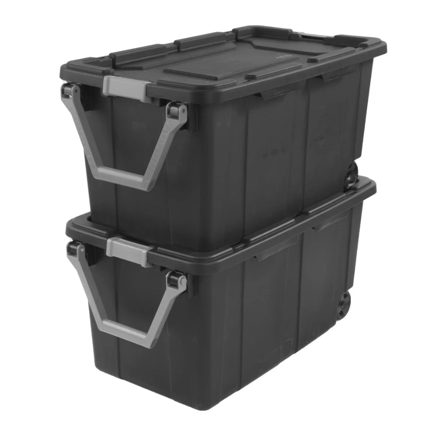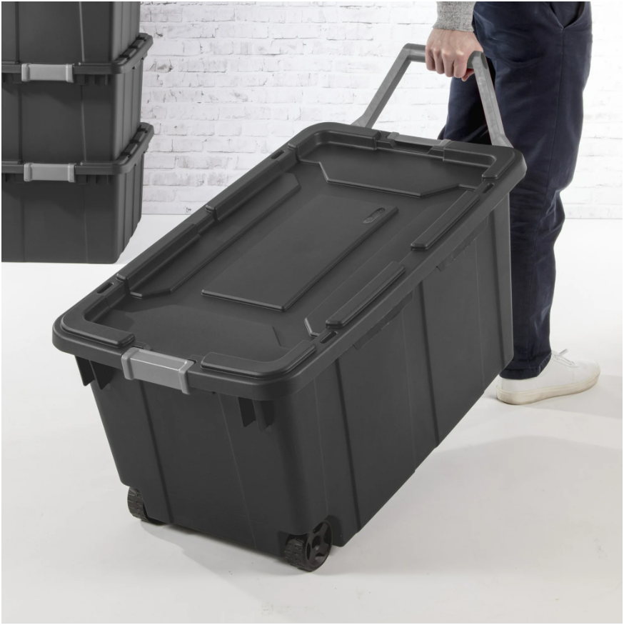 WE DO NOT SHIP TO GLOBAL SHIPPING SERVICE WAREHOUSE ADDRESS LIKE BM CARGO, SHIP 7, 8400 NW AND SO ON WE DON’T DO GLOBAL SHIPPING SERVICE We don’t ship items to PO box addresses, (2-Pack) 40 Gallon Plastic Storage Bin on Wheels with Locking Lid, Dark Gray Free Shipping – Free Returns – Money Back Guarantee Description Bring order to garages, basements, and attics with the heavy-duty design and unique features of Sterilite’s Industrial Tote line. Be confident that stored items will stay protected in the durable 40 Gallon Wheeled Industrial Tote, the ideal portable solution for storing larger and heavier supplies. The grooved lid design and keyholes provide options for tie-downs to simplify transportation, and keep totes in place in the back of a pick-up truck. The ergonomic handle rotates up for easy pulling while the large wheels and metal axle allow for rolling over rough surfaces. The innovative drip-resistant lid provides maximum protection against items getting wet, while the tight-fit lid keeps items contained. The robust latches offer extra security that the lid will stay attached to the base, and the textured surface makes for a sure grip when carrying. The deep recessed lids provide stability when stacking for efficient use of storage space. Channeled walls provide added strength and help to resist crushing under heavier loads. The 40 Gallon Wheeled Industrial Tote is ideal for more active storage needs, store camping equipment, sports gear, tools and workshop supplies, and other bulky items. The overall assembled dimensions of this item are 36 3/4" L x 21 3/8" W x 18" H. Sterilite Plastic 40 Gal. Wheeled Industrial Tote Adult Flat Gray Outside Dimensions: 36 3/4" x 21 3/8" x 18" Interior Dimensions at bottom: 30 1/2" x 16" x 17 1/8" Heavy-duty construction with robust non-slip grip latches Ergonomic handle rotates up for easy pulling and large wheels with metal axle allow for rolling over rough surfaces Deep recessed lids offer secure stacking capabilities helping to maximize available storage space Tight fit drip-resistant lid provides maximum protection against items getting wet BPA-free and phthalate-free If you have any problem with product, PLEASE contact me directly via eBay message, Your satisfaction is paramount.Please do not open case. It is very harmful to my store.Thank you so much!